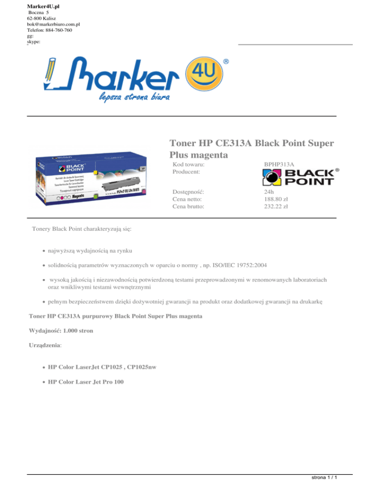 Marker4U.pl Boczna 5 62-800 Kalisz [email protected] Telefon: 884-760-760 gg: skype: Toner HP CE313A Black Point Super Plus magenta Kod towaru: Producent: BPHP313A Dostępność: Cena netto: Cena brutto: 24h 188.80 zł 232.22 zł Tonery Black Point charakteryzują się: najwyższą wydajnością na rynku solidnością parametrów wyznaczonych w oparciu o normy , np. ISO/IEC 19752:2004 wysoką jakością i niezawodnością potwierdzoną testami przeprowadzonymi w renomowanych laboratoriach oraz wnikliwymi testami wewnętrznymi pełnym bezpieczeństwem dzięki dożywotniej gwarancji na produkt oraz dodatkowej gwarancji na drukarkę Toner HP CE313A purpurowy Black Point Super Plus magenta Wydajność: 1.000 stron Urządzenia: HP Color LaserJet CP1025 , CP1025nw HP Color Laser Jet Pro 100 strona 1 / 1 Powered by TCPDF (www.tcpdf.org)