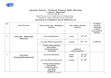 Informacje Dotyczące Udzielanych Świadczeń Opieki Zdrowotnej w zakresie Diagnostyki NOVUM -MED Sp. z o.o. Szpital Powiatowy im. dr Adama Gacy i dr Józefa Łaskiego Niepubliczny Zakład Opieki Zdrowotnej w Więcborku mieszczącej się w budynkach przy ul. Mickiewicza 26 Lp. 1. Nazwa Pracowni Imię i nazwisko osób udzielających świadczeń Pracownia Diagnostyki Obrazowej lek. Leszek Marchocki wtorek 1800 -1930 dr n. med. Marek Grzegorzewski czwartek 2030 – 2130 Technicy elektroradiologii Maria Delikat Ewelina Kwasigroch Anna Słoma 2 Pracownia Tomografii Komputerowej Dni i godziny udzielania świadczeń Nr telefonu rejestracji i informacji w zakresie poszczególnych Pracowni 52 3896 229 całodobowo wg harmonogramu lek. Leszek Marchocki wtorek piątek 1200 -1600 800 -1200 dr n. med. Marek Grzegorzewski czwartek 1530 -2030 Technicy elektroradiologii Maria Delikat Ewelina Kwasigroch Anna Słoma Pielęgniarki Aktualizacja 31-10-2014r. 1 Marlena Świderska Joanna Skowron Ewa Iwan 3. 4. 5. Pracownia Ultrasonografii lek. Leszek Marchocki wtorek 1600 - 1800 52 3896 222 52 3896 223 dr n. med. Marek Grzegorzewski czwartek 1200 – 1530 lek. Ryszard Górski lek. Marek Dziedzic lek. Jacek Maluchnik poniedziałek wtorek środa 700 - 1100 piel. Zofia Ornass pn, wt, śr. 700 - 1500 Pracownia Spirometrii 800 - 900 piel. Justyna Szmidt od poniedziałku do piątku Pracownia Nieinwazyjnej Diagnostyki Kardiologicznej lek. Dariusz Wiśniewski lek. Anna Gełdon piel. Justyna Szmidt Pracownia Endoskopii 52 3896 222 52 3896 223 52 3896 217 52 3896 206 1200- 1300 6 7. Pracownia Diagnostyki Laboratoryjnej mgr Alicja Wiśniewska mgr Andrzej Dryll mgr Dagmara Starzecka tech. anal. med. Aleksandra Szlagowska tech. anal. med. Małgorzata Pawłowska tech. chem. Maria Borowicz Aktualizacja 31-10-2014r. poniedziałek wtorek środa czwartek piątek 1030- 1200 dla pacjentów ambulatoryjnych od poniedziałku do piątku 700 - 1100 W nagłych przypadkach 52 3896 227 700 - 1800 w soboty, niedziele i święta 700 - 1900 2 całodobowo dla oddziałów Szpitala Zasady zapisów na badania oraz informację o moŜliwości i sposobie zapisywania się na listę oczekujących na świadczenie zdrowotne uzyskać moŜna pod nr telefonu 52 3896 229, 52 3896 222, 52 3896 217, 52 3896 206 Rejestracji pacjentów do w/w Pracowni dokonuje się w dniach od poniedziałku do piątku w godzinach od 730 – 1430 na podstawie zgłoszenia: osobistego, telefonicznego lub za pośrednictwem osoby trzeciej lek. Ryszard Górski (Imię i nazwisko osoby kierującej pracą Komórek Organizacyjnych) Numery telefonów alarmowych ratownictwa medycznego: „112” „999” Tryb składania skarg i wniosków: Pełnomocnik do spraw Praw Pacjenta: 1. przy NOVUM -MED Sp. z o.o.- Szpital Powiatowy NZOZ w Więcborku lek. Dariusz Wiśniewski ul. Mickiewicza 26, 89-410 Więcbork (pokój lekarzy w Oddziale Chorób Wewnętrznych z Pododdziałem Intensywnego Nadzoru Kardiologicznego Szpitala Powiatowego NZOZ w Więcborku) przyjmuje po uprzednim umówieniu telefonicznym nr tel. 52 3896 205 2. przy Oddziale Narodowego Funduszu Zdrowia w siedzibie Oddziału w Bydgoszczy, przy ul. J. Słowackiego 3, p. nr 6, nr tel. 52 32-52-737, urzęduje codziennie od godz. 800 do 1600 e-mail: [email protected] -Pani Mariola Tuszyńska 3. przy Ministrze Zdrowia - bezpłatna infolinia czynna od poniedziałku do piątku od godz. 900 do godz. 2100 nr tel. 0 800- 190-590 Opracowanie i aktualizacja: POA Więcbork, 31-10-2014r. Aktualizacja 31-10-2014r. 3