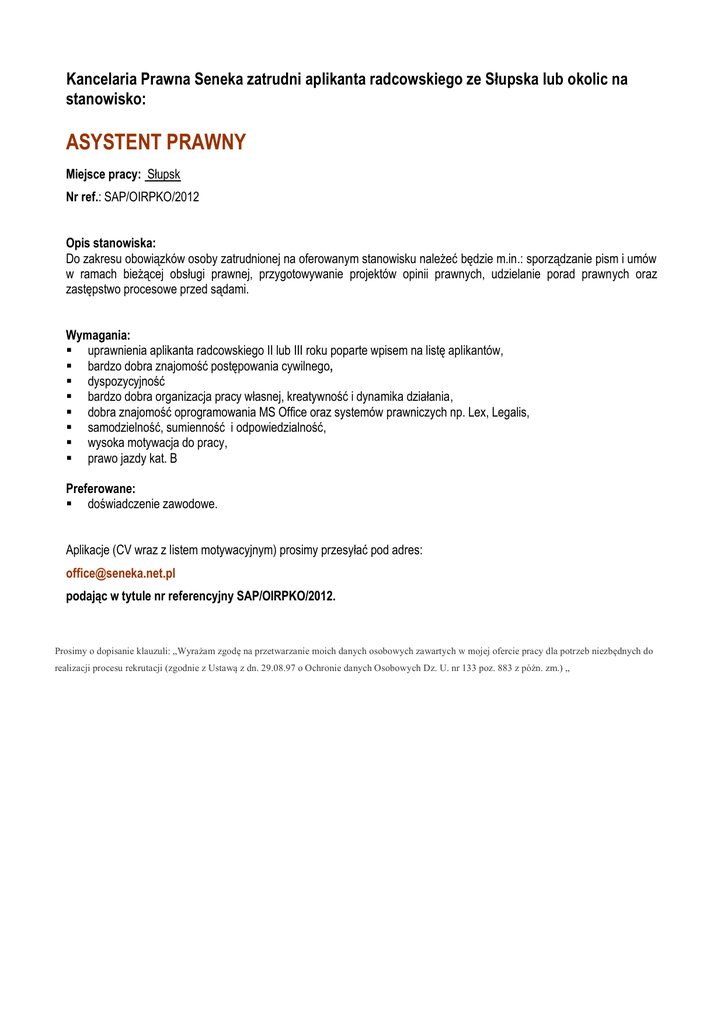Kancelaria Prawna Seneka zatrudni aplikanta radcowskiego ze Słupska lub okolic na stanowisko: ASYSTENT PRAWNY Miejsce pracy: Słupsk Nr ref.: SAP/OIRPKO/2012 Opis stanowiska: Do zakresu obowiązków osoby zatrudnionej na oferowanym stanowisku należeć będzie m.in.: sporządzanie pism i umów w ramach bieżącej obsługi prawnej, przygotowywanie projektów opinii prawnych, udzielanie porad prawnych oraz zastępstwo procesowe przed sądami. Wymagania: uprawnienia aplikanta radcowskiego II lub III roku poparte wpisem na listę aplikantów, bardzo dobra znajomość postępowania cywilnego, dyspozycyjność bardzo dobra organizacja pracy własnej, kreatywność i dynamika działania, dobra znajomość oprogramowania MS Office oraz systemów prawniczych np. Lex, Legalis, samodzielność, sumienność i odpowiedzialność, wysoka motywacja do pracy, prawo jazdy kat. B Preferowane: doświadczenie zawodowe. Aplikacje (CV wraz z listem motywacyjnym) prosimy przesyłać pod adres: [email protected] podając w tytule nr referencyjny SAP/OIRPKO/2012. Prosimy o dopisanie klauzuli: „Wyrażam zgodę na przetwarzanie moich danych osobowych zawartych w mojej ofercie pracy dla potrzeb niezbędnych do realizacji procesu rekrutacji (zgodnie z Ustawą z dn. 29.08.97 o Ochronie danych Osobowych Dz. U. nr 133 poz. 883 z póżn. zm.) „