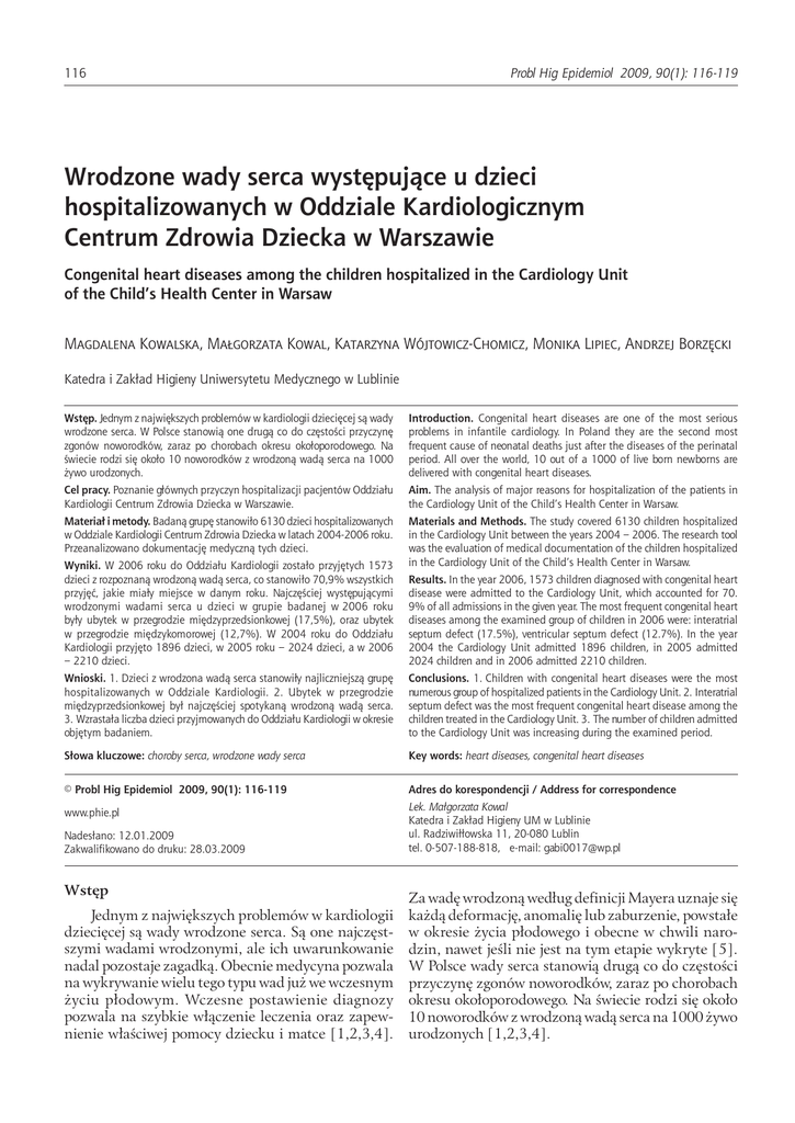 116 Probl Hig Epidemiol 2009, 90(1): 116-119 Wrodzone wady serca występujące u dzieci hospitalizowanych w Oddziale Kardiologicznym Centrum Zdrowia Dziecka w Warszawie Congenital heart diseases among the children hospitalized in the Cardiology Unit of the Child’s Health Center in Warsaw Magdalena Kowalska, Małgorzata Kowal, Katarzyna Wójtowicz-Chomicz, Monika Lipiec, Andrzej Borzęcki Katedra i Zakład Higieny Uniwersytetu Medycznego w Lublinie Wstęp. Jednym z największych problemów w kardiologii dziecięcej są wady wrodzone serca. W Polsce stanowią one drugą co do częstości przyczynę zgonów noworodków, zaraz po chorobach okresu okołoporodowego. Na świecie rodzi się około 10 noworodków z wrodzoną wadą serca na 1000 żywo urodzonych. Introduction. Congenital heart diseases are one of the most serious problems in infantile cardiology. In Poland they are the second most frequent cause of neonatal deaths just after the diseases of the perinatal period. All over the world, 10 out of a 1000 of live born newborns are delivered with congenital heart diseases. Cel pracy. Poznanie głównych przyczyn hospitalizacji pacjentów Oddziału Kardiologii Centrum Zdrowia Dziecka w Warszawie. Aim. The analysis of major reasons for hospitalization of the patients in the Cardiology Unit of the Child’s Health Center in Warsaw. Materiał i metody. Badaną grupę stanowiło 6130 dzieci hospitalizowanych w Oddziale Kardiologii Centrum Zdrowia Dziecka w latach 2004-2006 roku. Przeanalizowano dokumentację medyczną tych dzieci. Materials and Methods. The study covered 6130 children hospitalized in the Cardiology Unit between the years 2004 – 2006. The research tool was the evaluation of medical documentation of the children hospitalized in the Cardiology Unit of the Child’s Health Center in Warsaw. Wyniki. W 2006 roku do Oddziału Kardiologii zostało przyjętych 1573 dzieci z rozpoznaną wrodzoną wadą serca, co stanowiło 70,9% wszystkich przyjęć, jakie miały miejsce w danym roku. Najczęściej występującymi wrodzonymi wadami serca u dzieci w grupie badanej w 2006 roku były ubytek w przegrodzie międzyprzedsionkowej (17,5%), oraz ubytek w przegrodzie międzykomorowej (12,7%). W 2004 roku do Oddziału Kardiologii przyjęto 1896 dzieci, w 2005 roku – 2024 dzieci, a w 2006 – 2210 dzieci. Results. In the year 2006, 1573 children diagnosed with congenital heart disease were admitted to the Cardiology Unit, which accounted for 70. 9% of all admissions in the given year. The most frequent congenital heart diseases among the examined group of children in 2006 were: interatrial septum defect (17.5%), ventricular septum defect (12.7%). In the year 2004 the Cardiology Unit admitted 1896 children, in 2005 admitted 2024 children and in 2006 admitted 2210 children. Wnioski. 1. Dzieci z wrodzona wadą serca stanowiły najliczniejszą grupę hospitalizowanych w Oddziale Kardiologii. 2. Ubytek w przegrodzie międzyprzedsionkowej był najczęściej spotykaną wrodzoną wadą serca. 3. Wzrastała liczba dzieci przyjmowanych do Oddziału Kardiologii w okresie objętym badaniem. Conclusions. 1. Children with congenital heart diseases were the most numerous group of hospitalized patients in the Cardiology Unit. 2. Interatrial septum defect was the most frequent congenital heart disease among the children treated in the Cardiology Unit. 3. The number of children admitted to the Cardiology Unit was increasing during the examined period. Słowa kluczowe: choroby serca, wrodzone wady serca Key words: heart diseases, congenital heart diseases © Probl Hig Epidemiol 2009, 90(1): 116-119 Adres do korespondencji / Address for correspondence www.phie.pl Lek. Małgorzata Kowal Katedra i Zakład Higieny UM w Lublinie ul. Radziwiłłowska 11, 20-080 Lublin tel. 0-507-188-818, e-mail: [email protected] Nadesłano: 12.01.2009 Zakwalifikowano do druku: 28.03.2009 Wstęp Jednym z największych problemów w kardiologii dziecięcej są wady wrodzone serca. Są one najczęstszymi wadami wrodzonymi, ale ich uwarunkowanie nadal pozostaje zagadką. Obecnie medycyna pozwala na wykrywanie wielu tego typu wad już we wczesnym życiu płodowym. Wczesne postawienie diagnozy pozwala na szybkie włączenie leczenia oraz zapewnienie właściwej pomocy dziecku i matce [1,2,3,4]. Za wadę wrodzoną według definicji Mayera uznaje się każdą deformację, anomalię lub zaburzenie, powstałe w okresie życia płodowego i obecne w chwili narodzin, nawet jeśli nie jest na tym etapie wykryte [5]. W Polsce wady serca stanowią drugą co do częstości przyczynę zgonów noworodków, zaraz po chorobach okresu okołoporodowego. Na świecie rodzi się około 10 noworodków z wrodzoną wadą serca na 1000 żywo urodzonych [1,2,3,4]. Kowalska M i wsp. Wrodzone wady serca występujące u dzieci hospitalizowanych w Oddziale Kardiologicznym CZD ... Cel pracy Celem pracy było poznanie głównych przyczyn hospitalizacji pacjentów Oddziału Kardiologii Centrum Zdrowia Dziecka w Warszawie. Materiał i metody Badaną grupę stanowiło 6130 dzieci hospitalizowanych w Oddziale Kardiologii Centrum Zdrowia Dziecka w Warszawie w latach 2004-2006 roku. Przeanalizowano dokumentację szpitalną tych dzieci. Wyniki badań W 2004 roku do Oddziału Kardiologii przyjęto 1896 dzieci, w 2005 roku – 2024 dzieci, a w 2006 – 2210 dzieci. W 2006 roku do Oddziału Kardiologii zostało przyjętych 1573 dzieci (730 dziewcząt oraz 843 chłopców)z rozpoznaną wrodzoną wadą serca, co stanowiło 70,9% wszystkich przyjęć, jakie miały miejsce w danym roku. Kolejną grupą dzieci hospitalizowanych w Centrum Zdrowia są dzieci u których występują zaburzenia rytmu serca pod różną postacią. W 2006 roku przyjęto do Oddziału 424 dzieci z tego rodzaju problemem, co stanowiło około 19,3% wszystkich przyjęć. Inne schorzenia układu krążenia stanowią 6,2% wszystkich przypadków. Jest to duża grupa schorzeń do których zaliczyć możemy między in