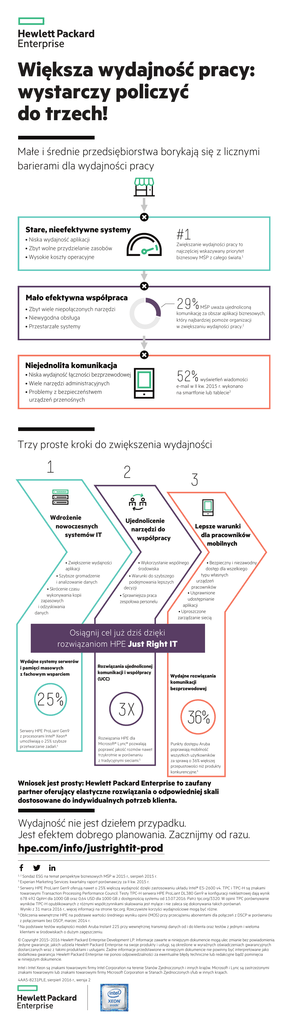 Większa wydajność pracy: wystarczy policzyć do trzech! Małe i średnie przedsiębiorstwa borykają się z licznymi barierami dla wydajności pracy Stare, nieefektywne systemy #1 • Niska wydajność aplikacji • Zbyt wolne przydzielanie zasobów • Wysokie koszty operacyjne Zwiększanie wydajności pracy to najczęściej wskazywany priorytet biznesowy MŚP z całego świata.1 Mało efektywna współpraca 29% MŚP uważa ujednoliconą komunikację za obszar aplikacji biznesowych, który najbardziej pomoże organizacji w zwiększaniu wydajności pracy.2 • Zbyt wiele niepołączonych narzędzi • Niewygodna obsługa • Przestarzałe systemy Niejednolita komunikacja 52% • Niska wydajność łączności bezprzewodowej • Wiele narzędzi administracyjnych • Problemy z bezpieczeństwem urządzeń przenośnych wyświetleń wiadomości e-mail w II kw. 2015 r. wykonano na smartfonie lub tablecie3 Trzy proste kroki do zwiększenia wydajności 1 2 Wdrożenie nowoczesnych systemów IT • Zwiększenie wydajności aplikacji • Szybsze gromadzenie i analizowanie danych • Skrócenie czasu wykonywania kopii zapasowych i odzyskiwania danych 3 Ujednolicenie narzędzi do współpracy Lepsze warunki dla pracowników mobilnych • Wykorzystanie wspólnego • Bezpieczny i niezawodny dostęp dla wszelkiego środowiska typu własnych • Warunki do szybszego urządzeń podejmowania lepszych pracowników decyzji • Usprawnione • Sprawniejsza praca udostępnianie zespołowa personelu aplikacji • Uproszczone zarządzanie siecią Osiągnij cel już dziś dzięki rozwiązaniom HPE Just Right IT Wydajne systemy serwerów i pamięci masowych z fachowym wsparciem 25% Serwery HPE ProLiant Gen9 z procesorami Intel® Xeon® umożliwiają o 25% szybsze przetwarzanie zadań.4 Rozwiązania ujednoliconej komunikacji i współpracy (UCC) 3X Rozwiązania HPE dla Microsoft® Lync® pozwalają poprawić jakość rozmów nawet trzykrotnie w porównaniu z tradycyjnymi sieciami.5 Wydajne rozwiązania komunikacji bezprzewodowej 36% Punkty dostępu Aruba poprawiają mobilność wszystkich użytkowników za sprawą o 36% większej przepustowości niż produkty konkurencyjne.6 Wniosek jest prosty: Hewlett Packard Enterprise to zaufany partner oferujący elastyczne rozwiązania o odpowiedniej skali dostosowane do indywidualnych potrzeb klienta. Wydajność nie jest dziełem przypadku. Jest efektem dobrego planowania. Zacznijmy od razu. hpe.com/info/justrightit-prod Sondaż ESG na temat perspektyw biznesowych MŚP w 2015 r., sierpień 2015 r. Experian Marketing Services: kwartalny raport porównawczy za II kw. 2015 r. 4 Serwery HPE ProLiant Gen9 oferują nawet o 25% większą wydajność dzięki zastosowaniu układu Intel® E5-2600 v4. TPC i TPC-H są znakami towarowymi Transaction Processing Performance Council. Testy TPC-H serwera HPE ProLiant DL380 Gen9 w konfiguracji nieklastrowej dają wynik 678 492 QphH dla 1000 GB oraz 0,64 USD dla 1000 GB z dostępnością systemu od 13.07.2016. Patrz tpc.org/3320. W opinii TPC porównywanie wyników TPC-H opublikowanych z różnymi współczynnikami skalowania jest mylące i nie zaleca się dokonywania takich porównań. Wyniki z 31 marca 2016 r., więcej informacji na stronie tpc.org. Rzeczywiste korzyści wydajnościowe mogą być różne. 5 Obliczenia wewnętrzne HPE na podstawie wartości średniego wyniku opinii (MOS) przy przeciążeniu abonentami dla połączeń z DSCP w porównaniu z połączeniami bez DSCP, marzec 2014 r. 6 Na podstawie testów wydajności modeli Aruba Instant 225 przy wewnętrznej transmisji danych od i do klienta oraz testów z jednym i wieloma klientami w środowiskach o dużym zagęszczeniu. 1, 2 3 © Copyright 2015–2016 Hewlett Packard Enterprise Development LP. Informacje zawarte w niniejszym dokumencie mogą ulec zmianie bez powiadomienia. Jedyne gwarancje, jakich udziela Hewlett Packard Enterprise na swoje produkty i usługi, są określone w wyraźnych oświadczeniach gwarancyjnych dostarczanych wraz z takimi produktami i usługami. Żadne informacje przedstawione w niniejszym dokumencie nie powinny być interpretowane jako dodatkowa gwarancja. Hewlett Packard Enterprise nie ponosi odpowiedzialności za ewentualne błędy techniczne lub redakcyjne bądź pominięcia w niniejszym dokumencie. Intel i Intel Xeon są znakami towarowymi firmy Intel Corporation na terenie Stanów Zjednoczonych i innych krajów. Microsoft i Lync są zastrzeżonymi znakami towarowymi lub znakami towarowymi firmy Microsoft Corporation w Stanach Zjednoczonych i/lub w innych krajach. 4AA5-8231PLE, sierpień 2016 r., wersja 2