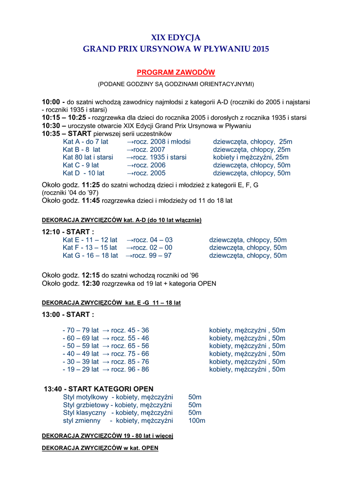 XIX EDYCJA GRAND PRIX URSYNOWA W PŁYWANIU 2015 PROGRAM ZAWODÓW (PODANE GODZINY SĄ GODZINAMI ORIENTACYJNYMI) 10:00 - do szatni wchodzą zawodnicy najmłodsi z kategorii A-D (roczniki do 2005 i najstarsi - roczniki 1935 i starsi) 10:15 – 10:25 - rozgrzewka dla dzieci do rocznika 2005 i dorosłych z rocznika 1935 i starsi 10:30 – uroczyste otwarcie XIX Edycji Grand Prix Ursynowa w Pływaniu 10:35 – START pierwszej serii uczestników Kat A - do 7 lat →rocz. 2008 i młodsi dziewczęta, chłopcy, 25m Kat B - 8 lat →rocz. 2007 dziewczęta, chłopcy, 25m Kat 80 lat i starsi →rocz. 1935 i starsi kobiety i mężczyźni, 25m Kat C - 9 lat →rocz. 2006 dziewczęta, chłopcy, 50m Kat D - 10 lat →rocz. 2005 dziewczęta, chłopcy, 50m Około godz. 11:25 do szatni wchodzą dzieci i młodzież z kategorii E, F, G (roczniki ’04 do ’97) Około godz. 11:45 rozgrzewka dzieci i młodzieży od 11 do 18 lat DEKORACJA ZWYCIĘZCÓW kat. A-D (do 10 lat włącznie) 12:10 - START : Kat E - 11 – 12 lat Kat F - 13 – 15 lat Kat G - 16 – 18 lat →rocz. 04 – 03 →rocz. 02 – 00 →rocz. 99 – 97 dziewczęta, chłopcy, 50m dziewczęta, chłopcy, 50m dziewczęta, chłopcy, 50m Około godz. 12:15 do szatni wchodzą roczniki od ’96 Około godz. 12:30 rozgrzewka od 19 lat + kategoria OPEN DEKORACJA ZWYCIĘZCÓW kat. E -G 11 – 18 lat 13:00 - START : - 70 – 79 lat - 60 – 69 lat - 50 – 59 lat - 40 – 49 lat - 30 – 39 lat - 19 – 29 lat → rocz. 45 - 36 → rocz. 55 - 46 → rocz. 65 - 56 → rocz. 75 - 66 → rocz. 85 - 76 → rocz. 96 - 86 13:40 - START KATEGORI OPEN Styl motylkowy - kobiety, mężczyźni Styl grzbietowy - kobiety, mężczyźni Styl klasyczny - kobiety, mężczyźni styl zmienny - kobiety, mężczyźni DEKORACJA ZWYCIĘZCÓW 19 - 80 lat i więcej DEKORACJA ZWYCIĘZCÓW w kat. OPEN kobiety, mężczyźni , 50m kobiety, mężczyźni , 50m kobiety, mężczyźni , 50m kobiety, mężczyźni , 50m kobiety, mężczyźni , 50m kobiety, mężczyźni , 50m 50m 50m 50m 100m