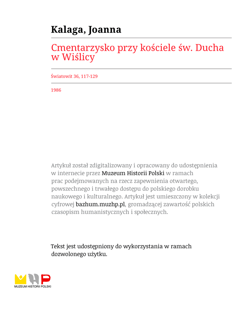 ŚWIATOWIT Warszawa, 1980 t. x x x v i Joanna Kalaga CMENTARZYSKO PRZY KOŚCIELE ŚW. DUCHA W WIŚLICY. Relikty budownictwa szpitalnego na terenie Wiślicy odsłonięte zostały w południowo — wschodniej części miasta, w wyniku przeprowadzonych prac wykopaliskowych pod kierunkiem doc. Zofii Wartołowskiej w latach 1968-1969 i 1972 (ryc. 2). Odkryto mury fundamentowe przyszpitalnego kościoła pod wezwaniem św. Ducha wraz z cmentarzyskiem szkieletowym. Obiekt położony był poza murami miejskimi, niedaleko Nidy. Cmentarzysko przy kościele św. Ducha.. 119 Na podstawie analizy układu stratygraficznego stanowiska stwierdzono, że fundamenty kościoła oraz dna niektórych jam grobowych, wkopano w warstwę spalenizny, powstałą przed zbudowaniem kościoła i założeniem cmentarzyska. 1 Pochówki stwierdzono wewnątrz kościoła, wzdłuż północnej i południowej ściany prezbiterium i na zewnątrz, od strony południowej, wschodniej i północnej (rye. 1). Łącznie przebadano 17 grobów. OPISY GROBÓW Grób nr 1 L o k a l i z a c j a — południowo-wschodnia strona cmentarzyska, w odległości 4 m od absydy. J a m a g r o b o w a — brak danych. Opis s z k i e l e t u — wyeksplorowany częściowo. Brak analizy antropologicznej. Zachowany do długości 0,80 m. Ręka prawa złożona na klatce piersiowej, lewej brak. Orientowany czaszką w kierunku północno-zachodnim. W y p o s a ż e n i e — brak. Pierwsza faza funkcjonowania cmentarzyska. Grób nr 2 L o k a l i z a c j a — południowo-wschodnia strona cmentarzyska, przy absydzie. Zniszczony przez przyporę przy absydzie. J a m a g r o b o w a — brak danych. O p i s s z k i e l e t u — wyeksplorowany całkowicie. Brak analizy antropologicznej. Długość szkieletu 1,50 m. Orientowany w kierunku północno-zachodnim. Ułożony w pozycji wyprostowanej na wznak. Noga prawa wyprostowana, lewej brak, brak rąk. Wypos a ż e n i e — brak danych. Pierwsza faza użytkowania cmentarzyska. Grób nr 3 L o k a l i z a c j a — północna strona cmentarzyska, przy ścianie kościoła. J a m a grob o w a — brak danych. Zachowany fragment trumny o długości 0,25 m. Opis szkieletu — brak danych. W y p o s a ż e n i e — brak. Pierwsza faza funkcjonowania cmentarzyska. Grób nr 4 L o k a l i z a c j a — północna strona cmentarzyska, przy ścianie kościoła. J a m a grob o w a — wyeksplorowana całkowicie. Kształt prostokątny o wymiarych 2,00 m x X 2,00 m i głębokości 0,55 m. Ślady spróchniałego drewna nieregularnie rozmiesz1 Szczegółowe opracowanie kościoła i szpitala wiślickiego znajduje się w Bibliotece Instytutu Archeologii (maszynopis). 120 J. Kaiaga czone w całym wypełnisku. W grobie tym odsłonięto szkielety 10 osobników, w tym szkielety 6 mężczyzn — w wieku adultus 2 osobników i 3 w wieku maturus, jeden prawdopodobnie w wieku późny maturus. Wśród czterech czaszek kobiecych stwierdzono: 2 w wieku wczesny maturus i dwie w wieku adultus. Druga faza funkcjonowania cmentarzyska. Grób zbiorowy. Grób nr 5 L o k a l i z a c j a — wewnątrz kościoła, w części północnej. J a m a g r o b o w a — wyeksplorowana częściowo, wzdłuż dłuższej ost grobu. Kształt prostokątny o wymiarach 1,60 m długości, 0,55 m głębokości. Szerokość — brak danych. Śladów drewna nie stwierdzono. Wypełnisko — przemieszana próchnica. Orientacja — wzdłuż osi północny-zachód południowy-wschód, równolegle do ściany kościoła. Opis szkiel e t u — brak danych. W y p o s a ż e n i e — fragment niezidentyfikowanego przedmiotu żelaznego pod szkieletem. Pierwsza faza funkcjonowania cmentarzyska. Grób nr 6 L o k a l i z a c j a — wewnątrz kościoła, w tęczy przy północnej ścianie. J a m a grob o w a — wyeksplorowana częściowo. Kształt prostokątny o wymiarach 1,25 m długości i 0,30 m głębokości. Brak danych dotyczących szerokości. Śladów drewna nie stwierdzono. Wypełnisko — przemieszana próchnica. Orientacja — północny-zachód południowy-wschód, równolegle do ściany kościoła. Opis s z k i e l e t u — — brak analizy antropologicznej. Wymiary grobu wskazują, że był to pochówek dziecięcy. W y p o s a ż e n i e — brak. Pierwsza faza funkcjonowania cmentarzyska. Grób nr 7 L o k a l i z a c j a — wewnątrz kościoła, w prezbiterium, przy północnej ścianie kościoła. J a m a g r o b o w a — wyeksplorowana częściowo, wzduż dłuższej osi. Kształt prostokątny. Długość 1,70 m, głębokość 0,55 m, szerokość - brak danych. Śladów drewna nie stwierdzono. Wypełnisko — przemieszana próchnica. Orientacja — w kierunku północny-zachód południowy-wschód, równolegle do ściany kościoła. O p i s s z k i e l e t u — brak analizy antropologicznej. Wymiary grobu wskazują na pochówek osoby dorosłej. Szkielet złożony bezpośrednio na dnie jamy grobowej, brak śladów trumny. Orientacja — w kierunku północno-zachodnim. Pierwsza faza funkcjonowania cmentarzyska. Cmentarzysko prz kościele św. Ducha.. 121 Grób nr 8 L o k a l i z a c j a — wewnątrz kościoła, w prezbiterium, przy ścianie południowej. J a m a g r o b o w a — brak danych. Opis s z k i e l e t u — brak analizy antropologicznej. Zniszczony przez wykop grobowy nr 9. Zachowana długość szkieletu 0,90 m, orientowany w kierunku północno-zachodnim, równolegle do ściany kościoła, W y p o s a ż e n i e — brak. Pierwsza faza funkcjonowania cmentarzyska. Grób nr 9 L o k a l i z a c j a — w prezbiterium kościoła, przy ścianie południowej. Częściowo nad grobem nr 8. J a m a g r o b o w a — wyeksplorowana częściowo. Kształt prostokątny o wymiarach 1,50 mx0,55 m. Śladów drewna nie stwierdzono. Wypełnisko — przemieszana próchnica. Orientacja — w kierunku północny-zachód południowy-wschód, równolegle do ściany prezbiterium. O p i s s z k i e l e t u — osobnik dorosły, płeć — brak danych. Wyeksplorowany cz