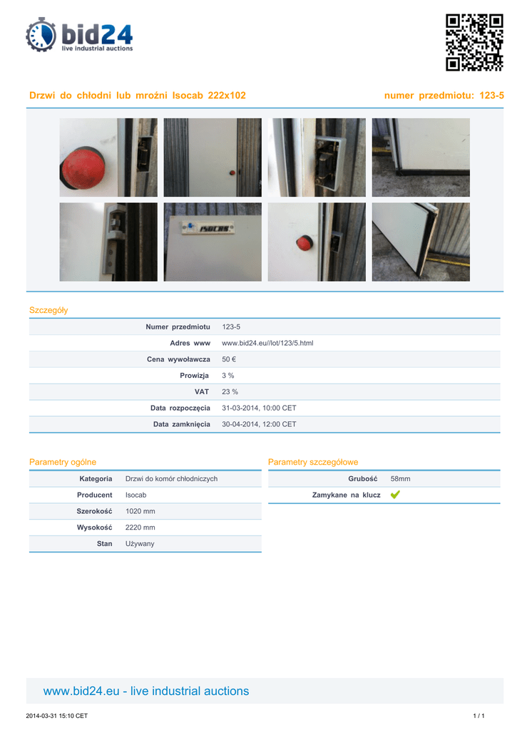 Drzwi do chłodni lub mroźni Isocab 222x102 numer przedmiotu: 123-5 Szczegóły Numer przedmiotu Adres www 123-5 www.bid24.eu//lot/123/5.html Cena wywoławcza 50 € Prowizja 3% VAT 23 % Data rozpoczęcia 31-03-2014, 10:00 CET Data zamknięcia 30-04-2014, 12:00 CET Parametry ogólne Parametry szczegółowe Kategoria Drzwi do komór chłodniczych Producent Isocab Szerokość 1020 mm Wysokość 2220 mm Stan Używany Grubość 58mm Zamykane na klucz www.bid24.eu - live industrial auctions 2014-03-31 15:10 CET 1/1