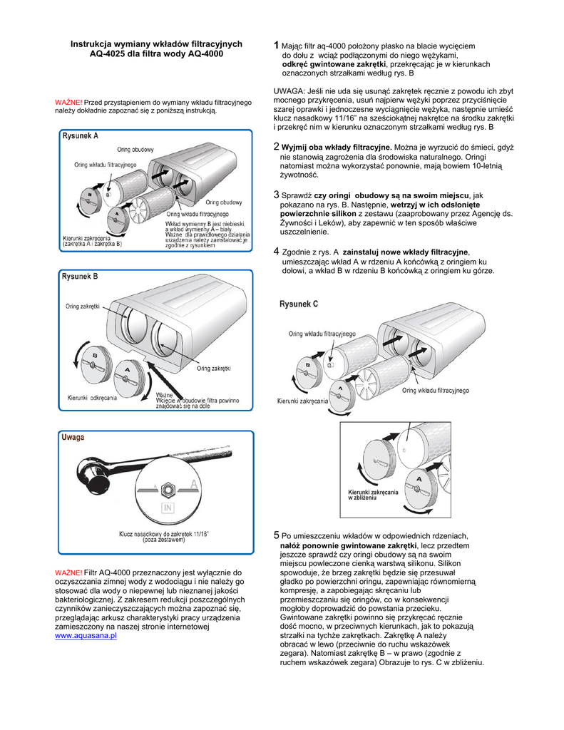 Instrukcja wymiany wkładów filtracyjnych AQ-4025 dla filtra wody AQ-4000 WAŻNE! Przed przystąpieniem do wymiany wkładu filtracyjnego należy dokładnie zapoznać się z poniższą instrukcją. 1 Mając filtr aq-4000 położony płasko na blacie wycięciem do dołu z wciąż podłączonymi do niego wężykami, odkręć gwintowane zakrętki, przekręcając je w kierunkach oznaczonych strzałkami według rys. B UWAGA: Jeśli nie uda się usunąć zakrętek ręcznie z powodu ich zbyt mocnego przykręcenia, usuń najpierw wężyki poprzez przyciśnięcie szarej oprawki i jednoczesne wyciągnięcie wężyka, następnie umieść klucz nasadkowy 11/16” na sześciokątnej nakrętce na środku zakrętki i przekręć nim w kierunku oznaczonym strzałkami według rys. B 2 Wyjmij oba wkłady filtracyjne. Można je wyrzucić do śmieci, gdyż nie stanowią zagrożenia dla środowiska naturalnego. Oringi natomiast można wykorzystać ponownie, mają bowiem 10-letnią żywotność. 3 Sprawdź czy oringi obudowy są na swoim miejscu, jak pokazano na rys. B. Następnie, wetrzyj w ich odsłonięte powierzchnie silikon z zestawu (zaaprobowany przez Agencję ds. Żywności i Leków), aby zapewnić w ten sposób właściwe uszczelnienie. 4 Zgodnie z rys. A zainstaluj nowe wkłady filtracyjne, umieszczając wkład A w rdzeniu A końcówką z oringiem ku dołowi, a wkład B w rdzeniu B końcówką z oringiem ku górze. 5 Po umieszczeniu wkładów w odpowiednich rdzeniach, WAŻNE! Filtr AQ-4000 przeznaczony jest wyłącznie do oczyszczania zimnej wody z wodociągu i nie należy go stosować dla wody o niepewnej lub nieznanej jakości bakteriologicznej. Z zakresem redukcji poszczególnych czynników zanieczyszczających można zapoznać się, przeglądając arkusz charakterystyki pracy urządzenia zamieszczony na naszej stronie internetowej www.aquasana.pl nałóż ponownie gwintowane zakrętki, lecz przedtem jeszcze sprawdź czy oringi obudowy są na swoim miejscu powleczone cienką warstwą silikonu. Silikon spowoduje, że brzeg zakrętki będzie się przesuwał gładko po powierzchni oringu, zapewniając równomierną kompresję, a zapobiegając skręcaniu lub przemieszczaniu się oringów, co w konsekwencji mogłoby doprowadzić do powstania przecieku. Gwintowane zakrętki powinno się przykręcać ręcznie dość mocno, w przeciwnych kierunkach, jak to pokazują strzałki na tychże zakrętkach. Zakrętkę A należy obracać w lewo (przeciwnie do ruchu wskazówek zegara). Natomiast zakrętkę B – w prawo (zgodnie z ruchem wskazówek zegara) Obrazuje to rys. C w zbliżeniu. 6 Mając filtr nadal położony płasko na blacie, puść zimną wodę z kranu i pociągnij zawór aktywujący. Wciąż nie zamykając przepływu wody, sprawdź czy zakrętki rdzeni nie przeciekają. W razie wykrycia przecieku, spróbuj trochę dokręcić zakrętki albo powtórz krok 4. Jeśli nie ma przecieku, postaw filtr w pionie, a woda niech płynie przez 2-3 minuty dopóki nie oczyści się z przebarwień i zmętnienia. Na spodzie lub na tylnej ściance obudowy filtra przyklej kawałek taśmy samoprzylepnej lub jakąś etykietę z zapisaną na niej datą ostatniej wymiany wkładów. Dla zapewnienia optymalnego funkcjonowania filtra, wkłady powinny być wymieniane co 6 miesięcy, lub po przefiltrowaniu 2000 litrów wody.