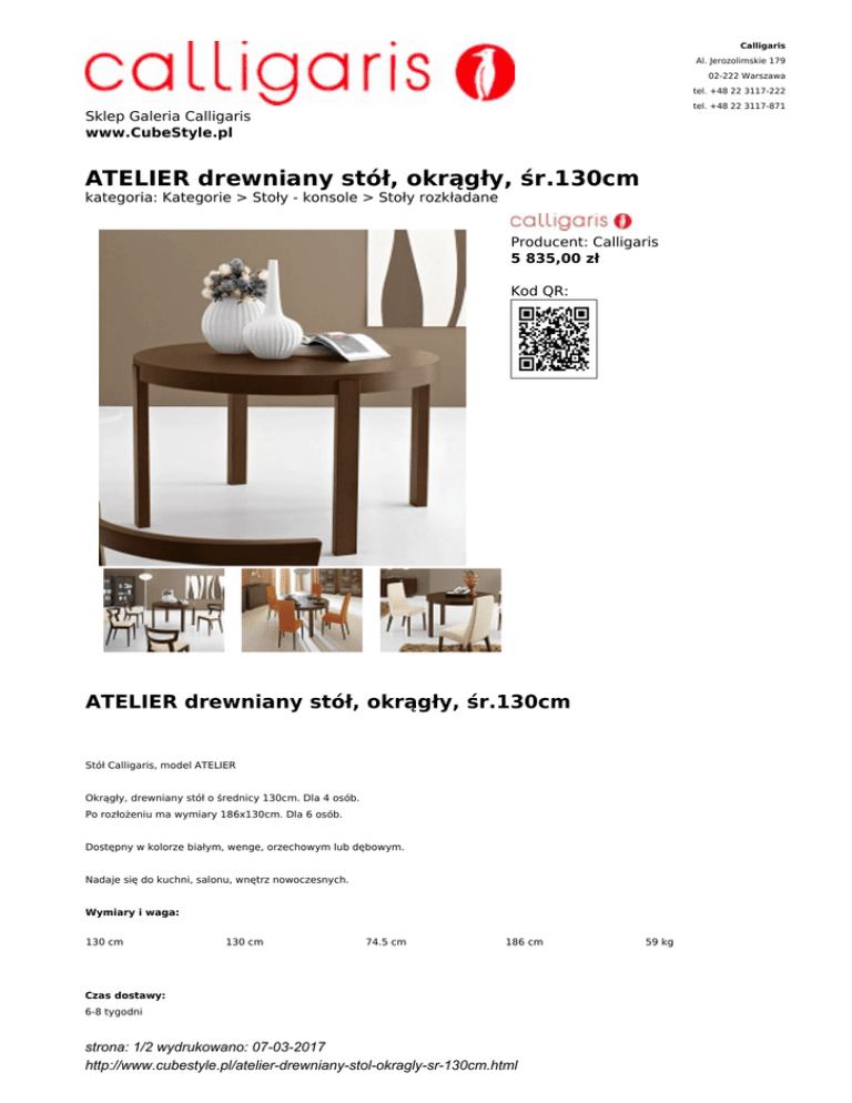 Calligaris Al. Jerozolimskie 179 02-222 Warszawa tel. +48 22 3117-222 tel. +48 22 3117-871 Sklep Galeria Calligaris www.CubeStyle.pl ATELIER drewniany stół, okrągły, śr.130cm kategoria: Kategorie > Stoły - konsole > Stoły rozkładane Producent: Calligaris 5 835,00 zł Kod QR: ATELIER drewniany stół, okrągły, śr.130cm Stół Calligaris, model ATELIER Okrągły, drewniany stół o średnicy 130cm. Dla 4 osób. Po rozłożeniu ma wymiary 186x130cm. Dla 6 osób. Dostępny w kolorze białym, wenge, orzechowym lub dębowym. Nadaje się do kuchni, salonu, wnętrz nowoczesnych. Wymiary i waga: 130 cm 130 cm 74.5 cm 186 cm Czas dostawy: 6-8 tygodni strona: 1/2 wydrukowano: 07-03-2017 http://www.cubestyle.pl/atelier-drewniany-stol-okragly-sr-130cm.html 59 kg Dostępne wersje: Veneered top strona: 2/2 wydrukowano: 07-03-2017 http://www.cubestyle.pl/atelier-drewniany-stol-okragly-sr-130cm.html