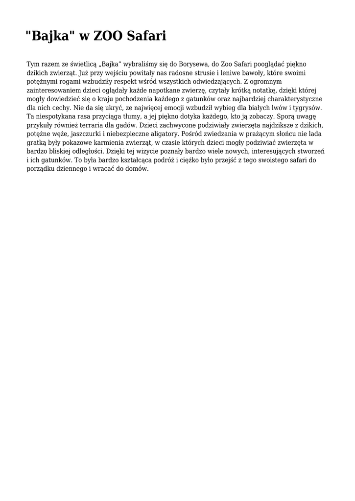 "Bajka" w ZOO Safari Tym razem ze świetlicą „Bajka” wybraliśmy się do Borysewa, do Zoo Safari pooglądać piękno dzikich zwierząt. Już przy wejściu powitały nas radosne strusie i leniwe bawoły, które swoimi potężnymi rogami wzbudziły respekt wśród wszystkich odwiedzających. Z ogromnym zainteresowaniem dzieci oglądały każde napotkane zwierzę, czytały krótką notatkę, dzięki której mogły dowiedzieć się o kraju pochodzenia każdego z gatunków oraz najbardziej charakterystyczne dla nich cechy. Nie da się ukryć, ze najwięcej emocji wzbudził wybieg dla białych lwów i tygrysów. Ta niespotykana rasa przyciąga tłumy, a jej piękno dotyka każdego, kto ją zobaczy. Sporą uwagę przykuły również terraria dla gadów. Dzieci zachwycone podziwiały zwierzęta najdziksze z dzikich, potężne węże, jaszczurki i niebezpieczne aligatory. Pośród zwiedzania w prażącym słońcu nie lada gratką były pokazowe karmienia zwierząt, w czasie których dzieci mogły podziwiać zwierzęta w bardzo bliskiej odległości. Dzięki tej wizycie poznały bardzo wiele nowych, interesujących stworzeń i ich gatunków. To była bardzo kształcąca podróż i ciężko było przejść z tego swoistego safari do porządku dziennego i wracać do domów.