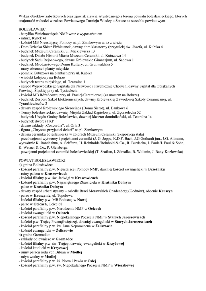 Wykaz obiektów zabytkowych oraz zjawisk z życia artystycznego z terenu powiatu bolesławieckiego, których znajomość wchodzi w zakres Powiatowego Turnieju Wiedzy o Sztuce na szczeblu powiatowym BOLESŁAWIEC: - bazylika Wniebowzięcia NMP wraz z wyposażeniem - ratusz, Rynek 41 - kościół MB Nieustającej Pomocy na pl. Zamkowym wraz z wieżą - Dom Dziecka Sióstr Elżbietanek, dawny dom klasztorny (przytułek) św. Józefa, ul. Kubika 4 - budynek Muzeum Ceramiki, ul. Mickiewicza 13 - budynek Działu Historii Miasta Muzeum Ceramiki, ul. Kutuzowa 14 - budynek Sądu Rejonowego, dawne Królewskie Gimnazjum, ul. Sądowa 1 - budynek Młodzieżowego Domu Kultury, ul. Grunwaldzka 5 - mury obronne i planty miejskie - pomnik Kutuzowa na plantach przy ul. Kubika - wiadukt kolejowy na Bobrze - budynek teatru miejskiego, ul. Teatralna 1 - zespół Wojewódzkiego Szpitala dla Nerwowo i Psychicznie Chorych, dawny Szpital dla Obłąkanych Prowincji Śląskiej przy ul. Tysiąclecia - kościół MB Różańcowej przy ul. Ptasiej/Ceramicznej (za mostem na Bobrze) - budynek Zespołu Szkół Elektronicznych, dawnej Królewskiej Zawodowej Szkoły Ceramicznej, ul. Tyrankiewiczów 2 - dawny zespół Królewskiego Sierocińca (Domu Sierot), ul. Bankowa 6 - Termy bolesławieckie, dawniej Miejski Zakład Kąpielowy, ul. Zgorzelecka 52 - budynek Urzędu Gminy Bolesławiec, dawniej klasztor dominikański, ul. Teatralna 1a - budynek dworca PKP - dawne zakłady „Concordia”, ul. Orla 3 - figura „Chrystus przyjaciel dzieci” na pl. Zamkowym - dawna ceramika bolesławiecka w zbiorach Muzeum Ceramiki (ekspozycja stała) - przedwojenni wytwórcy i projektanci ceramiki (J. G. Joppe, K.D.F. Bach, J.G.Gothardt jun., J.G. Altmann, wytwórnie K. Randhahna, A. Seifferta, H. Reinholda/Reinhold & Co., R. Burdacka, J. Paula/J. Paul & Sohn, K. Werner & Co., P. Gleisberga - powojenni projektanci ceramiki bolesławieckiej (T. Szafran, I. Zdrzałka, B. Wolanin, J. Bany-Kozłowska) POWIAT BOLESŁAWIECKI a) gmina Bolesławiec: - kościół parafialny p.w. Nieustającej Pomocy NMP, dawniej kościół ewangelicki w Brzeźniku - ruiny pałacu w Kraszowicach - kościół filialny p.w. św. Jadwigi w Kraszowicach - kościół parafialny p.w. Najświętszego Zbawiciela w Kraśniku Dolnym - pałac w Kraśniku Dolnym - dawny zespół urbanistyczny – osiedle Braci Morawskich Gnadenberg (Godnów), obecnie Kruszyn - pałac w Kruszynie, ul. Topolowa - kościół filialny p.w. MB Bolesnej w Nowej - pałac w Ocicach, Ocice 68 - kościół parafialny p.w. Narodzenia NMP w Ocicach - kościół ewangelicki w Ocicach - kościół parafialny p.w. Niepokalanego Poczęcia NMP w Starych Jaroszewicach - kościół p.w. Trójcy Przenajświętszej, dawniej ewangelicki w Starych Jaroszewicach - kościół parafialny p.w. św. Jana Nepomucena w Żeliszowie - kościół ewangelicki w Żeliszowie b) gmina Gromadka: - zakłady odlewnicze w Gromadce - kościół filialny p.w. św. Trójcy, dawniej ewangelicki w Krzyżowej - kościół katolicki w Krzyżowej - ruiny pałacu rodu von Bibran w Modłej - młyn wodny w Modłej - kościół parafialny p.w. śś. Piotra i Pawła w Osłej - kościół parafialny p.w. św. Niepokalanego Poczęcia NMP w Wierzbowej c) gmina Osiecznica: - kościół parafialny p.w. Niepokalanego Poczęcia NMP w Ławszowej - kościół filialny p.w. Trzech Króli w Kliczkowie - zamek w Kliczkowie - park zamkowy w Kliczkowie z cmentarzyskiem koni - Dom Wernera w Osiecznicy - kościół p.w. św. Antoniego, dawniej ewangelicki w Parowej d) miasto i gmina Nowogrodziec: - kościół parafialny śś Piotra i Pawła w Nowogrodźcu wraz z wyposażeniem - ruiny klasztoru Magdalenek w Nowogrodźcu - mury miejskie w Nowogrodźcu - kościół filialny p.w. św. Mikołaja w Nowogrodźcu przy ul. Słowackiego - ratusz w Nowogrodźcu - zespół klinkierni „Ołdrzychów”, Nowogrodziec-Ołdrzychów, ul. Fabryczna 3 - kościół filialny pw. św. Stanisława w Czernej - kościół parafialny pw. św. Antoniego w Gierałtowie - ruiny zamku w Gościszowie - kościół parafialny p.w. MB Częstochowskiej w Gościszowie - ruiny kościoła ewangelickiego w Gościszowie - kościół parafialny pw. śś. Mikołaja i Anny w Wykrotach - dzwonnica, wieża dawnego kościoła ewangelickiego w Zebrzydowej e) gmina Warta Bolesławiecka: - kościół p.w. św. Krzyża w Iwinach - pałac w Iwinach - kościół p.w. św. Michała w Raciborowicach Górnych - kościół parafialny p.w. św. Anny w Tomaszowie Bolesławieckim - kościół ewangelicki w Tomaszowie Bolesławieckim - pałac w Tomaszowie Bolesławieckim - kościół parafialny p.w. Narodzenia NMP w Warcie Bolesławieckiej - dwór w Warcie Bolesławieckiej f) zabytki poza powiatem: - zamek Grodziec