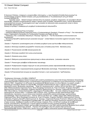 Portal i Kwartalnik Emiddle East 10 Zasad Global Compact Autor: Robert Miko³ajek  Szanowni Pañstwo, niniejszym z przyjemno¶ci± informujemy, i¿ nasz Kwartalnik Emiddle East przyst±pi³ do Onzetowskiego programu Global Compact, poni¿ej przedstawiamy w 10 podstawowych za³o¿eñ Global Compact.REDAKCJA Dziesiêæ zasad Global Compact nak³ania firmy do poparcia, przyjêcia i stosowania, we wszystkich sferach dzia³alno¶ci, dziesiêciu fundamentalnych zasad z zakresu praw cz³owieka, standardów pracy, ochrony ¶rodowiska i przeciwdzia³ania korupcji. Przestrzeganie tych regu³ prowadzi do dokonania wielu pozytywnych zmian w sferze dzia³alno¶ci operacyjnej firm. Zasady te wynikaj± z nastêpuj±cych przyjêtych fundamentalnych dokumentów: - "Powszechnej Deklaracji Praw Cz³owieka" - "Deklaracji Miêdzynarodowej Organizacji Pracy o Fundamentalnych Zasadach i Prawach w Pracy" - The International Labour Organization's Declaration on Fundamental Principles and Rights at Work - "Deklaracji z Rio o ¦rodowisku Naturalnym i Rozwoju" Agenda 21 - The Rio Declaration on Environment and Development - "Konwencji Narodów Zjednoczonych przeciwko korupcji" - United Nations Convention against Corruption Prawa Cz³owieka Zasada 1. Popieranie i przestrzeganie praw cz³owieka przyjêtych przez spo³eczno¶æ miêdzynarodow±. Zasada 2. Eliminacja wszelkich przypadków ³amania praw cz³owieka przez firmê. Standardy pracy Zasada 3. Poszanowanie wolno¶ci stowarzyszania siê. Zasada 4. Eliminacja wszelkich form pracy przymusowej. Zasada 5. Zniesienie pracy dzieci. Zasada 6. Efektywne przeciwdzia³anie dyskryminacji w sferze zatrudnienia. ¦rodowisko naturalne Zasada 7. Prewencyjne podej¶cie do ¶rodowiska naturalnego. Zasada 8. Podejmowanie inicjatyw maj±cych na celu promowanie postaw odpowiedzialno¶ci ekologicznej. Zasada 9. Stosowanie i rozpowszechnianie przyjaznych ¶rodowisku technologii. Przeciwdzia³anie korupcji Zasada 10.Przeciwdzia³anie korupcji we wszystkich formach, w tym wymuszeniom i ³apówkarstwu.  Podstawowe informacje o GLOBAL COMPACT  Po raz pierwszy inicjatywa Global Compact (GC) zosta³a przedstawiona przez Kofi Annana Sekretarza Generalnego Organizacji Narodów Zjednoczonych w przemówieniu wyg³oszonym na ¦wiatowym Forum Ekonomicznym w Davos 31 stycznia 1999 r. Zaapelowa³ on wówczas do przedstawicieli ¶wiata biznesu na ca³ym ¶wiecie, by poparli, przyjêli, i stosowali we wszystkich sferach ich dzia³alno¶ci, dziewiêæ fundamentalnych regu³ z zakresu praw cz³owieka, standardów pracy i ¶rodowiska naturalnego. "Sieæ GC zbudowana jest z: rdzenia, którym jest Biuro GC i sze¶ciu agend ONZ: Miêdzynarodowej Organizacji Pracy, Biura Wysokiego Komisarza ds. Praw Cz³owieka, Programu Narodów Zjednoczonych Ochrony ¦rodowiska, Programu Narodów Zjednoczonych ds. Rozwoju, Organizacji Rozwoju Przemys³u ONZ i Biura ONZ ds. Kontroli Narkotyków i Zapobiegania Przestêpczo¶ci". Od czasu oficjalnej inauguracji fazy operacyjnej GC 26 lipca 2000 r. w siedzibie ONZ w Nowym Jorku, rozwinê³a siê jego wielonarodowa sieæ interesariuszy, kierowana w du¿ej mierze przez dzia³ania uczestników sektora prywatnego i spo³eczeñstwa obywatelskiego. Sieæ zbudowana jest z : rdzenia, którym jest Biuro GC i sze¶ciu agend ONZ: Miêdzynarodowej Organizacji Pracy, Biura Wysokiego Komisarza ds. Praw Cz³owieka, Programu Narodów Zjednoczonych Ochrony ¦rodowiska, Programu Narodów Zjednoczonych ds. Rozwoju i Organizacji Rozwoju Przemys³u ONZ oraz Biura ONZ ds. Kontroli Narkotyków i Zapobiegania Przestêpczo¶ci. GC obejmuje wszystkich stosownych aktorów spo³ecznych: w³adze rz±dowe, okre¶laj±ce zasady na których bazuj± inicjatywy; firmy, od których oczekuje siê okre¶lonych dzia³añ; pracodawców, skupiaj±cych w swoich rêkach konkretne procesy produkcji globalnej; organizacje pozarz±dowe reprezentuj±ce rozleg³± spo³eczno¶æ interesariuszy; oraz ONZ, jedyne prawdziwe ¶wiatowe forum polityki globalnej, jako autorytatywnego doradcê. Poprzez si³ê wspólnych akcji GC popiera ideê spo³ecznej odpowiedzialno¶ci biznesu i dziêki temu, biznes mo¿e byæ czê¶ci± rozwi±zania wyzwañ stawianych przez http://www.test.emiddle-east.com Kreator PDF Utworzono 7 March, 2017, 00:20 Portal i Kwartalnik Emiddle East globalizacjê. Poprzez te dzia³ania, sektor prywatny w partnerstwie z innymi aktorami spo³ecznymi mo¿e pomóc GC w realizacji wizji Sekretarza Generalnego: zrównowa¿onego wzrostu ¶wiatowej gospodarki. GC okre¶li³ siebie jako rozleg³e, cenne ramy dla dzia³añ w kierunku zaanga¿owania biznesu w pracê ONZ, zachêcania obywateli do kooperacji w czterech zasadniczych obszarach: Sieci lokalnych - by GC by³ rzeczywi¶cie inicjatyw± globaln±, reprezentowan± w ka¿dym regionie ¶wiata; - Dialogu Spo³ecznym i Analizie - by umacniaæ za³o¿enia GC i wywo³ywaæ szersz± debatê oraz wnikliwo¶æ w dylematy i wyniki globalizacji; - Centrum Wiedzy - by promowaæ dzielenie siê informacjami oraz zmiany organizacyjne i instytucjonalne; - Projektach - by koordynowaæ praktyczne dzia³ania i partnerskie inicjatywy z cia³ami ONZ oraz innymi aktorami rozwoju, w odpowiedzi na potrzeby rozwojowe biedniejszych krajów oraz przek³adaæ ustalone normy i zasady respektowania ¶rodowiska naturalnego, standardów pracy i praw cz³owieka na konkretne wyniki. Obecnie ponad 2000 firm ze wszystkich regionów ¶wiata, miêdzynarodowe ¶rodowiska pracy i organizacje pozarz±dowe s± zaanga¿owane w GC. Podczas Szczytu Liderów Global Compact w czerwcu 2004 roku, og³oszono now±, dziesi±t± zasadê Global Compact. Dotyczy ona przeciwdzia³ania korupcji. Global Compact jest bezpo¶redni± inicjatyw± Sekretarza Generalnego, ale jego sztab i dzia³ania s± elastyczne i nie skodyfikowane. GC jest inicjatyw±, w której uczestnictwo ma charakter ca³kowicie dobrowolny, obejmuj±c± dwa obszary tematyczne: - Propagowanie 10 Zasad, na których bazuje GC, w¶ród biznesu na ¶wie