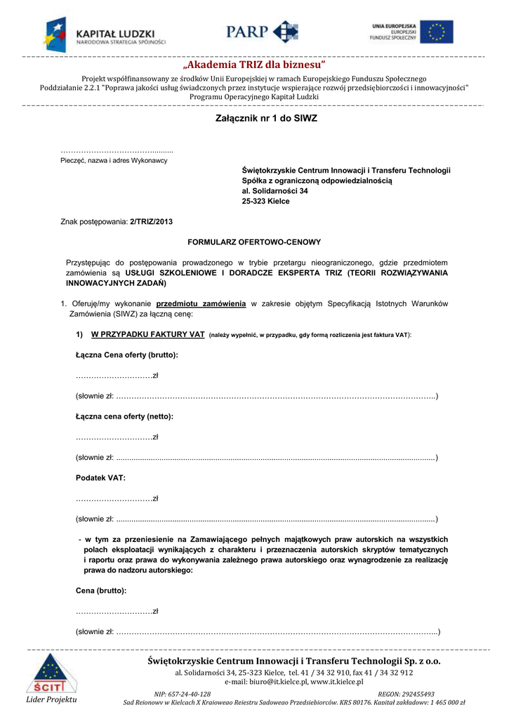 555 „Akademia TRIZ dla biznesu” Projekt współfinansowany ze środków Unii Europejskiej w ramach Europejskiego Funduszu Społecznego Poddziałanie 2.2.1 "Poprawa jakości usług świadczonych przez instytucje wspierające rozwój przedsiębiorczości i innowacyjności" Programu Operacyjnego Kapitał Ludzki Załącznik nr 1 do SIWZ ……………………………….......... Pieczęć, nazwa i adres Wykonawcy Świętokrzyskie Centrum Innowacji i Transferu Technologii Spółka z ograniczoną odpowiedzialnością al. Solidarności 34 25-323 Kielce Znak postępowania: 2/TRIZ/2013 FORMULARZ OFERTOWO-CENOWY Przystępując do postępowania prowadzonego w trybie przetargu nieograniczonego, gdzie przedmiotem zamówienia są USŁUGI SZKOLENIOWE I DORADCZE EKSPERTA TRIZ (TEORII ROZWIĄZYWANIA INNOWACYJNYCH ZADAŃ) 1. Oferuję/my wykonanie przedmiotu zamówienia w zakresie objętym Specyfikacją Istotnych Warunków Zamówienia (SIWZ) za łączną cenę: 1) W PRZYPADKU FAKTURY VAT (należy wypełnić, w przypadku, gdy formą rozliczenia jest faktura VAT): Łączna Cena oferty (brutto): …………………………zł (słownie zł: ……………………………………………………………………………………………………………..) Łączna cena oferty (netto): …………………………zł (słownie zł: .................................................................................................................................................... ) Podatek VAT: …………………………zł (słownie zł: .................................................................................................................................................... ) - w tym za przeniesienie na Zamawiającego pełnych majątkowych praw autorskich na wszystkich polach eksploatacji wynikających z charakteru i przeznaczenia autorskich skryptów tematycznych i raportu oraz prawa do wykonywania zależnego prawa autorskiego oraz wynagrodzenie za realizację prawa do nadzoru autorskiego: Cena (brutto): …………………………zł (słownie zł: ……………………………………………………………………………………………………………...) Świętokrzyskie Centrum Innowacji i Transferu Technologii Sp. z o.o. al. Solidarności 34, 25-323 Kielce, tel. 41 / 34 32 910, fax 41 / 34 32 912 e-mail: [email protected], www.it.kielce.pl Lider Projektu NIP: 657-24-40-128 REGON: 292455493 Sąd Rejonowy w Kielcach X Krajowego Rejestru Sadowego Przedsiębiorców, KRS 80176, Kapitał zakładowy: 1 465 000 zł 555 „Akademia TRIZ dla biznesu” Projekt współfinansowany ze środków Unii Europejskiej w ramach Europejskiego Funduszu Społecznego Poddziałanie 2.2.1 "Poprawa jakości usług świadczonych przez instytucje wspierające rozwój przedsiębiorczości i innowacyjności" Programu Operacyjnego Kapitał Ludzki Cena (netto): …………………………zł (słownie zł: .................................................................................................................................................... ) Podatek VAT: …………………………zł (słownie zł: .................................................................................................................................................... ) w tym: cena za przeprowadzenie 1 godziny szkoleniowej zawierająca przeniesienie na Zamawiającego pełnych majątkowych praw autorskich na wszystkich polach eksploatacji wynikających z charakteru i przeznaczenia autorskich skryptów tematycznych oraz prawa do wykonywania zależnego prawa autorskiego oraz wynagrodzenie za realizację prawa do nadzoru autorskiego: Cena za przeprowadzenie 1 szkoleniowej (brutto): …………………………zł (słownie zł: ………………………………………………………………………………………..………………) Cena (netto): …………………………zł (słownie zł: ............................................................................................................................................ ) Podatek VAT: ………………………zł (słownie zł: ............................................................................................................................................. ) cena za przeprowadzenie doradztwa dla jednego przedsiębiorstwa zawierająca przeniesienie na Zamawiającego pełnych majątkowych praw autorskich na wszystkich polach eksploatacji wynikających z charakteru i przeznaczenia raportu oraz prawa do wykonywania zależnego prawa autorskiego oraz wynagrodzenie za realizację prawa do nadzoru autorskiego: Cena za przeprowadzenie doradztwa dla jednego przedsiębiorstwa (brutto): …………………………zł (słownie zł: ………………………………………………………………………………………..………………) Cena (netto): …………………………zł Świętokrzyskie Centrum Innowacji i Transferu Technologii Sp. z o.o. al. Solidarności 34, 25-323 Kielce, tel. 41 / 34 32 910, fax 41 / 34 32 912 e-mail: [email protected], www.it.kielce.pl Lider Projektu NIP: 657-24-40-128 REGON: 292455493 Sąd Rejonowy w Kielcach X Krajowego Rejestru Sadowego Przedsiębiorców, KRS 80176, Kapitał zakładowy: 1 465 000 zł 555 „Akademia TRIZ dla biznesu” Projekt współfinansowany ze środków Unii Europejskiej w ramach Europejskiego Funduszu Społecznego Poddziałanie 2.2.1 "Poprawa jakości usług świadczonych przez instytucje wspierające rozwój przedsiębiorczości i innowacyjności" Programu Operacyjnego Kapitał Ludzki (słownie zł: ............................................................................................................................................ ) Podatek VAT: ………………………zł (słownie zł: .......................................................................................................................................
