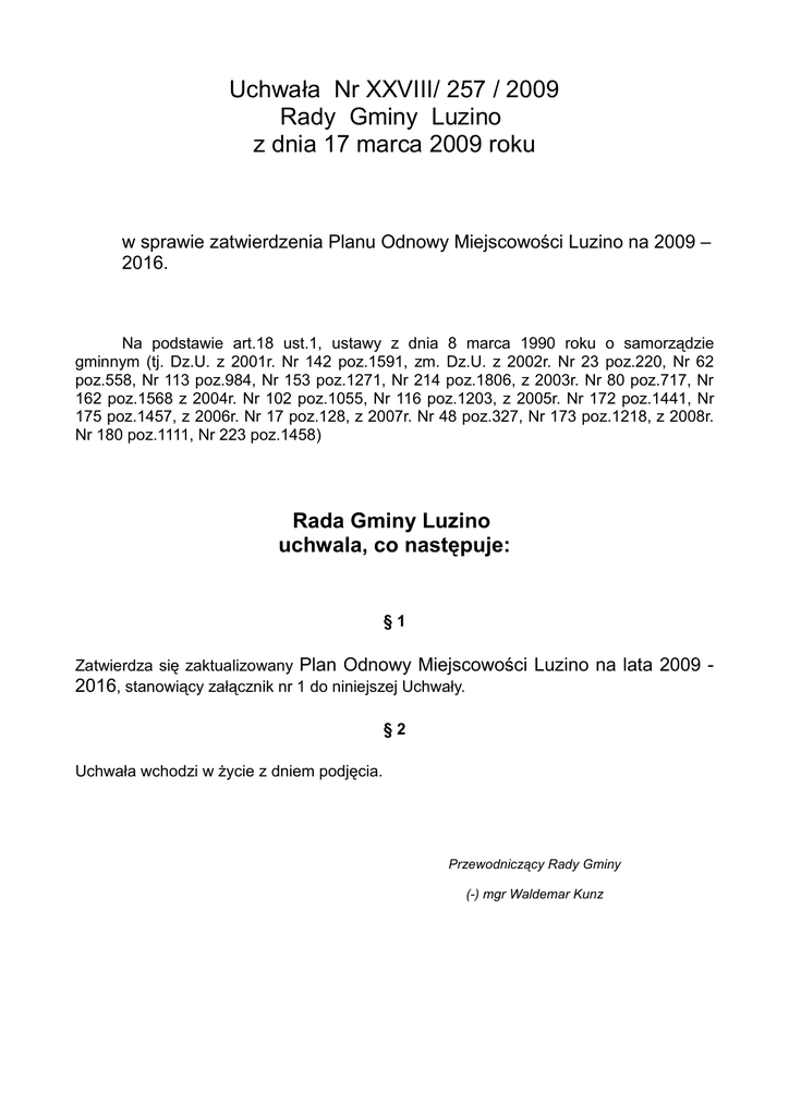 Uchwała Nr XXVIII/ 257 / 2009 Rady Gminy Luzino z dnia 17 marca 2009 roku w sprawie zatwierdzenia Planu Odnowy Miejscowości Luzino na 2009 – 2016. Na podstawie art.18 ust.1, ustawy z dnia 8 marca 1990 roku o samorządzie gminnym (tj. Dz.U. z 2001r. Nr 142 poz.1591, zm. Dz.U. z 2002r. Nr 23 poz.220, Nr 62 poz.558, Nr 113 poz.984, Nr 153 poz.1271, Nr 214 poz.1806, z 2003r. Nr 80 poz.717, Nr 162 poz.1568 z 2004r. Nr 102 poz.1055, Nr 116 poz.1203, z 2005r. Nr 172 poz.1441, Nr 175 poz.1457, z 2006r. Nr 17 poz.128, z 2007r. Nr 48 poz.327, Nr 173 poz.1218, z 2008r. Nr 180 poz.1111, Nr 223 poz.1458) Rada Gminy Luzino uchwala, co następuje: §1 Zatwierdza się zaktualizowany Plan Odnowy Miejscowości Luzino na lata 2009 2016, stanowiący załącznik nr 1 do niniejszej Uchwały. §2 Uchwała wchodzi w Ŝycie z dniem podjęcia. Przewodniczący Rady Gminy (-) mgr Waldemar Kunz Załącznik 1 do uchwały Nr XXVIII/257/ 2009 Rady Gminy Luzino z dnia 17 marca 2009 roku PLAN ODNOWY MIEJSCOWOŚCI LUZINO NA LATA 2009 – 2016 LUZINO, marzec 2009 roku WSTĘP Luzino usytuowane jest w środkowej części województwa pomorskiego, w powiecie wejherowskim. Sołectwo Luzino połoŜone jest w centrum Gminy Luzino, po obu stronach międzynarodowej trasy E-28 (droga krajowa nr 6) Gdańsk – Szczecin – Berlin oraz linii kolejowej Gdańsk - Szczecin. (stan na W Luzinie zameldowanych na pobyt stały jest 6 997 mieszkańców dzień 2008.12.31). Celem opracowania Planu Odnowy Miejscowości Luzino jest sformułowanie strategii rozwoju wsi Luzino, a przedmiotem jest: analiza zasobów sołectwa, analiza korzystnych i niekorzystnych cech wewnętrznych sołectwa, oraz potencjalnych szans i zagroŜeń występujących w otoczeniu, które mogą mieć wpływ na przyszłość sołectwa i mieszkańców, wizja rozwoju wsi, priorytety rozwojowe, cele i projekty. Sołectwo musi dysponować Planem Odnowy Miejscowości w celu wykorzystania w pełni istniejącego potencjału i szans rozwojowych, w tym dostęp do środków pomocowych i funduszy centralnych. Gmina Luzino posiada Strategię Rozwoju Luzino do 2015 roku zatwierdzoną uchwałą Rady Gminy Luzino Nr XXII/151/2000 z dnia 13.10.2000r. w sprawie przyjęcia Strategii Rozwoju Gminy Luzino. ANALIZA ZASOBÓW SOŁECTWA LUZINO Analizę zasobów sołectwa przeprowadzono na podstawie danych statystycznych oraz informacji zgromadzonej przez mieszkańców podczas warsztatów na arkuszach analitycznych. Zasoby – to wszelkie elementy materialne i niematerialne wsi i otaczającego ją obszaru, które mogą być wykorzystane obecnie bądź w przyszłości w budowaniu bądź realizacji publicznych bądź prywatnych przedsięwzięć odnowy wsi. W analizie zasobów brano pod uwagę następujące rodzaje zasobów: środowisko przyrodnicze, środowisko kulturowe, dziedzictwo religijne i historyczne, obiekty i tereny, gospodarka, rolnictwo, sąsiedzi i przyjezdni, instytucje, ludzie. organizacje społeczne. Środowisko przyrodnicze Luzino usytuowane jest na pograniczu dwóch wielkich jednostek morfologicznych: PobrzeŜa Bałtyckiego i Pojezierza Kaszubskiego. Przez Luzino przepływa rzeka Bolszewka. Przy siedzibie Nadleśnictwa Strzebielino z siedzibą w Luzinie przy ul. Ofiar Stutthofu 47 jest zlokalizowany park dendrologiczny. Na prywatnej posesji (róg ulic Kaszubskiej i Szkolnej w Luzinie) znajduje się naturalna altana grabowa. Środowisko kulturowe Na terenie Luzina znajduje się wiele obiektów o wartości zabytkowej i historycznej. Zabytki Luzina: 1. Kościół rzymsko-katolicki pod wezwaniem św. Wawrzyńca. Obecna budowla pochodzi z 1740 roku. WyposaŜenie kościoła jest barokowe oraz późniejsze z XIX i końca XX wieku. W kościele zwracają uwagę liczne rzeźby z XVIII w., droga krzyŜowa z XIX w., chrzcielnica XVIII wieczna oraz wykuta z kamienia kropielnica (średniowieczna). Na frontonie znajduje się fresk upamiętniający „marsz śmierci” i kanonizację o. Maksymiliana Kolbego. Na wieŜy kościelnej znajduje się cztery dzwony: zabytkowy z 1793 roku, dzwon „Niemiec” z 1895 roku, dzwon „Maryja” (1950) oraz dzwon okrętowy. Znajduje się tam równieŜ mechaniczny zegar z 1912 roku. Na południowej ścianie kościoła umieszczony jest zegar słoneczny. 2. Dwie barokowe kapliczki z XVIII w. 3. Grodzisko z IX w. połoŜone na południowy wschód od Luzina (przy ul. Długiej). 4. Kościół protestancki zbudowany w 1895 roku w stylu neogotyckim. W latach 1976 – 1977 został przebudowany na bibliotekę. W bibliotece im. L. Roppla znajdują się stałe wystawy tematyczne m.in. znaleziska archeologiczne pochodzące z terenów Gminy Luzino, twórczości ludowej (malarstwa, rzeźby), a takŜe liczne dokumenty z Ŝycia społecznego i kulturalnego gminy. W Luzinie działają następujące zespoły artystyczne: Chór LUTNIA, zespół młodzieŜowy Sineater grupa młodzieŜowa C.Z.A.D., dziecięcy zespól ludowy: Luzińskie Dzwoneczki, grupa Koła Gospodyń Wiejskich, Regionalny Kaszubski Zespół Teatralny, Orkiestra Dęta przy StraŜy PoŜarnej. Dziedzictwo religijne i historyczne Na terenie Luzina są dwa parafialne kościoły: pod wezwaniem Św. Wawrzyńca oraz nowo powstała parafia pod wezwaniem Matki BoŜej RóŜańcowej. Luzino jest siedzibą władz dekanalnych. Przy Szkole Podstawowej w Luzinie działa Izba Regionalna. Obiekty i tereny Luzino jest miejscowością bardzo zurbanizowaną – jest duŜa ilość działek pod zabudowę mieszkaniową. Do miejsc sportu i rekreacji w Luzinie naleŜą: Hala Widowiskowo – Sportowa, sala gimnastyczna i boiska sportowe przy szkołach, boisko sportowe przy ul. Wilczka, ścieŜka zdrowia połoŜona w lesie przy ul. Wilczka w Luzinie. Gospodarka, rolnictwo Struktura działalności gospodarczej w miejscowości Luzino na dzień 31.12.2008r. Luzino Produkcja Usługi Handel Gastronomia Transport 15 412 85 6 27 W Luzinie swoją siedzibę mają równieŜ większe przedsiębiorstwa produkcyjne i usługowe zatrudniające kilkadziesi