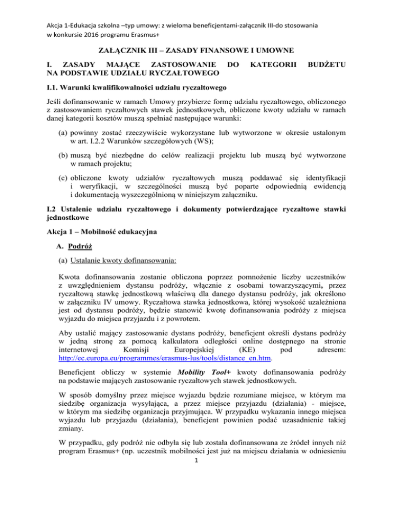 Akcja 1-Edukacja szkolna –typ umowy: z wieloma beneficjentami-załącznik III-do stosowania w konkursie 2016 programu Erasmus+ ZAŁĄCZNIK III – ZASADY FINANSOWE I UMOWNE I. ZASADY MAJĄCE ZASTOSOWANIE DO NA PODSTAWIE UDZIAŁU RYCZAŁTOWEGO KATEGORII BUDŻETU I.1. Warunki kwalifikowalności udziału ryczałtowego Jeśli dofinansowanie w ramach Umowy przybierze formę udziału ryczałtowego, obliczonego z zastosowaniem ryczałtowych stawek jednostkowych, obliczone kwoty udziału w ramach danej kategorii kosztów muszą spełniać następujące warunki: (a) powinny zostać rzeczywiście wykorzystane lub wytworzone w okresie ustalonym w art. I.2.2 Warunków szczegółowych (WS); (b) muszą być niezbędne do celów realizacji projektu lub muszą być wytworzone w ramach projektu; (c) obliczone kwoty udziałów ryczałtowych muszą poddawać się identyfikacji i weryfikacji, w szczególności muszą być poparte odpowiednią ewidencją i dokumentacją wyszczególnioną w niniejszym załączniku. I.2 Ustalenie udziału ryczałtowego i dokumenty potwierdzające ryczałtowe stawki jednostkowe Akcja 1 – Mobilność edukacyjna A. Podróż (a) Ustalanie kwoty dofinansowania: Kwota dofinansowania zostanie obliczona poprzez pomnożenie liczby uczestników z uwzględnieniem dystansu podróży, włącznie z osobami towarzyszącymi, przez ryczałtową stawkę jednostkową właściwą dla danego dystansu podróży, jak określono w załączniku IV umowy. Ryczałtowa stawka jednostkowa, której wysokość uzależniona jest od dystansu podróży, będzie stanowić kwotę dofinansowania podróży z miejsca wyjazdu do miejsca przyjazdu i z powrotem. Aby ustalić mający zastosowanie dystans podróży, beneficjent określi dystans podróży w jedną stronę za pomocą kalkulatora odległości online dostępnego na stronie internetowej Komisji Europejskiej (KE) pod adresem: http://ec.europa.eu/programmes/erasmus-lus/tools/distance_en.htm. Beneficjent obliczy w systemie Mobility Tool+ kwoty dofinansowania podróży na podstawie mających zastosowanie ryczałtowych stawek jednostkowych. W sposób domyślny przez miejsce wyjazdu będzie rozumiane miejsce, w którym ma siedzibę organizacja wysyłająca, a przez miejsce przyjazdu (działania) - miejsce, w którym ma siedzibę organizacja przyjmująca. W przypadku wykazania innego miejsca wyjazdu lub przyjazdu (działania), beneficjent powinien podać uzasadnienie takiej zmiany. W przypadku, gdy podróż nie odbyła się lub została dofinansowana ze źródeł innych niż program Erasmus+ (np. uczestnik mobilności jest już na miejscu działania w odniesieniu 1 Akcja 1-Edukacja szkolna –typ umowy: z wieloma beneficjentami-załącznik III-do stosowania w konkursie 2016 programu Erasmus+ do działania innego niż to dofinansowane w ramach Umowy), beneficjent będzie zobowiązany do sprawozdania takiej sytuacji w systemie Mobility Tool+ w odniesieniu do każdej takiej mobilności. W takim przypadku nie zostanie przyznane dofinansowanie kosztów podróży. (b) Kwalifikowalność działania: Działanie, dla którego warunkiem kwalifikującym otrzymanie dofinansowania będzie rzeczywiste odbycie przez uczestnika sprawozdanej podróży. (c) Dokumenty potwierdzające: - W przypadku podróży pomiędzy organizacją wysyłającą a przyjmującą: potwierdzenie uczestnictwa w działaniu za granicą w formie zaświadczenia podpisanego przez organizację przyjmującą, z podaniem imienia i nazwiska uczestnika, celu działania za granicą, jak również daty rozpoczęcia i zakończenia działania za granicą. - W wyjątkowych przypadkach podróży z miejsca innego niż miejsce siedziby organizacji wysyłającej i/lub do miejsca innego niż siedziba organizacji przyjmującej, co będzie prowadziło do zmiany dystansu podróży: beneficjent przedstawi informację nt. rzeczywistej trasy przejazdu udokumentowaną biletami podróżnymi lub fakturami/rachunkami za nie, z podaniem miejsca wyjazdu i przyjazdu. B. Wsparcie indywidualne (a) Ustalanie kwoty dofinansowania: Kwota dofinansowania zostanie obliczona poprzez pomnożenie liczby dni/miesięcy przypadających na uczestnika, włączając osoby towarzyszące, przez ryczałtową stawkę jednostkową na dzień/miesiąc w określonej kategorii właściwej dla kraju przyjmującego, jak określono w załączniku IV do Umowy. Jeśli ma to zastosowanie, przy obliczaniu kwoty Wsparcia indywidualnego można uwzględnić jeden dzień podróży przed rozpoczęciem okresu działania oraz jeden dzień podróży po zakończeniu okresu działania. W przypadku przerwy w pobycie, czas przerwy nie zostanie uwzględniony przy obliczaniu dofinansowania w ramach Wsparcia indywidualnego. W przypadku wypowiedzenia przez uczestnika umowy z beneficjentem ze względu na działanie siły wyższej, uczestnik będzie uprawniony do otrzymania kwoty dofinansowania odpowiadającej rzeczywistemu czasowi trwania mobilności jak zdefiniowano w art. 2.2. umowy pomiędzy beneficjentem a uczestnikiem. Wszelkie pozostałe fundusze będą podlegać zwrotowi, o ile nie uzgodniono inaczej z beneficjentem. W przypadku zawieszenia przez uczestnika umowy z beneficjentem ze względu na działanie siły wyższej, uczestnik będzie uprawniony do kontynuowania działań po przerwie, pod warunkiem, że data końcowa mobilności nie będzie późniejsza niż data końcowa projektu mobilności. Działania te należy sprawozdać w systemie Mobility Tool+ jako mobilność z przerwą. 2 Akcja 1-Edukacja szkolna –typ umowy: z wieloma beneficjentami-załącznik III-do stosowania w konkursie 2016 programu Erasmus+ (b) Kwalifikowalność działania: Warunkiem kwalifikującym otrzymanie dofinansowania będzie zrealizowanie przez uczestnika działania za granicą w danym okresie. rzeczywiste (c) Dokumenty potwierdzające: Potwierdzenie uczestnictwa w działaniu za granicą w formie zaświadczenia podpisanego przez organizację przyjmującą z podaniem imienia i nazwiska uczestnika