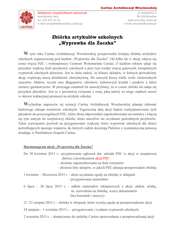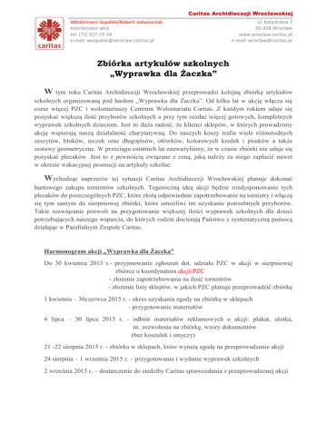 Caritas Archidiecezji Wrocławskiej Włodzimierz Sopalski/Robert Jadwiszczak koordynator akcji tel. (71) 327-13-14 e-mail: [email protected] ul. Katedralna 7 50-328 Wrocław www.wroclaw.caritas.pl e-mail: [email protected] Zbiórka artykułów szkolnych „Wyprawka dla Żaczka” W tym roku Caritas Archidiecezji Wrocławskiej przeprowadzi kolejną zbiórkę artykułów szkolnych organizowaną pod hasłem „Wyprawka dla Żaczka”. Od kilku lat w akcję włącza się coraz więcej PZC i wolontariuszy Centrum Wolontariatu Caritas. Z każdym rokiem udaje się pozyskać większą ilość przyborów szkolnych a przy tym rozdać więcej gotowych, kompletnych wyprawek szkolnych dzieciom. Jest to duża radość, że klienci sklepów, w których prowadzimy akcję wspierają naszą działalność charytatywną. Do naszych koszy trafia wiele różnorodnych zeszytów, bloków, teczek oraz długopisów, ołówków, kolorowych kredek i pisaków a także zestawy geometryczne. W przeciągu ostatnich lat zauważyliśmy, że w czasie zbiórki nie udaje się pozyskać plecaków. Jest to z pewnością związane z ceną, jaką należy za niego zapłacić nawet w okresie wakacyjnej promocji na artykuły szkolne. Wychodząc naprzeciw tej sytuacji Caritas Archidiecezji Wrocławskiej planuje dokonać hurtowego zakupu tornistrów szkolnych. Tegoroczną ideą akcji będzie rozdysponowanie tych plecaków do poszczególnych PZC, które złożą odpowiednie zapotrzebowanie na tornistry i włączą się tym samym do sierpniowej zbiórki, która umożliwi im uzyskanie potrzebnych przyborów. Takie rozwiązanie pozwoli na przygotowanie większej ilości wyprawek szkolnych dla dzieci potrzebujących naszego wsparcia, do których rodzin docierają Państwo z systematyczną pomocą działając w Parafialnym Zespole Caritas. Harmonogram akcji „Wyprawka dla Żaczka” Do 30 kwietnia 2015 r.- przyjmowanie zgłoszeń dot. udziału PZC w akcji w sierpniowej zbiórce u koordynatora akcji/PZC - złożenie zapotrzebowania na ilość tornistrów - złożenie listy sklepów, w jakich PZC planuje przeprowadzić zbiórkę 1 kwietnia – 30czerwca 2015 r. - okres uzyskania zgody na zbiórkę w sklepach - przygotowanie materiałów 6 lipca – 30 lipca 2015 r. - odbiór materiałów reklamowych o akcji: plakat, ulotka, nr. zezwolenia na zbiórkę, wzory dokumentów (bez koszulek i smyczy) 21 -22 sierpnia 2015 r. - zbiórka w sklepach, które wyrażą zgodę na przeprowadzenie akcji 24 sierpnia – 1 września 2015 r. – przygotowanie i wydanie wyprawek szkolnych 2 września 2015 r. – dostarczenie do siedziby Caritas sprawozdania z przeprowadzonej akcji