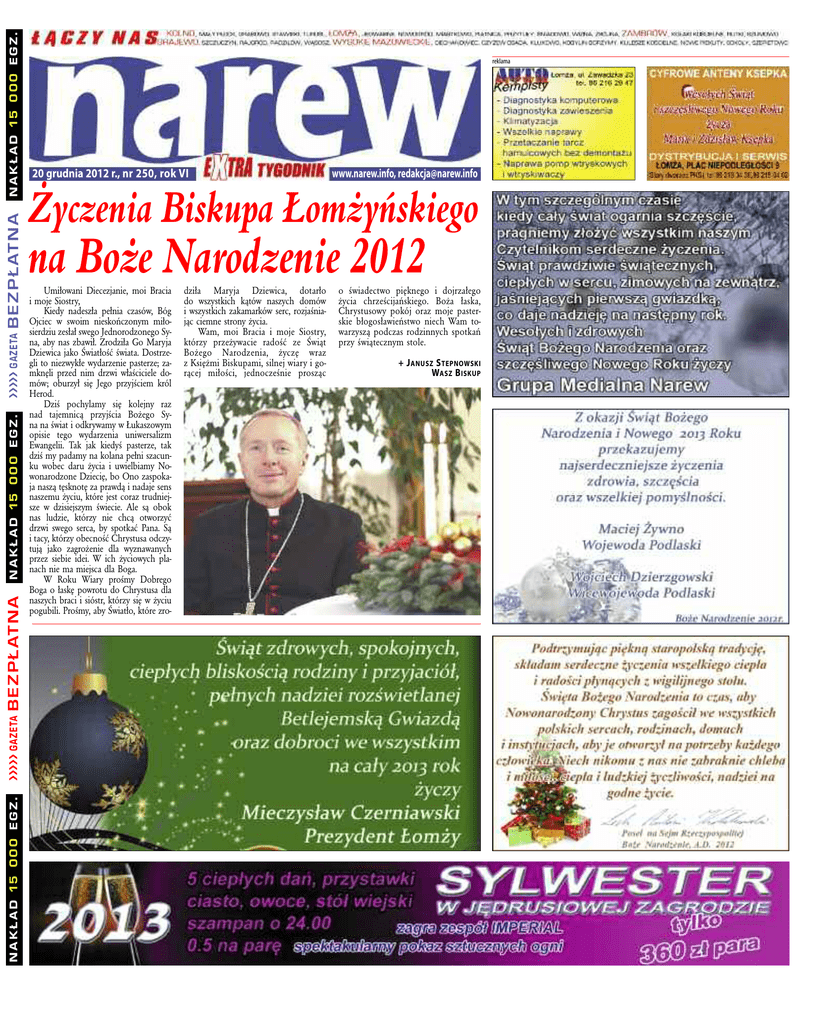 nakład 15 000 egz. ááááá gazeta B E Z P Ł AT NA nakład 15 000 egz. ááááá gazeta B E Z P Ł AT NA nakład 15 000 egz. reklama 20 grudnia 2012 r., nr 250, rok Vi www.narew.info, [email protected] ˚yczenia Biskupa Łom˝yƒskiego na Bo˝e Narodzenie 2012 Umiłowani Diecezjanie, moi Bracia i moje Siostry, Kiedy nadeszła pełnia czasów, Bóg Ojciec w swoim nieskończonym miłosierdziu zesłał swego Jednorodzonego Syna, aby nas zbawił. Zrodziła Go Maryja Dziewica jako Światłość świata. Dostrzegli to niezwykłe wydarzenie pasterze; zamknęli przed nim drzwi właściciele domów; oburzył się Jego przyjściem król Herod. Dziś pochylamy się kolejny raz nad tajemnicą przyjścia Bożego Syna na świat i odkrywamy w Łukaszowym opisie tego wydarzenia uniwersalizm Ewangelii. Tak jak kiedyś pasterze, tak dziś my padamy na kolana pełni szacunku wobec daru życia i uwielbiamy Nowonarodzone Dziecię, bo Ono zaspokaja naszą tęsknotę za prawdą i nadaje sens naszemu życiu, które jest coraz trudniejsze w dzisiejszym świecie. Ale są obok nas ludzie, którzy nie chcą otworzyć drzwi swego serca, by spotkać Pana. Są i tacy, którzy obecność Chrystusa odczytują jako zagrożenie dla wyznawanych przez siebie idei. W ich życiowych planach nie ma miejsca dla Boga. W Roku Wiary prośmy Dobrego Boga o łaskę powrotu do Chrystusa dla naszych braci i sióstr, którzy się w życiu pogubili. Prośmy, aby Światło, które zro- dziła Mary ja Dziewica, dotarło do wszystkich kątów naszych domów i wszystkich zakamarków serc, rozjaśniając ciemne strony życia. Wam, moi Bracia i moje Siostry, którzy przeżywacie radość ze Świąt Bożego Narodzenia, życzę wraz z Księżmi Biskupami, silnej wiary i gorącej miłości, jednocześnie prosząc o świadectwo pięknego i dojrzałego życia chrześcijańskiego. Boża łaska, Chrystusowy pokój oraz moje pasterskie błogosławieństwo niech Wam towarzyszą podczas rodzinnych spotkań przy świątecznym stole. + J a nusz s tep now ski wasz B i skup 2 / wydarzenia Pracowita końcówka roku w „Budowlance” uczniowie zespołu szkół technicznych i ogólnokształcących nr 4 w Łomży bardzo aktywnie spędzali przedświąteczny czas. W ramach zajęć nauczania metodami aktywnymi w ZSTiO, młodzież wzięła udział w pokazie barmańskim, warsztatach wizażu, poznała tajniki robienia sushi oraz uczestniczyła w pierwszych bardzo ciekawych warsztaty carvingu. Uczniowie zaprezentowali również całej społeczności szkoły wiele pomysłów na udekorowanie wigilijnego stołu w ramach I. Festiwalu Stołów Bożonarodzeniowych. Natomiast ostatnie zajęcia odbyły się w Hotelu Belfort w Piątnicy. Wszystkie warsztaty stworzono po to, by uczniowie sprawdzili w praktyce zdobytą do tej pory wiedzę teoretyczną. – Wychodząc z założenia, że praktyka czyni mistrza, staramy się organizować jak najwięcej zajęć, w których dominującą rolę odgrywają zajęcia praktyczne – mówi Magdalena Kuczewska, nauczycielka przedmiotów hotelarskich w ZSTiO nr 4 w Łomży. Skrupulatnie przygotowane zajęcia poprowadzili specjaliści w swoich dziedzinach. Smakołyki z ryżu i ryb z uczniami przygotowywał Mariusz Olechno z Koku Sushi Łomża. Kolejne z serii spotkań poprowadziła kosmetyczka Elżbieta Kruszewska. Również w ramach zajęć nauczania metodami aktywnymi, Sylwia Modzelewska wprowadziła uczniów w tajniki carvingu czyli sztuki tworzenia fan- 18-400 Łomża, Stary Rynek 13 e-mail: [email protected] tel./fax 86 216 71 07 reDakcJa: Paulina Korsan, Aneta Liniewska Dyrektor Biura rekLaMy i oGŁoszeŃ: Monika Strzelecka tel. 600 680 638 przeDstawicieL hanDLowy: Krzysztof Staniórski, tel. 692 892 063 e-mail: [email protected] www.narew.info „Narew Extra Tygodnik” wydawany jest na podst. umowy franchisowej z Pro Media Sp. z o.o. Redakcja nie ponosi odpowiedzialności za treść zamieszczanych ogłoszeń i zastrzega sobie prawo do skracania nadesłanych tekstów. narew extra tygodnik – Łomża n n n czwartek 20 grudnia 2012 tazyjnych wzorów w owocach i warzywach. W cieszącym się wielkim zainteresowaniem konkursie stołów bożonarodzeniowych pierwsze miejsce zajęła drużyna, która przygotowała stół nr 1. Wiele ozdób uczniowie stworzyli własnoręcznie czerpiąc pomysły z internetu. Pod czujnym okiem Hanny Bukowskiej i Magdaleny Kuczewskiej, nauczycielek przedmiotów hotelarskich, uczennice klasy I technikum hotelarskiego: Kinga Gawrychowska, Ewelina Zaniewska, Monika Chrzanowska, Katarzyna Polkowska i Magdalena Dąbkowska uczestniczyły w zajęciach zorganizowanych w Hotelu Belfort w Piątnicy. Celem warsztatów było zapoznanie uczniów z procedurami przygotowania pokoju hotelowego, poznanie kolejnych czynności oraz technik pracy wykonywanych w dziale housekeepingu. Umiejętności, zdobyte podczas zajęć praktycznych pozwolą uczniom poczuć się pewnie w Nowym Roku i z chęcią wrócić do szkoły po przerwie świątecznej. Relację telewizyjną z warsztatów odbywających się ZSTiO nr 4 w Łomży możecie oglądać w Telewizji Narew i na portalu www.narew.info. a. L. Etyczny Przedsiębiorca Roku umiejętne łączenie sfery etyki i biznesu doceniła wyższa szkoła zarządzania i przedsiębiorczości im. Bohdana Jańskiego honorując artura Filipkowskiego dyplomem uznania. właściciel Grupy Medialnej narew odebrał to wyróżnienie podczas święta szkoły z rąk jej kanclerza Dariusza Budrowskiego. – W życiu naszej uczelni są takie dni kiedy cała społeczność jednoczy się. Oczywiście są to takie uroczystości jak rozpoczęcie roku akademickiego, jego zakończenie, ale przede wszystkim święto szkoły. W ramach tego święta chcemy podziękować wspaniałym osobom, wybitnym przedsiębiorcom, którzy funkcjonują na naszym rynku i dają z siebie więcej niż inni. Dzisiaj dziękujemy panu Arturowi Filipkowskiemu, szefowi Grupy Medialnej Narew, przedsiębiorcy, który uzyskał swój status dzięki