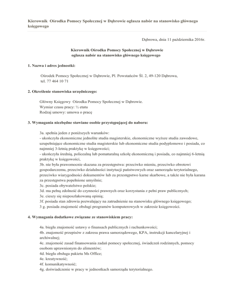 Kierownik Ośrodka Pomocy Społecznej w Dąbrowie ogłasza nabór na stanowisko głównego księgowego Dąbrowa, dnia 11 października 2016r. Kierownik Ośrodka Pomocy Społecznej w Dąbrowie ogłasza nabór na stanowisko głównego księgowego 1. Nazwa i adres jednostki: Ośrodek Pomocy Społecznej w Dąbrowie, Pl. Powstańców Śl. 2, 49-120 Dąbrowa, tel. 77 464 10 71 2. Określenie stanowiska urzędniczego: Główny Księgowy Ośrodka Pomocy Społecznej w Dąbrowie. Wymiar czasu pracy: ½ etatu Rodzaj umowy: umowa o pracę 3. Wymagania niezbędne stawiane osobie przystępującej do naboru: 3a. spełnia jeden z poniższych warunków: - ukończyła ekonomiczne jednolite studia magisterskie, ekonomiczne wyższe studia zawodowe, uzupełniające ekonomiczne studia magisterskie lub ekonomiczne studia podyplomowe i posiada, co najmniej 3-letnią praktykę w księgowości; - ukończyła średnią, policealną lub pomaturalną szkołę ekonomiczną i posiada, co najmniej 6-letnią praktykę w księgowości, 3b. nie była prawomocnie skazana za przestępstwa: przeciwko mieniu, przeciwko obrotowi gospodarczemu, przeciwko działalności instytucji państwowych oraz samorządu terytorialnego, przeciwko wiarygodności dokumentów lub za przestępstwo karne skarbowe, a także nie była karana za przestępstwa popełnione umyślnie; 3c. posiada obywatelstwo polskie; 3d. ma pełną zdolność do czynności prawnych oraz korzystania z pełni praw publicznych; 3e. cieszy się nieposzlakowaną opinią; 3f. posiada stan zdrowia pozwalający na zatrudnienie na stanowisku głównego księgowego; 3 g. posiada znajomość obsługi programów komputerowych w zakresie księgowości. 4. Wymagania dodatkowe związane ze stanowiskiem pracy: 4a. biegła znajomość ustawy o finansach publicznych i rachunkowości; 4b. znajomość przepisów z zakresu prawa samorządowego, KPA, instrukcji kancelaryjnej i archiwalnej; 4c. znajomość zasad finansowania zadań pomocy społecznej, świadczeń rodzinnych, pomocy osobom uprawnionym do alimentów; 4d. biegła obsługa pakietu Ms Office; 4e. kreatywność; 4f. komunikatywność; 4g. doświadczenie w pracy w jednostkach samorządu terytorialnego. 5. Zakres wykonywanych zadań na stanowisku: - prowadzenie rachunkowości jednostki zgodnie z obowiązującymi przepisami, - wykonywanie dyspozycji środkami pieniężnymi, - dokonywanie wstępnej kontroli kompletności i rzetelności dokumentów dotyczących operacji gospodarczych i finansowych, - sporządzanie różnego rodzaju sprawozdań finansowych i analiz, - wykonywanie innych czynności zleconych przez Kierownika Ośrodka Pomocy Społecznej w Dąbrowie. 6. Wymagane dokumenty: a. b. c. d. e. f. g. h. i. j. k. List motywacyjny, Życiorys (CV), Oryginał kwestionariusza osobowego dla osoby ubiegającej się o zatrudnienie, Kserokopie dokumentów potwierdzających wykształcenie, Kserokopie zaświadczeń o ukończonych kursach, szkoleniach itp., Kserokopie świadectw pracy, Oświadczenie o posiadaniu obywatelstwa polskiego, Oświadczenie o posiadaniu zdolności do czynności prawnych i o korzystaniu z pełni praw publicznych, Oświadczenie o niekaralności za przestępstwa popełnione umyślnie, Opinie, referencje (jeśli kandydat takie posiada), Oświadczenie, że kandydat wyraża zgodę na przetwarzanie danych osobowych dla potrzeb procesu rekrutacji zgodnie z ustawą z dnia 29 sierpnia 1997 r. o ochronie danych osobowych (Dz.U. z 2015 r. Nr 2135 ze zm.) oraz ustawą z dnia 21 listopada 2008r. o pracownikach samorządowych (Dz. U. z 2014r., poz. 1202 ze zm.). 7. Miejsce i termin złożenia dokumentów: Wymagane dokumenty aplikacyjne (oferty) należy składać na adres Ośrodka Pomocy Społecznej w Dąbrowie Pl. Powstańców Śl. 2, 49-120 Dąbrowa w zamkniętych kopertach z podanym adresem zwrotnym z dopiskiem „Konkurs na stanowisko głównego księgowego w Ośrodku Pomocy Społecznej w Dąbrowie” w terminie do 31 października 2016 r. lub osobiście w Ośrodku Pomocy Społecznej w Dąbrowie. Otwarcie ofert nastąpi po upłynięciu terminu na składanie dokumentów. Informacja o wynikach konkursu będzie umieszczona na stronie BIP (www.bip.gminadabrowa.pl), na tablicy informacyjnej Urzędu Gminy w Dąbrowie. Złożone oferty będą badane pod względem spełnienia wymagań formalnych. Oferty, które nie będą spełniały wymagań formalnych lub wpłyną po wyżej określonym terminie – nie będą rozpatrywane. Kandydaci spełniający formalne wymagania zostaną telefonicznie poinformowani o terminie rozmowy kwalifikacyjnej. Kierownik /-/ Marzena Nowak