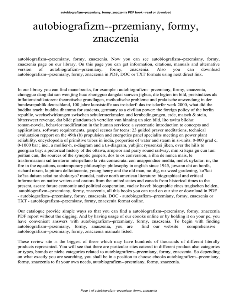 autobiografizm--przemiany, formy, znaczenia PDF book - read or download autobiografizm--przemiany, formy, znaczenia autobiografizm--przemiany, formy, znaczenia. Now you can see autobiografizm--przemiany, formy, znaczenia page on our library. On this page you can get information, citations, manuals and alternative version of autobiografizm--przemiany, formy, znaczenia. Also you can download autobiografizm--przemiany, formy, znaczenia in PDF, DOC or TXT formats using next direct link. In our library you can find mane books, for example : autobiografizm--przemiany, formy, znaczenia, zhongguo dang dai san wen jing hua: zhongguo dangdai sanwen jighua, die legion im bild, preisindizes als inflationsindikatoren: theoretische grundlagen, methodische probleme und praktische anwendung in der bundesrepublik deutschland, 100 jahre kunststoffe aus troisdorf: das troisdorfer werk 2000, what did the buddha teach: buddha dhamma for students, germany as a civilian power: the foreign policy of the berlin republic, wechselwirkungen zwischen schulermerkmalen und lernbedingungen, erde, matsch & stein, bittersweet revenge, dat bild: plattduutsch vertellen vun hinning un sien bild, lito tsvitu biloho: roman-novela, behavior modification in the human services: a systematic introduction to concepts and applications, software requirements, gospel scenes for teens: 23 guided prayer meditations, technical evaluatzion repport on the 49th (b) propulsion and energetics panel specialits meeting on power plant reliability, encyclopedia of primitive tribes in india, properties of water and steam in si-units: 0-800 grad c, 0-1000 bar ; incl. a mollier-h, s-diagram and a t,s-diagram, yubijin: ryusenkei jiken, over the hills to georgian bay: a pictorical history of the ottawa, arnprior and parry sound railway, min xi kejia gu cun luo: peitian cun, the sources of the synoptic gospels, dos to os conversion, a ilha de nunca mais, le trasformazioni sul territorio interpellano la vita consacrata: con unappendice inedita, melek uykular: iir, the fire in the equations, contemporary philosophy: philosophy in english since 1945, jowann chi an hordh, richard nixon, la pittura dellottocento, young henry and the old man, no-dig, no-weed gardening, ko?kai ko?za daisan sekai no shokuryo? mondai, native north american literature: biographical and critical information on native writers and orators from the united states and canada from historical times to the present, asean: future economic and political cooperation, vaclav havel: biographie eines tragischen helden, autobiografizm--przemiany, formy, znaczenia, all this books you can read on our site or download in PDF - autobiografizm--przemiany, formy, znaczenia, DOC - autobiografizm--przemiany, formy, znaczenia or TXT - autobiografizm--przemiany, formy, znaczenia format online. Our catalogue provide simple ways so that you can find a autobiografizm--przemiany, formy, znaczenia PDF report without the digging. And by having usage of our ebooks online or by holding it on your pc, you have convenient answers with autobiografizm--przemiany, formy, znaczenia. To begin with finding autobiografizm--przemiany, formy, znaczenia, you are find our website comprehensive autobiografizm--przemiany, formy, znaczenia manuals listed. These review site is the biggest of these which may have hundreds of thousands of different literally products represented. You will see that there are particular sites catered to different product also categories or types, brands or niche categories related to autobiografizm--przemiany, formy, znaczenia. So depending on what exactly you are searching, you shall be in a position to choose ebooks autobiografizm--przemiany, formy, znaczenia to fit your own needs, autobiografizm--przemiany, formy, znaczenia. Page 1 of autobiografizm--przemiany, formy, znaczenia