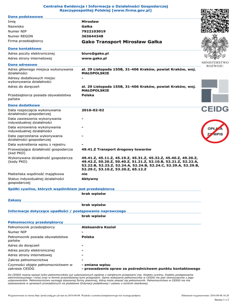 Centralna Ewidencja i Informacja o Działalności Gospodarczej Rzeczypospolitej Polskiej [www.firma.gov.pl] Dane podstawowe Imię Mirosław Nazwisko Gałka Numer NIP 7922103019 Numer REGON 363644348 Firma przedsiębiorcy Gako Transport Mirosław Gałka Dane kontaktowe Adres poczty elektronicznej [email protected] Adres strony internetowej www.gako.pl Dane adresowe Adres głównego miejsca wykonywania działalności al. 29 Listopada 155B, 31406 Kraków, powiat Kraków, woj. MAŁOPOLSKIE Adresy dodatkowych miejsc wykonywania działalności Adres do doręczeń al. 29 Listopada 155B, 31406 Kraków, powiat Kraków, woj. MAŁOPOLSKIE Przedsiębiorca posiada obywatelstwa państw Polska Dane dodatkowe Data rozpoczęcia wykonywania działalności gospodarczej 20160202 Data zawieszenia wykonywania indywidualnej działalności Data wznowienia wykonywania indywidualnej działalności Data zaprzestania wykonywania działalności gospodarczej Data wykreślenia wpisu z rejestru Przeważająca działalność gospodarcza (kod PKD) 49.41.Z Transport drogowy towarów Wykonywana działalność gospodarcza (kody PKD) 49.41.Z, 45.11.Z, 45.19.Z, 45.31.Z, 45.32.Z, 45.40.Z, 49.20.Z, 49.42.Z, 50.20.Z, 50.40.Z, 51.21.Z, 52.10.B, 52.21.Z, 52.22.A, 52.22.B, 52.23.Z, 52.24.A, 52.24.B, 52.24.C, 52.29.A, 52.29.B, 52.29.C, 53.10.Z, 53.20.Z, 65.12.Z Małżeńska wspólność majątkowa nie Status indywidualnej działalności gospodarczej Aktywny Spółki cywilne, których wspólnikiem jest przedsiębiorca brak wpisów Zakazy brak wpisów Informacje dotyczące upadłości / postępowania naprawczego brak wpisów Pełnomocnicy przedsiębiorcy Pełnomocnik przedsiębiorcy Aleksandra Kozioł Numer NIP Pełnomocnik posiada obywatelstwa państw Polska Adres do doręczeń Adres poczty elektronicznej Adres strony internetowej Zakres pełnomocnictwa Czynności objęte pełnomocnictwem w zakresie CEIDG zmiana wpisu prowadzenie spraw za pośrednictwem punktu kontaktowego Do CEIDG można wpisać tylko pełnomocników już ustanowionych zgodnie z odrębnymi przepisami (np. Kodeks cywilny, Kodeks postępowania administracyjnego i inne) oraz w formie przewidzianej tymi przepisami. Samo wskazanie pełnomocnika w CEIDG nie jest równoznaczne z jego ustanowieniem. Pełnomocnictwo wymaga stosownej formy pisemnej, którą może okazać się pełnomocnik. Pełnomocnictwo w CEIDG nie ma zastosowania w sprawach prowadzonych na podstawie Ordynacji podatkowej i ustawy o kontroli skarbowej. Wygenerowano ze strony http://prod.ceidg.gov.pl stan na 2016-08-08. Wydruk z systemu komputerowego nie wymaga podpisu. Dokument wygenerowano: 2016-08-08 16:28 Strona 1 z 2 W celu sprawdzenia aktualnego stanu wpisu należy odszukać wpis w systemie CEIDG (www.firma.gov.pl) WPIS DO CEIDG JEST WOLNY OD OPŁAT Zgodnie z art. 33 ustawy o swobodzie działalności gospodarczej Domniemywa się, że dane wpisane do CEIDG są prawdziwe. Jeżeli do CEIDG wpisano dane niezgodnie z wnioskiem lub bez tego wniosku, osoba wpisana do CEIDG nie może zasłaniać się wobec osoby trzeciej, działającej w dobrej wierze, zarzutem, że dane te nie są prawdziwe, jeżeli po powzięciu informacji o tym wpisie zaniedbała wystąpić niezwłocznie z wnioskiem o sprostowanie, uzupełnienie lub wykreślenie wpisu. Niniejszy wydruk jest zgodny z art. 38 ust. 4 ustawy o swobodzie działalności gospodarczej z dnia 2 lipca 2004 r. i ma moc zaświadczenia o wpisie w Centralnej Ewidencji i Informacji o Działalności Gospodarczej RP. Art. 38 ust. 5 ustawy o swobodzie działalności gospodarczej Organy administracji publicznej nie mogą domagać się od przedsiębiorców okazywania, przekazywania lub załączania do wniosków zaświadczeń o wpisie w CEIDG. Wygenerowano ze strony http://prod.ceidg.gov.pl stan na 2016-08-08. Wydruk z systemu komputerowego nie wymaga podpisu. Dokument wygenerowano: 2016-08-08 16:28 Strona 2 z 2
