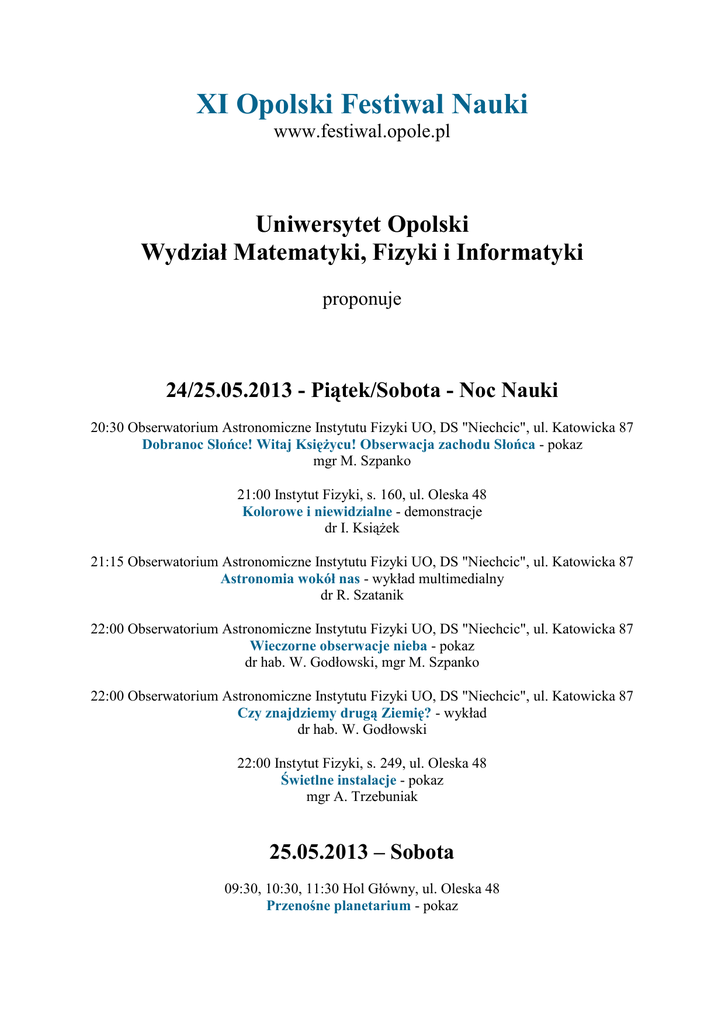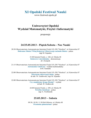 XI Opolski Festiwal Nauki www.festiwal.opole.pl Uniwersytet Opolski Wydział Matematyki, Fizyki i Informatyki proponuje 24/25.05.2013 - Piątek/Sobota - Noc Nauki 20:30 Obserwatorium Astronomiczne Instytutu Fizyki UO, DS "Niechcic", ul. Katowicka 87 Dobranoc Słońce! Witaj Księżycu! Obserwacja zachodu Słońca - pokaz mgr M. Szpanko 21:00 Instytut Fizyki, s. 160, ul. Oleska 48 Kolorowe i niewidzialne - demonstracje dr I. Książek 21:15 Obserwatorium Astronomiczne Instytutu Fizyki UO, DS "Niechcic", ul. Katowicka 87 Astronomia wokół nas - wykład multimedialny dr R. Szatanik 22:00 Obserwatorium Astronomiczne Instytutu Fizyki UO, DS "Niechcic", ul. Katowicka 87 Wieczorne obserwacje nieba - pokaz dr hab. W. Godłowski, mgr M. Szpanko 22:00 Obserwatorium Astronomiczne Instytutu Fizyki UO, DS "Niechcic", ul. Katowicka 87 Czy znajdziemy drugą Ziemię? - wykład dr hab. W. Godłowski 22:00 Instytut Fizyki, s. 249, ul. Oleska 48 Świetlne instalacje - pokaz mgr A. Trzebuniak 25.05.2013 – Sobota 09:30, 10:30, 11:30 Hol Główny, ul. Oleska 48 Przenośne planetarium - pokaz 26.05.2013 - Niedziela - Piknik Naukowy (pl. Kopernika) 10:00 – 15:00 Fizyczny Świat - eksperyment dr E. Pawelec, mgr A. Trzebuniak, dr A. Bartecka, dr G. Engel, dr I. Książek, mgr M. Szpanko, studenci Koła Naukowego Fizyków 10:00 – 14:00 Matematyczny turniej gier i zabaw - pokaz, konkurs, zabawa mgr K. Kowalska, dr P. Nowak i studenci Naukowego Koła Matematyków 10:00 – 14:00 Pokazy Koła Naukowego Informatyków mgr inż. K. Wojtkiewicz, mgr P. Knosalla, mgr R. Lubczyk i studenci Koła Naukowego Informatyków 26.05.2013 - Niedziela 11:00, 12:00 Opolskie Centrum Onkologii, ul. Katowicka 66A Fizyka w medycynie - prezentacja i zwiedzanie mgr M. Bieniasiewicz, mgr J. Wendykier 11:00 Instytut Matematyki i Informatyki, sale 110 i 104 (wejście od ul. Czaplaka) Matematyka we wzornictwie przemysłowym - wykład i warsztaty T. Michael - student matematyki pod opieką dr J. Napiórkowskiej 27.05.2013 - Poniedziałek - Dzień Otwarty 09:00, 9:45, 10:30 Instytut Matematyki i Informatyki, sale 1, 4 i 105, ul. Oleska 48 Jedno przedpołudnie z życia studenta matematyki wykład, konwersatorium, laboratorium Pracownicy Katedry Analizy Matematycznej 09:00 Instytut Fizyki, s. 185, ul. Oleska 48 Ten przeklęty motylek - wykład dr E. Pawelec 09:00 Instytut Fizyki, s. 160, ul. Oleska 48 Trzeci żywioł – atmosfera ziemska wykład prof. dr hab. J. Musielok 09:00 Instytut Fizyki, s. 259, ul. Oleska 48 Aktualne (filozoficzne) problemy mechaniki kwantowej - wykład dr hab. R. Pietrzak 09:00 Instytut Fizyki, s. 260, ul. Oleska 48 Szybciej, wyżej, dalej – sport i fizyka wykład dr A. Bacławski 09:00, 10:00, 11:00 Instytut Fizyki, s. 249, ul. Oleska 48 Pasjonujący fizycy i inspirujące doświadczenia - demonstracje mgr A. Trzebuniak 09:00, 10:00, 11:00 Instytut Fizyki, sale 165, 166, 166a, ul. Oleska 48 Niezwykłe doświadczenia z fizyki - pokaz dr A. Bartecka, dr G. Engel, mgr A. Wolf 09:00 Instytut Matematyki i Informatyki, sala 110 (wejście od ul. Czaplaka) Praktyczne aspekty wirtualizacji - wykład multimedialny dr inż. M. Gola, dr inż. A. Czubak 09:00 Instytut Matematyki i Informatyki, sala 3, ul. Oleska 48 Problem sznurowadeł - wykład multimedialny mgr K. Kowalska 09:30 Aula B i teren kampusu, ul. Oleska 48 V Matematyczna Gra Terenowa - konkurs dr P. Nowak i studenci Naukowego Koła Matematyki 10:00 Instytut Fizyki, s. 260, ul. Oleska 48 Czy czasoprzestrzeń to czterowymiarowa przestrzeń Euklidesa? - wykład dr hab. W. Olchawa 10:00 Instytut Matematyki i Informatyki, sala 3, ul. Oleska 48 Czy nasze oczy mogą kłamać? - wykład multimedialny i konkurs dr J. Michael 10:00 Instytut Fizyki, s. 185, ul. Oleska 48 Tarcie w nanoskali - wykład prof. dr hab. inż. J. Dryzek 10:00 Instytut Fizyki, s. 259, ul. Oleska 48 Jak mierzymy odległości ciał niebieskich - wykład dr R. Szatanik 10:00 Instytut Fizyki, s. 160, ul. Oleska 48 Najcieplejsze miejsce w Układzie Słonecznym - wykład dr I. Książek 10:00 Instytut Matematyki i Informatyki, sale 110, 102, 104, 106 (wejście od ul. Czaplaka) Morfing, czyli jak przemienić się w inną postać? - wykład i warsztaty dr inż. G. Suchacka 10:00 Aula B, ul. Oleska 48 Opolski Konkurs Matematyczny (dla szkół ponadgimnazjalnych) dr J. Napiórkowska, dr A. Spakowski 11:00 Instytut Fizyki, s. 260, ul. Oleska 48 Najważniejsze zagadnienia współczesnej astronomii - wykład dr hab. W. Godłowski 11:00 Instytut Fizyki, s. 185, ul. Oleska 48 Zobaczyć dźwięk - wykład dr H. Janus 11:00 Instytut Fizyki, s. 259, ul. Oleska 48 Gdy temperatura się zmienia… - prezentacja z pokazem dr K. Książek 11:00 Obserwatorium Astronomiczne Instytutu Fizyki UO, DS "Niechcic", ul. Katowicka 87 Obserwacje Słońca w Obserwatorium Astronomicznym Instytutu Fizyki UO - pokaz mgr M. Szpanko 11:00, 12:00 Instytut Matematyki i Informatyki, sala 110 (wejście od ul. Czaplaka) Lego Mindstorms, czyli co mikrokontroler robi w klockach Lego - wykład multimedialny dr J. Iwański 11:00 Instytut Matematyki i Informatyki, sala 3, ul. Oleska 48 Gdzie podział się ten kot? Czyli kilka słów na temat steganografii - wykład multimedialny dr A. Jasiński 11:00 Instytut Matematyki i Informatyki, sala 1, ul. Oleska 48 Matematyczne sztuczki karciane - demonstracje dr P. Nowak, mgr P. Knosalla, mgr R. Lubczyk 11:30 Instytut Matematyki i Informatyki, sale 4 i 105, ul. Oleska 48 Matematyka we wzornictwie przemysłowym - wykład i warsztaty T. Michael - student matematyki pod opieką dr J. Napiórkowskiej 12:00 Instytut Fizyki, s. 259, ul. Oleska 48 Wybrane współczesne zastosowania piroelektryków - wykład dr hab. K. Biedrzycki 12:00 Instytut Fizyki, s. 260, ul. Oleska 48 Jaki związek ma ludzkie DNA z miarą ilości informacji? - wykład dr hab. R. Piasecki 12:00 Instytut Matematyki i Informatyki, sala 3, ul. Oleska 48 Dlaczego warto zabezpieczyć swoją sieć bezprzewodową? - prezentacja mgr inż. J. Wojtanows