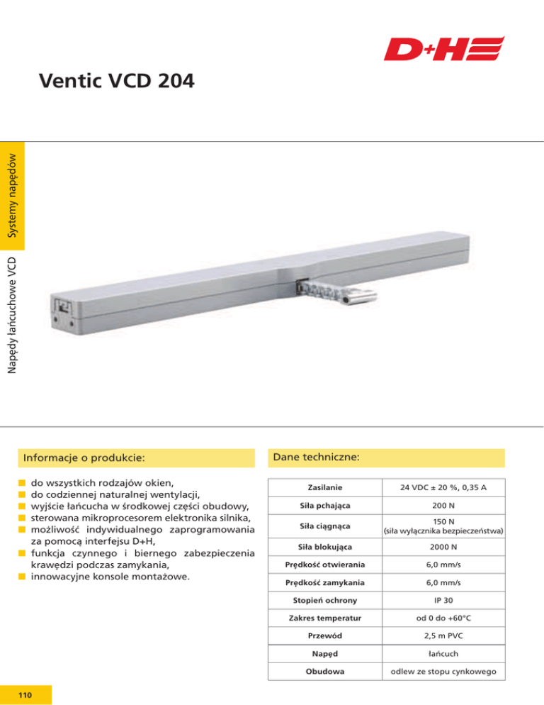 Napędy łańcuchowe VCD Systemy napędów Ventic VCD 204 Informacje o produkcie: N N N N N do wszystkich rodzajów okien, do codziennej naturalnej wentylacji, wyjście łańcucha w środkowej części obudowy, sterowana mikroprocesorem elektronika silnika, możliwość indywidualnego zaprogramowania za pomocą interfejsu D+H, N funkcja czynnego i biernego zabezpieczenia krawędzi podczas zamykania, N innowacyjne konsole montażowe. 110 Dane techniczne: Zasilanie 24 VDC ± 20 %, 0,35 A Siła pchająca 200 N Siła ciągnąca 150 N (siła wyłącznika bezpieczeństwa) Siła blokująca 2000 N Prędkość otwierania 6,0 mm/s Prędkość zamykania 6,0 mm/s Stopień ochrony IP 30 Zakres temperatur od 0 do +60°C Przewód 2,5 m PVC Napęd łańcuch Obudowa odlew ze stopu cynkowego Napędy łańcuchowe VCD Systemy napędów Przykład zastosowania: Zestawy konsol należy zamawiać oddzielnie. Parametry: – do okien fasadowych i połaciowych oraz klap przewietrzających w oranżeriach, – niewielki pobór mocy, – sterowana mikroprocesorem elektronika silnika, – możliwość programowania funkcji napędu, właściwości oraz długości wysuwu łańcucha, – bardzo cicha praca silnika, – wyłącznik bezpieczeństwa z redukcją siły zamykania, – czynna i bierna ochrona podczas zamykania z możliwością rozszerzenia na całą ramę, – funkcja TMS+ do synchronizacji dwóch napędów na jednym oknie, – programowanie wysuwu za pomocą magnesu, – zaprogramowany wysuw jest przesyłany do napędu tandemowego, – funkcja odciążenia uszczelki po zamknięciu okna, – testowany na 10 000 cykli pracy przy obciążeniu znamionowym, – proste podłączenie za pomocą łącznika wtykowego, – możliwość lakierowania proszkowego we wszystkich kolorach, również tych spoza palety RAL, – dostępne różne opcje, np. sygnalizacja położenia i stanu, – konsole montażowe bez widocznych śrub oraz części metalowych. Typ Nr art. Waga [kg] Wysuw [mm] Kolor Uwagi VCD 204/250 25.100.05 1,50 250 srebrny ~ RAL 9006 VCD 204/350 25.100.10 1,50 350 srebrny ~ RAL 9006 VCD 204/250 25.100.06 1,50 250 biały ~ RAL 9016 VCD 204/350 25.100.11 1,50 350 biały ~ RAL 9016 VCD 204/250 25.100.07 1,50 250 czarny ~ RAL 9005 VCD 204/350 25.100.12 1,50 350 czarny ~ RAL 9005 111