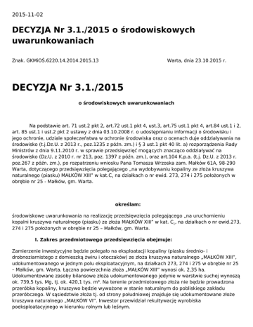 2015-11-02 DECYZJA Nr 3.1./2015 o środowiskowych uwarunkowaniach Znak. GKMiOŚ.6220.14.2014.2015.13 Warta, dnia 23.10.2015 r. DECYZJA Nr 3.1./2015 o środowiskowych uwarunkowaniach Na podstawie art. 71 ust.2 pkt 2, art.72 ust.1 pkt 4, ust.3, art.75 ust.1 pkt 4, art.84 ust.1 i 2, art. 85 ust.1 i ust.2 pkt 2 ustawy z dnia 03.10.2008 r. o udostępnianiu informacji o środowisku i jego ochronie, udziale społeczeństwa w ochronie środowiska oraz o ocenach duje oddziaływania na środowisko (t.j.Dz.U. z 2013 r., poz.1235 z późn. zm.) i § 3 ust.1 pkt 40 lit. a) rozporządzenia Rady Ministrów z dnia 9.11.2010 r. w sprawie przedsięwzięć mogących znacząco oddziaływać na środowisko (Dz.U. z 2010 r. nr 213, poz. 1397 z późn. zm.), oraz art.104 K.p.a. (t.j. Dz.U. z 2013 r. poz.267 z późn. zm.), po rozpatrzeniu wniosku Pana Tomasza Wrzoska zam. Małków 61A, 98-290 Warta, dotyczącego przedsięwzięcia polegającego „na wydobywaniu kopaliny ze złoża kruszywa naturalnego (piasku) MAŁKÓW XIII” w kat.C1 na działkach o nr ewid. 273, 274 i 275 położonych w obrębie nr 25 - Małków, gm. Warta. określam: środowiskowe uwarunkowania na realizację przedsięwzięcia polegającego „na uruchomieniu kopalni kruszywa naturalnego (piasku) ze złoża MAŁKÓW XIII” w kat. C1, na działkach o nr ewid.273, 274 i 275 położonych w obrębie nr 25 – Małków, gm. Warta. I. Zakres przedmiotowego przedsięwzięcia obejmuje: Zamierzenie inwestycyjne będzie polegało na eksploatacji kopaliny (piasku średnio- i drobnoziarnistego z domieszką żwiru i otoczaków) ze złoża kruszywa naturalnego „MAŁKÓW XIII”, udokumentowanego w jednym polu eksploatacyjnym, na działkach 273, 274 i 275 w obrębie nr 25 – Małków, gm. Warta. Łączna powierzchnia złoża „MAŁKÓW XIII” wynosi ok. 2,35 ha. Udokumentowane zasoby bilansowe złoża udokumentowanego jedynie w warstwie suchej wynoszą ok. 739,5 tys. Mg, tj. ok. 420,1 tys. m³. Na terenie przedmiotowego złoża nie będzie prowadzona przeróbka kopaliny, kruszywo będzie wywożone w stanie naturalnym do pobliskiego zakładu przeróbczego. W sąsiedztwie złoża tj. od strony południowej znajduje się udokumentowane złoże kruszywa naturalnego „MAŁKÓW VI”. Inwestor przewidział rekultywację wyrobiska poeksploatacyjnego w kierunku rolnym lub leśnym. II. Na etapie realizacji i eksploatacji lub użytkowania przedsięwzięcia należy podjąć następujące działania: 1. Naprawy sprzętu i przeglądy techniczne pojazdów mechanicznych będą odbywały się poza wyznaczonym obszarem górniczym, realizowane będą przez zewnętrzne firmy specjalistyczne, które będą odpowiedzialne za odpowiednie postępowanie z powstałymi w ich trakcie odpadami. 2. Tankowanie maszyn oraz bieżące konserwacje należy prowadzić na wyznaczonym utwardzonym podłożu, zabezpieczonym przed przenikaniem substancji ropopochodnych do środowiska. 3. Zakład górniczy należy wyposażyć w sorbenty przystosowane do likwidacji wycieków substancji ropopochodnych. 4. W przypadku wycieku do gruntu substancji niebezpiecznej, zanieczyszczony grunt należy zebrać i przekazać odbiorcy posiadającemu stosowne zezwolenia w zakresie jego dalszego zagospodarowania. 5. W celu ograniczenia pylenia do środowiska należy stosować plandeki na pojazdach transportujących kruszywo. 6. Należy zaplanować nie więcej niż 30 wyjazdów ze złoża pojazdów transportujących kopalinę w ciągu dnia. 7. Transport kruszywa z kopalni będzie się odbywał po prywatnych działkach do Zakładu przeróbczego, a następnie drogą gminną oznaczoną nr ewid. 204 położonej w m. Małków, w kierunku wschodnim do drogi krajowej nr DK83-G relacji Sieradz - Turek. 8. Działalność zakładu górniczego (w tym wywóz kopaliny) będzie się odbywała jedynie w porze dziennej, tj. maksymalnie w godz. 6°°-22°°. 9. Odpady powstające w trakcie realizacji i eksploatacji inwestycji należy segregować i gromadzić w przeznaczonych do tego pojemnikach. Odpady niebezpieczne jakie mogą powstać, należy segregować i oddzielać od odpadów obojętnych i innych niż obojętne celem wywozu przez wyspecjalizowane podmioty zajmujące się ich zagospodarowaniem. 10. Należy zrealizować zaplecze socjalno-bytowe w granicach terenu górniczego składające z budynku socjalnego oraz przenośnej kabiny sanitarnej. 11. Wyrobisko oraz zwałowiska należy kontrolować na obecność w ich obrębie zwierząt; w przypadku zasiedlenia terenu wyrobiska przez chronione gatunki ( np. płazy lub ptaki), należy wstrzymać się z prowadzeniem prac w tej części, tak by zapobiec zabijaniu i okaleczaniu osobników, niszczeniu jaj i innych form rozwojowych, płoszeniu, niepokojeniu zwierząt oraz niszczeniu ich siedlisk. W przypadku uzasadnionej konieczności zniszczenia siedliska chronionych gatunków, przenoszenia osobników gatunków chronionych lub w przypadku zamiaru podjęcia innych czynności mających wpływ na gatunki chronione, należy przedtem uzyskać stosowne zezwolenie właściwego organu na odstępstwa od zakazów w stosunku do gatunków objętych ochroną, a prace przeprowadzić zgodnie z warunkami określonymi w zezwoleniu; ewentualne przenoszenie osobników gatunków chronionych powinno odbywać się pod nadzorem przyrodniczym. 12. Teren wyrobiska górniczego należy oznakować tablicami informacyjnymi, na których zamieścić należy informację o zakazie wstępu osób nieupoważnionych. 13. Pionowy zasięg eksploatacji winien podlegać systematycznej kontroli mierniczej szczególnie w rejonie skarp wyrobiska eksploatacyjnego, tak aby nie doszło do naruszenia stateczności złoża. 14. Rekultywację wyrobiska pogórniczego należy prowadzić na podstawie obowiązujących przepisów prawa, po uzgodnieniu z odpowiednim organem administracji. III. W dokumentacji wymaganej do wydania decyzji określającej szczegółowe warunki wydobywania kopaliny należy uwzględnić następujące wymaga