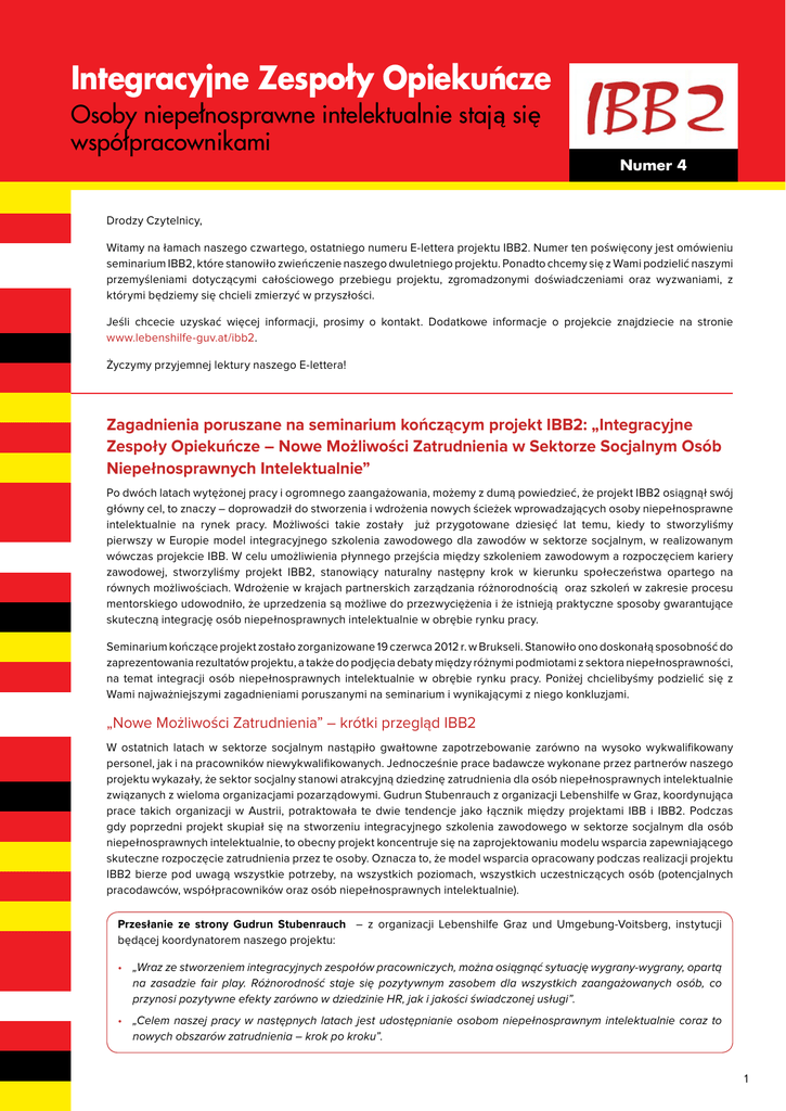 Integracyjne Zespoły Opiekuńcze Osoby niepełnosprawne intelektualnie stają się współpracownikami Numer 4 Drodzy Czytelnicy, Witamy na łamach naszego czwartego, ostatniego numeru E-lettera projektu IBB2. Numer ten poświęcony jest omówieniu seminarium IBB2, które stanowiło zwieńczenie naszego dwuletniego projektu. Ponadto chcemy się z Wami podzielić naszymi przemyśleniami dotyczącymi całościowego przebiegu projektu, zgromadzonymi doświadczeniami oraz wyzwaniami, z którymi będziemy się chcieli zmierzyć w przyszłości. Jeśli chcecie uzyskać więcej informacji, prosimy o kontakt. Dodatkowe informacje o projekcie znajdziecie na stronie www.lebenshilfe-guv.at/ibb2. Życzymy przyjemnej lektury naszego E-lettera! Zagadnienia poruszane na seminarium kończącym projekt IBB2: „Integracyjne Zespoły Opiekuńcze – Nowe Możliwości Zatrudnienia w Sektorze Socjalnym Osób Niepełnosprawnych Intelektualnie” Po dwóch latach wytężonej pracy i ogromnego zaangażowania, możemy z dumą powiedzieć, że projekt IBB2 osiągnął swój główny cel, to znaczy – doprowadził do stworzenia i wdrożenia nowych ścieżek wprowadzających osoby niepełnosprawne intelektualnie na rynek pracy. Możliwości takie zostały już przygotowane dziesięć lat temu, kiedy to stworzyliśmy pierwszy w Europie model integracyjnego szkolenia zawodowego dla zawodów w sektorze socjalnym, w realizowanym wówczas projekcie IBB. W celu umożliwienia płynnego przejścia między szkoleniem zawodowym a rozpoczęciem kariery zawodowej, stworzyliśmy projekt IBB2, stanowiący naturalny następny krok w kierunku społeczeństwa opartego na równych możliwościach. Wdrożenie w krajach partnerskich zarządzania różnorodnością oraz szkoleń w zakresie procesu mentorskiego udowodniło, że uprzedzenia są możliwe do przezwyciężenia i że istnieją praktyczne sposoby gwarantujące skuteczną integrację osób niepełnosprawnych intelektualnie w obrębie rynku pracy. Seminarium kończące projekt zostało zorganizowane 19 czerwca 2012 r. w Brukseli. Stanowiło ono doskonałą sposobność do zaprezentowania rezultatów projektu, a także do podjęcia debaty między różnymi podmiotami z sektora niepełnosprawności, na temat integracji osób niepełnosprawnych intelektualnie w obrębie rynku pracy. Poniżej chcielibyśmy podzielić się z Wami najważniejszymi zagadnieniami poruszanymi na seminarium i wynikającymi z niego konkluzjami. „Nowe Możliwości Zatrudnienia” – krótki przegląd IBB2 W ostatnich latach w sektorze socjalnym nastąpiło gwałtowne zapotrzebowanie zarówno na wysoko wykwalifikowany personel, jak i na pracowników niewykwalifikowanych. Jednocześnie prace badawcze wykonane przez partnerów naszego projektu wykazały, że sektor socjalny stanowi atrakcyjną dziedzinę zatrudnienia dla osób niepełnosprawnych intelektualnie związanych z wieloma organizacjami pozarządowymi. Gudrun Stubenrauch z organizacji Lebenshilfe w Graz, koordynująca prace takich organizacji w Austrii, potraktowała te dwie tendencje jako łącznik między projektami IBB i IBB2. Podczas gdy poprzedni projekt skupiał się na stworzeniu integracyjnego szkolenia zawodowego w sektorze socjalnym dla osób niepełnosprawnych intelektualnie, to obecny projekt koncentruje się na zaprojektowaniu modelu wsparcia zapewniającego skuteczne rozpoczęcie zatrudnienia przez te osoby. Oznacza to, że model wsparcia opracowany podczas realizacji projektu IBB2 bierze pod uwagą wszystkie potrzeby, na wszystkich poziomach, wszystkich uczestniczących osób (potencjalnych pracodawców, współpracowników oraz osób niepełnosprawnych intelektualnie). Przesłanie ze strony Gudrun Stubenrauch – z organizacji Lebenshilfe Graz und Umgebung-Voitsberg, instytucji będącej koordynatorem naszego projektu: • „Wraz ze stworzeniem integracyjnych zespołów pracowniczych, można osiągnąć sytuację wygrany-wygrany, opartą na zasadzie fair play. Różnorodność staje się pozytywnym zasobem dla wszystkich zaangażowanych osób, co przynosi pozytywne efekty zarówno w dziedzinie HR, jak i jakości świadczonej usługi”. • „Celem naszej pracy w następnych latach jest udostępnianie osobom niepełnosprawnym intelektualnie coraz to nowych obszarów zatrudnienia – krok po kroku”. 1 Strategia Unii Europejskiej Dotycząca Niepełnosprawności i Zatrudnienia Ramy polityki Unii Europejskiej w dziedzinie niepełnosprawności zostały krótko omówione przez pana Mangiat, reprezentującego Departament Sprawiedliwości – Wydział 3: Prawa Osób Niepełnosprawnych. Akcent padł na działanie UE w dziedzinie zatrudnienia, zwłaszcza dotyczącego instrumentów podtrzymujących zatrudnienie wspierane. Omówiono także kilka rekomendacji zmierzających do doskonalenia zatrudnienia wspieranego oraz poziomów jego dostępności dla osób niepełnosprawnych na otwartym rynku pracy. Przesłanie ze strony pana Mangiat: • „Po to, by zapewnić udział w rynku pracy dla wszystkich, należy stworzyć ramy polityki wspierającej. Oznacza to, między innymi, wsparcie i szkolenia dla profesjonalnych trenerów pracy, zachęty motywacyjne dla pracodawców, wsparcie dla osób niepełnosprawnych według zasady uczenia się przez całe życie, a także okresowe monitorowanie i zbieranie danych statystycznych.” Gestión de la diversidad en el contexto de la inserción en el mercado laboral para las personas con discapacidad Beatrice Achaleke z organizacji Diversity in Leadership&Consulting e.U. wyjaśniła znaczenie pojęcia “zarządzanie różnorodnością”. Definiując pojęcie zarządzania różnorodnością należy je odnieść do wszystkich strategii i pojęć, które promują różnorodność jako pozytywną wartość w przedsiębiorstwach, organizacjach i stowarzyszeniach oraz do związanych z tym środków wspierających uznanie dla różnorodności. Jednym słowem, „różnorodność” powinna być traktowana nie