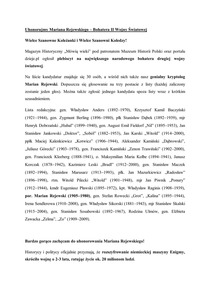 Uhonorujmy Mariana Rejewskiego – Bohatera II Wojny Światowej Wielce Szanowne Koleżanki i Wielce Szanowni Koledzy! Magazyn Historyczny „Mówią wieki” pod patronatem Muzeum Historii Polski oraz portalu dzieje.pl ogłosił plebiscyt na największego narodowego bohatera drugiej wojny światowej. Na liście kandydatur znajduje się 30 osób, a wśród nich także nasz genialny kryptolog Marian Rejewski. Dopuszcza się głosowanie na trzy postacie z listy (każdej zaliczony zostanie jeden głos). Można także zgłosić jednego kandydata spoza listy wraz z krótkim uzasadnieniem. Lista redakcyjna: gen. Władysław Anders (18921970), Krzysztof Kamil Baczyński (19211944), gen. Zygmunt Berling (18961980), płk Stanisław Dąbek (18921939), mjr Henryk Dobrzański „Hubal” (18991940), gen. August Emil Fieldorf „Nil” (18951953), Jan Stanisław Jankowski „Doktor”, „Soból” (18821953), Jan Karski „Witold” (19142000), ppłk Maciej Kalenkiewicz „Kotwicz” (19061944), Aleksander Kamiński „Dąbrowski”, „Juliusz Górecki” (19031978), gen. Franciszek Kamiński „Zenon Trawiński” (19022000), gen. Franciszek Kleeberg (1888-1941), o. Maksymilian Maria Kolbe (18941941), Janusz Korczak (18781942), Kazimierz Leski „Bradl” (19122000), gen. Stanisław Maczek (18921994), Stanisław Marusarz (19131993), płk. Jan Mazurkiewicz „Radosław” (18961998), rtm. Witold Pilecki „Witold” (19011948), mjr Jan Piwnik „Ponury” (19121944), kmdr Eugeniusz Pławski (18951972), kpt. Władysław Raginis (19081939), por. Marian Rejewski (19051980), gen. Stefan Rowecki „Grot”, „Kalina” (18951944), Irena Sendlerowa (1910–2008), gen. Władysław Sikorski (18811943), mjr Stanisław Skalski (19152004), gen. Stanisław Sosabowski (18921967), Rodzina Ulmów, gen. Elżbieta Zawacka „Zelma”, „Zo” (19092009). Bardzo gorąco zachęcam do uhonorowania Mariana Rejewskiego! Historycy i politycy oficjalnie przyznają, że rozszyfrowanie niemieckiej maszyny Enigmy, skróciło wojnę o 2-3 lata, ratując życie ok. 20 milionom ludzi. Marian Rejewski swoje genialne prawo o iloczynie permutacji i matematyczny opis funkcjonowania Enigmy wcielił w życie dzięki wielu wybitnym i twórczym krótkofalowcom z kręgu Wytwórni Radiotechnicznej AVA. Krótkofalarskie znakomitości: Antoni Palluth, Ludomir Danilewicz, Stanisław Danilewicz, Edward Fokczyński i inn., na zawsze będą związani z fenomenalnym odkryciem Mariana Rejewskiego. Honorując genialnego Bydgoszczanina uwiecznimy także pamięć o Bohaterach– Krótkofalowcach! Głosy należy przesyłać do 10 kwietnia 2015 roku na kartkach pocztowych na adres: Redakcja „Mówią wieki”, ul. Bema 87, 01-233 Warszawa (z dopiskiem „Polski bohater drugiej wojny światowej”) lub pocztą elektroniczną na adres [email protected]. Wśród osób, które wezmą udział w plebiscycie, rozlosowane zostaną nagrody książkowe. Wyniki zostaną ogłoszone w numerze majowym „Mówią stronach www.mowiawieki.pl i www.muzhp.pl. Wypromujmy Mariana Rejewskiego bohatera niewidzialnego frontu! Sławomir SP2ST wieki” oraz na