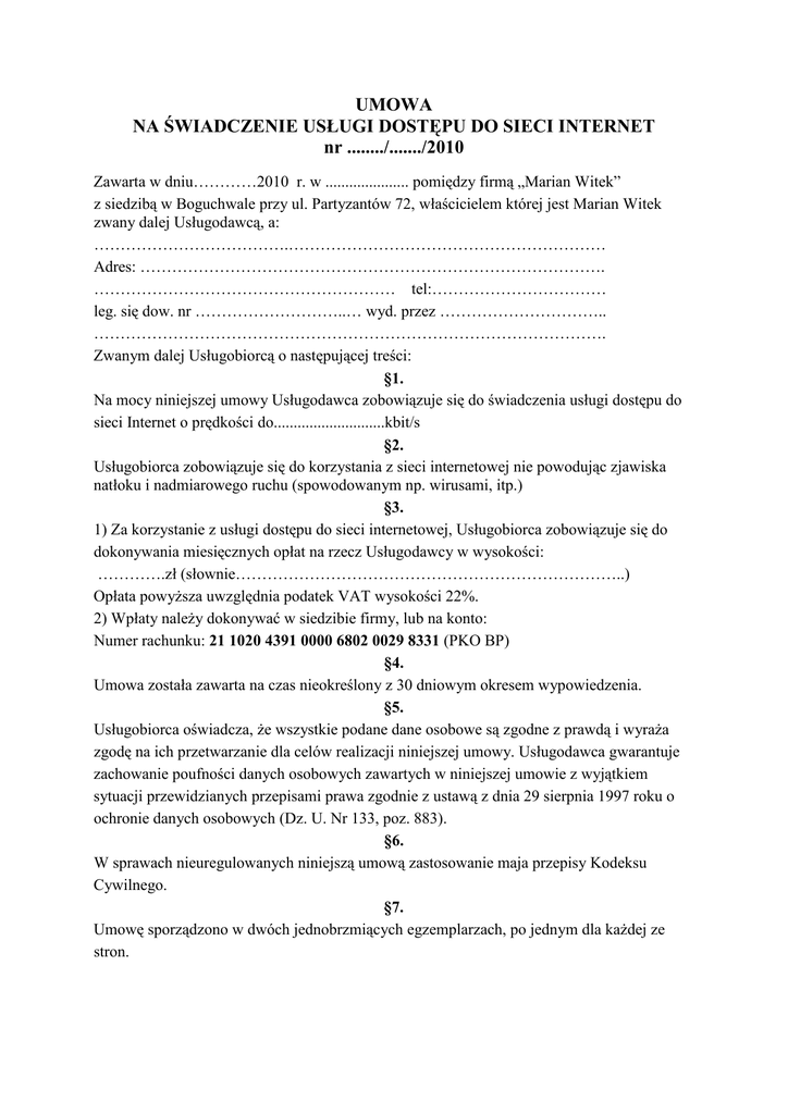 UMOWA NA ŚWIADCZENIE USŁUGI DOSTĘPU DO SIECI INTERNET nr ......../......./2010 Zawarta w dniu…………2010 r. w ..................... pomiędzy firmą „Marian Witek” z siedzibą w Boguchwale przy ul. Partyzantów 72, właścicielem której jest Marian Witek zwany dalej Usługodawcą, a: ……………………………….…………………………………………………… Adres: ……………………………………………………………………………. ………………………………………………… tel:…………………………… leg. się dow. nr ………………………..… wyd. przez ………………………….. ……………………………………………………………………………………. Zwanym dalej Usługobiorcą o następującej treści: §1. Na mocy niniejszej umowy Usługodawca zobowiązuje się do świadczenia usługi dostępu do sieci Internet o prędkości do............................kbit/s §2. Usługobiorca zobowiązuje się do korzystania z sieci internetowej nie powodując zjawiska natłoku i nadmiarowego ruchu (spowodowanym np. wirusami, itp.) §3. 1) Za korzystanie z usługi dostępu do sieci internetowej, Usługobiorca zobowiązuje się do dokonywania miesięcznych opłat na rzecz Usługodawcy w wysokości: ………….zł (słownie………………………………………………………………..) Opłata powyŜsza uwzględnia podatek VAT wysokości 22%. 2) Wpłaty naleŜy dokonywać w siedzibie firmy, lub na konto: Numer rachunku: 21 1020 4391 0000 6802 0029 8331 (PKO BP) §4. Umowa została zawarta na czas nieokreślony z 30 dniowym okresem wypowiedzenia. §5. Usługobiorca oświadcza, Ŝe wszystkie podane dane osobowe są zgodne z prawdą i wyraŜa zgodę na ich przetwarzanie dla celów realizacji niniejszej umowy. Usługodawca gwarantuje zachowanie poufności danych osobowych zawartych w niniejszej umowie z wyjątkiem sytuacji przewidzianych przepisami prawa zgodnie z ustawą z dnia 29 sierpnia 1997 roku o ochronie danych osobowych (Dz. U. Nr 133, poz. 883). §6. W sprawach nieuregulowanych niniejszą umową zastosowanie maja przepisy Kodeksu Cywilnego. §7. Umowę sporządzono w dwóch jednobrzmiących egzemplarzach, po jednym dla kaŜdej ze stron. §8. Podłączone urządzenia: Usługodawca zobowiązuje się do zapewnienia dostępu do sieci Internet następującym komputerom/urządzeniom końcowym przy uŜyciu następujących adresów: Nazwa Adres IP: Adres MAC: Panel klienta: ibok.marianwitek.pl ............................. Usługodawca ................................ Usługobiorca