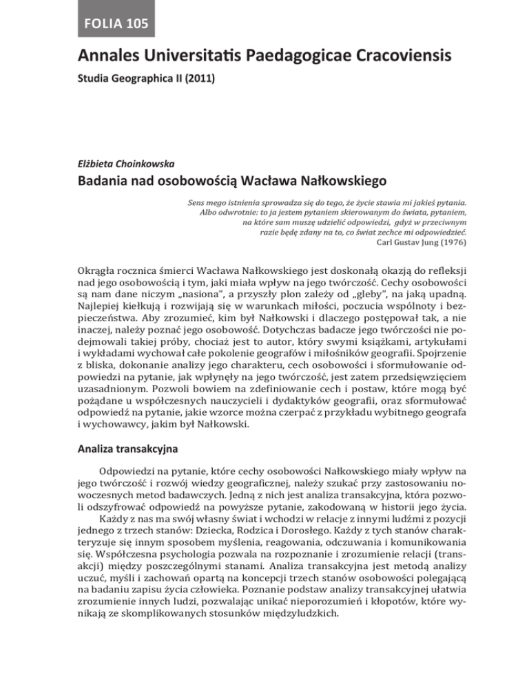 Folia 105 Annales Universitatis Paedagogicae Cracoviensis Studia Geographica II (2011) Elżbieta Choinkowska Badania nad osobowością Wacława Nałkowskiego Sens mego istnienia sprowadza się do tego, że życie stawia mi jakieś pytania. Albo odwrotnie: to ja jestem pytaniem skierowanym do świata, pytaniem, na które sam muszę udzielić odpowiedzi, gdyż w przeciwnym razie będę zdany na to, co świat zechce mi odpowiedzieć. Carl Gustav Jung (1976) Okrągła rocznica śmierci Wacława Nałkowskiego jest doskonałą okazją do refleksji nad jego osobowością i tym, jaki miała wpływ na jego twórczość. Cechy osobowości są nam dane niczym „nasiona”, a przyszły plon zależy od „gleby”, na jaką upadną. Najlepiej kiełkują i rozwijają się w warunkach miłości, poczucia wspólnoty i bezpieczeństwa. Aby zrozumieć, kim był Nałkowski i dlaczego postępował tak, a nie inaczej, należy poznać jego osobowość. Dotychczas badacze jego twórczości nie podejmowali takiej próby, chociaż jest to autor, który swymi książkami, artykułami i wykładami wychował całe pokolenie geografów i miłośników geografii. Spojrzenie z bliska, dokonanie analizy jego charakteru, cech osobowości i sformułowanie odpowiedzi na pytanie, jak wpłynęły na jego twórczość, jest zatem przedsięwzięciem uzasadnionym. Pozwoli bowiem na zdefiniowanie cech i postaw, które mogą być pożądane u współczesnych nauczycieli i dydaktyków geografii, oraz sformułować odpowiedź na pytanie, jakie wzorce można czerpać z przykładu wybitnego geografa i wychowawcy, jakim był Nałkowski. Analiza transakcyjna Odpowiedzi na pytanie, które cechy osobowości Nałkowskiego miały wpływ na jego twórczość i rozwój wiedzy geograficznej, należy szukać przy zastosowaniu nowoczesnych metod badawczych. Jedną z nich jest analiza transakcyjna, która pozwoli odszyfrować odpowiedź na powyższe pytanie, zakodowaną w historii jego życia. Każdy z nas ma swój własny świat i wchodzi w relacje z innymi ludźmi z pozycji jednego z trzech stanów: Dziecka, Rodzica i Dorosłego. Każdy z tych stanów charakteryzuje się innym sposobem myślenia, reagowania, odczuwania i komunikowania się. Współczesna psychologia pozwala na rozpoznanie i zrozumienie relacji (transakcji) między poszczególnymi stanami. Analiza transakcyjna jest metodą analizy uczuć, myśli i zachowań opartą na koncepcji trzech stanów osobowości polegającą na badaniu zapisu życia człowieka. Poznanie podstaw analizy transakcyjnej ułatwia zrozumienie innych ludzi, pozwalając unikać nieporozumień i kłopotów, które wynikają ze skomplikowanych stosunków międzyludzkich. [32] Elżbieta Choinkowska Analiza transakcyjna (AT) jest teorią analizującą i wyjaśniającą sposób, w jaki ludzie myślą, czują i zachowują się. Daje to możliwość odpowiedzi na pytania: kim jestem?, dlaczego zachowuję się właśnie tak? AT oferuje wiele narzędzi, co pozwala nam wyjaśnić i zrozumieć wiele aspektów funkcjonowania i rozwoju człowieka oraz tkwiące w nim możliwości twórcze. Eryk Berne, amerykański psychiatra, twórca AT, porównuje funkcjonowanie mózgu do nagrania filmowego, które zapisuje nasze uczucia, doznania i doświadczenia. Osobowość każdego człowieka jest skomponowana z trzech podstawowych stanów Ja. W rozwoju małego dziecka, od około 10 miesiąca życia, wraz z eksplorowaniem świata zewnętrznego i doskonaleniem struktur poznawczych, zaczyna się kształtować Dorosły w Dziecku. W tym stanie Ja gromadzona jest samodzielnie zdobywana wiedza o rzeczywistości, ogromna ciekawość poznawcza, intuicyjne myślenie i kreatywność. Zmiany stanów Ja zależą od: ilości energii aktywnej w każdym stanie, zdolności każdego stanu do uruchamiania energii i od przepuszczalności granic między stanami Ja (Berne 1961: 40–41; Pankowska 2010). Stan Ja-Dziecko to zespół uczuć, postaw i wzorów zachowania wyniesionych z dzieciństwa. Stan Ja-Rodzic to zespół uczuć, postaw i wzorów zachowania, które przypominają postawy rodzicielskie. Mogą to być rodzice, nauczyciele lub inne osoby. Stan Ja-Dorosły to autonomiczny zespół uczuć, postaw i wzorów zachowania, które są dostosowane do bieżącej rzeczywistości. Należy zwrócić uwagę, że jest to jedyny stan Ja (Ja-Dorosły), w którym jednostka może działać autonomicznie, wyzwalając się z wpływu przeszłości, jakim jest stan Ja-Dziecko. Stany Ja mogą również oddziaływać na siebie. Każdy z nich jest odrębnym, różnym od pozostałych systemem reagowania i odczuwania. Natomiast dominacja danego stanu Ja prowadzi do selekcji zdolności postrzegania. Drobne różnice pomiędzy stanami Ja wskazują na szybkie przechodzenie z jednego stanu do drugiego. Czasem też dochodzi do wyłączenia jednego ze stanów. Dzieciństwo i młodość badacza pod kątem jego rozwoju Urodzony 19 listopada 1851 r. w zubożałej rodzinie szlacheckiej, Wacław Nałkowski był jedynym synem Michała, z zamiłowania muzyka i rzeźbiarza, oraz Celiny z Rudnickich. Dzieciństwo spędził we wsiach na Lubelszczyźnie: w Nowodworze, Niemianowicach i Wierzchowiskach. Urodziłem się na Podlasiu – pisał później w listach do narzeczonej – w tej tęsknej, smutnej krainie, gdzie brzozy płaczące zwieszają swe warkocze nad nieskończonymi, piaszczystymi drogami, gdzie wśród olch czarnych toczą powolnie swe wody ciemne, tajemnicze strugi, gdzie na tajemnych topielach jeziornych roztaczają swe szerokie liście i kwiaty białe lilie wodne, a lasy trzciny i sitowia szumią jakąś tęskną pieśń przeszłości… (Nałkowski 1985: 3). Dzieciństwo spędzał w folwarkach kolejno dzierżawionych przez ojca. Z dziecinnych notatek Wacława widać, jak ciężko odczuwał te zmiany. „Z żalem opuszczał każdy ogród i dom, tęsknił długo za małymi przyjaciółmi, którzy zostali na miejscu” (Nałkowska 1953: 9). W jego głowie powstawały stopni