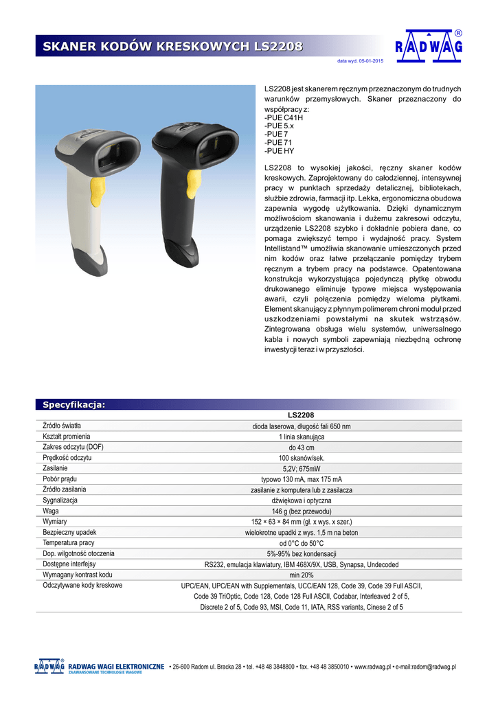 SKANER KODÓW KRESKOWYCH LS2208 data wyd. 05-01-2015 LS2208 jest skanerem ręcznym przeznaczonym do trudnych warunków przemysłowych. Skaner przeznaczony do współpracy z: -PUE C41H -PUE 5.x -PUE 7 -PUE 71 -PUE HY LS2208 to wysokiej jakości, ręczny skaner kodów kreskowych. Zaprojektowany do całodziennej, intensywnej pracy w punktach sprzedaży detalicznej, bibliotekach, służbie zdrowia, farmacji itp. Lekka, ergonomiczna obudowa zapewnia wygodę użytkowania. Dzięki dynamicznym możliwościom skanowania i dużemu zakresowi odczytu, urządzenie LS2208 szybko i dokładnie pobiera dane, co pomaga zwiększyć tempo i wydajność pracy. System Intellistand™ umożliwia skanowanie umieszczonych przed nim kodów oraz łatwe przełączanie pomiędzy trybem ręcznym a trybem pracy na podstawce. Opatentowana konstrukcja wykorzystująca pojedynczą płytkę obwodu drukowanego eliminuje typowe miejsca występowania awarii, czyli połączenia pomiędzy wieloma płytkami. Element skanujący z płynnym polimerem chroni moduł przed uszkodzeniami powstałymi na skutek wstrząsów. Zintegrowana obsługa wielu systemów, uniwersalnego kabla i nowych symboli zapewniają niezbędną ochronę inwestycji teraz i w przyszłości. Specyfikacja: Źródło światła Kształt promienia Zakres odczytu (DOF) Prędkość odczytu Zasilanie Pobór prądu Źródło zasilania Sygnalizacja Waga Wymiary Bezpieczny upadek Temperatura pracy Dop. wilgotność otoczenia Dostępne interfejsy Wymagany kontrast kodu Odczytywane kody kreskowe LS2208 dioda laserowa, długość fali 650 nm 1 linia skanująca do 43 cm 100 skanów/sek. 5,2V; 675mW typowo 130 mA, max 175 mA zasilanie z komputera lub z zasilacza dźwiękowa i optyczna 146 g (bez przewodu) 152 × 63 × 84 mm (gł. x wys. x szer.) wielokrotne upadki z wys. 1,5 m na beton od 0°C do 50°C 5%-95% bez kondensacji RS232, emulacja klawiatury, IBM 468X/9X, USB, Synapsa, Undecoded min 20% UPC/EAN, UPC/EAN with Supplementals, UCC/EAN 128, Code 39, Code 39 Full ASCII, Code 39 TriOptic, Code 128, Code 128 Full ASCII, Codabar, Interleaved 2 of 5, Discrete 2 of 5, Code 93, MSI, Code 11, IATA, RSS variants, Cinese 2 of 5 • 26-600 Radom ul. Bracka 28 • tel. +48 48 3848800 • fax. +48 48 3850010 • www.radwag.pl • e-mail:[email protected]
