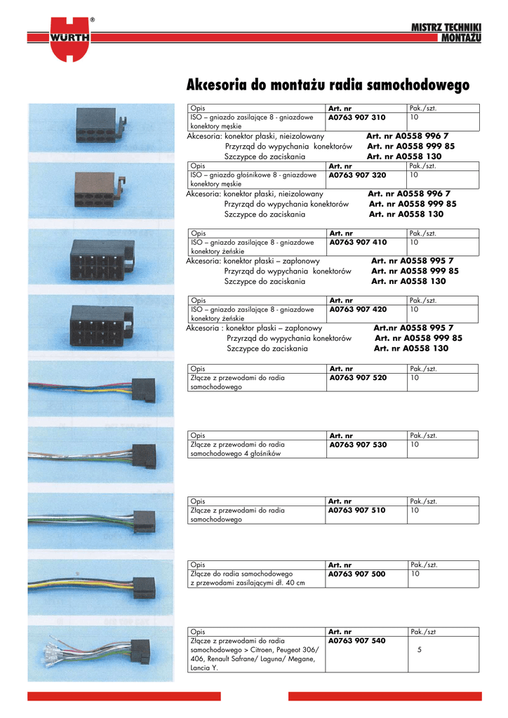 Akcesoria do montażu radia samochodowego Opis ISO – gniazdo zasilające 8 - gniazdowe konektory męskie Art. nr A0763 907 310 Akcesoria: konektor płaski, nieizolowany Przyrząd do wypychania konektorów Szczypce do zaciskania Opis ISO – gniazdo głośnikowe 8 - gniazdowe konektory męskie Opis ISO – gniazdo zasilające 8 - gniazdowe konektory żeńskie Pak./szt. 10 Art. nr A0558 995 7 Art. nr A0558 999 85 Art. nr A0558 130 Art. nr A0763 907 420 Akcesoria : konektor płaski – zapłonowy Przyrząd do wypychania konektorów Szczypce do zaciskania Pak./szt. 10 Art. nr A0558 996 7 Art. nr A0558 999 85 Art. nr A0558 130 Art. nr A0763 907 410 Akcesoria: konektor płaski – zapłonowy Przyrząd do wypychania konektorów Szczypce do zaciskania Opis ISO – gniazdo zasilające 8 - gniazdowe konektory żeńskie Art. nr A0558 996 7 Art. nr A0558 999 85 Art. nr A0558 130 Art. nr A0763 907 320 Akcesoria: konektor płaski, nieizolowany Przyrząd do wypychania konektorów Szczypce do zaciskania Pak./szt. 10 Pak./szt. 10 Art.nr A0558 995 7 Art. nr A0558 999 85 Art. nr A0558 130 Opis Złącze z przewodami do radia samochodowego Art. nr A0763 907 520 Pak./szt. 10 Opis Złącze z przewodami do radia samochodowego 4 głośników Art. nr A0763 907 530 Pak./szt. 10 Opis Złącze z przewodami do radia samochodowego Art. nr A0763 907 510 Pak./szt. 10 Opis Złącze do radia samochodowego z przewodami zasilającymi dł. 40 cm Art. nr A0763 907 500 Pak./szt. 10 Opis Złącze z przewodami do radia samochodowego > Citroen, Peugeot 306/ 406, Renault Safrane/ Laguna/ Megane, Lancia Y. Art. nr A0763 907 540 Pak./szt 5
