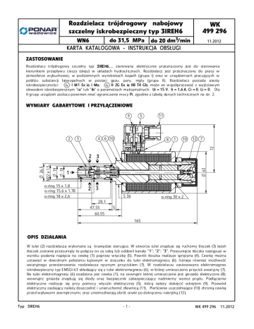 Rozdzielacz trójdrogowy nabojowy szczelny iskrobezpieczny typ 3IREH6 WK 499 296 do 31,5 MPa do 20 dm3/min WN6 KART ARTA KATALOGOWA - INSTRUK RUKCJA OBS OBSŁUGI 11.2012 ZASTOSOWANIE Rozdzielacz trójdrogowy szczelny typ 3IREH6… 3IREH6 … sterowany elektrycznie przeznaczony jest do sterowania kierunkiem przepływu cieczy (oleju) w układach hydraulicznych. Rozdzielacz jest przeznaczony do pracy w atmosferze wybuchowej, w podziemnych wyrobiskach kopalń (grupa I) oraz w urządzeniach pracujących w pobliżu substancji łatwopalnych w postaci gazu, pary, mgły (grupa II). Rozdzielacz posiada atesty iskrobezpieczności: I M1 Ex ia I Ma; II 2G Ex ia IIB T4 Gb, Ma Gb może on współpracować z wyjściowym obwodem iskrobezpiecznym "ia ia" ia lub " ib" ib o parametrach maksymalnych: Ui = 15 V, V Ii = 1,6 A, A Ci = 0, 0 Li = 0. 0 Dla II grupy urządzeń zasilacz powinien mieć ograniczenie mocy Pi, Pi zgodnie z tabelą danych technicznych na str. 2. WYMIARY GABARYTOWE I PRZYŁĄCZENIOWE 9 3 4 6 10 11 8 1 10 12 7 72 2 5 63 1 o-ring 15 x 1,8 o-ring 15,6 x 1,78 o-ring 18 x 2,6 O 18 19 M22 x 1,5 O OO 26,5 2 3 2 3 S 36 28,1 47,55 o-ring 30 x 2 5 60,55 165 OPIS DZIAŁANIA W tulei (2) rozdzielacza wykonane są krawędzie sterujące. W otworze tulei znajduje się ruchomy tłoczek (3) Jeżeli tłoczek zostanie przesunięty to połączy on ze sobą lub oddzieli kanały "1 1 "; "2 2 "; "3 3 ". Przesunięcie tłoczka następuje w wyniku podania napięcia na cewkę (1) poprzez wtyczkę (5). Powrót tłoczka realizuje sprężyna (4). Cewkę można ustawiać w dowolnym położeniu kątowym w stosunku do tulei elektromagnesu (6). Istnieje również możliwość awaryjnego przesterowania rozdzielacza ręcznym przyciskiem (7). W rozdzielaczu zastosowano elektromagnes iskrobezpieczny typ EMSGI-63 składający się z tulei elektromagnesu (6), w której umieszczono przycisk awaryjny (7). Na tulei elektromagnesu (6) osadzona jest cewka (1), na zewnątrz której umieszczone jest gniazdo elektryczne (8); wewnątrz gniazda znajdują się diody oraz bezpiecznik zabezpieczający nadmierny wzrost prądu. Podłączenie elektryczne realizuje się przy pomocy wtyczki elektrycznej (5), którą należy dokręcić wkrętem (9). Przewód elektryczny zasilający należy doszczelnić i unieruchomić dławnicą (11). Pierścienie uszczelniające (10) chronią cewkę przed wpływami zewnętrznymi, oraz uniemożliwiają obrót cewki po dokręceniu nakrętką (12). Typ 3IREH6 -1- WK 499 296 11.2012 DANE TECHNICZNE olej mineralny 16 µm 10 µm o 37 mm 2/s w temperaturze 55 C 2,8 do 328 mm2 /s o 40 do 55 C do 95 % Rodzaj cieczy hydraulicznej Wymagana filtracja cieczy hydraulicz nej Zalecana filtracja cieczy hydraulicznej Lepkość nominalna cieczy hydraulicznej Zakres lepkości cieczy hydraulicznej Optymalna temperatura pracy (cieczy w zbiorniku) Wilgotność względna powietrza Maksymal Maksymal ne dopuszczal ne ciśnie nie pracy 31,5 MPa 20 dm 3 /min 1,5 kg 12 V 110 mA IP 6 4 Przepływ max Masa Napięcie zasilania U n Prąd zasilania In Stopień oc hro hrony ZGODNO DNOŚĆ Z DYR DY REKTYWĄ 9 4 / 9 /W E Certyfi Certy fikat fikat zapew nienia nie nia jak ości Certyfi fikat Certy fikat badania typu 1026 102 6 FTZ ZU 05 AT EX 0068 FT 0 068 Cecha Cec ha iskr obezpieczeńst wa nr : II 2G 2 G Ex ia I IB T4 Gb I M 1 Ex ia I M a o - 20 do 60 C o - 20 do 40 C o Temperatura otoczenia T a FTZ U 05 AT EX Q 01 3 - 20 do 60 C Pi Pi ≤ 1,2 W ≤ 1,3 W WYMAGANIA MONTAŻU I EKSPLOATACJI 1. 2. 3. 4. 5. Podłączenie elektryczne rozdzielacza powinno być wykonane zgodnie ze schematem elektrycznym – ark. ark. 2 ! Przewody elektryczne do podłączenia rozdzielacza winny odpowiadać wymaganiom stosowanych w urządzeniach górniczych. Rozdzielacz powinien być przyłączony przyłączony lub odłączony do (od) instalacji elektrycznej przez wykwalifikowanego pracownika. Po założeniu wtyczki należy ją zamocować wkrętem będącym na wyposażeniu. Podczas eksploatacji należy utrzymać zalecaną w Instrukcji Obsługi lepkość cieczy roboczej i zapewnić zapewnić wymaganą filtrację. 6. Aby zapewnić bezawaryjną i bezpieczną pracę rozdzielacza należy systematycznie sprawdzać: • stan połączenia elektrycznego • działanie rozdzielacza • czystość cieczy hydraulicznej Niedopuszczalny jest remont rozdzielacza w warunkach dołowych, uszkodzony rozdzielacz w celu usunięcia awarii należy przekazać do serwisu producenta. Adres serwisu, zgodny z adresem producenta, podany jest na ostatniej stronie niniejszej Karty Katalogowej – Instrukcji Obsługi. Obsługujący rozdzielacz iskrobezpieczny musi być zapoznany z treścią niniejszej Instrukcji. 7. 8. SCHEMATY symbol symbo l graf gr afic aficz iczny ro r ozdz zdziel ielacz acza 2 3IREH6 D2... 1 schemat schem at ele e lek lektryczny trycz ny ro r ozdz zdziel ielacz acza 3 wido idok przył przy łącz ącza gn g niazda zda B1 - 0,25A D1 1+ WK 499 296 11.2012 - + D2 1 2 -2 -2- Typ 3IREH6 * WYMIARY GNIAZDA PRZYŁĄCZENIOWEGO (* ) - max 4,9 φ 0,025 - dotyczy wszystkich średnic otworu głównego i faz moment dokręcenia rozdzielacza 30 3 0 Nm CHARAKTERYSTYKI dla lepkości cieczy hydraulicznej ν = 41 mm2 /s i temperatury t = 50 o C Chara arakterystyk terysty ki opor oporó orów przep pr zepły zepływ ływu ∆p [MPa] 2 1,5 1 2 3 3 2 1 2 2 1 0,5 0 5 Typ 3IREH6 10 -3- 15 20 Q [dm3/min] WK 499 296 11.2012 CHARAKTERYSTYKI dla lepkości cieczy hydraulicznej ν = 41 mm2 /s i temperatury t = 50 o C Chara arakterystyk terysty ki przep pr zepły zep ływ ływów gra gr anicz icznych nych 14 12 Q[dm3/min] 10 Q 1-2 8 Q 2-1 6 4 2 0 0 5 10 15 20 25 30 p[MPa] 30 25 Q[dm 3/min] 20 Q 2-3 15 Q 3-2 10 5 0 0 5 10 15 20 25 30 p[MPa] WK 499 296 11.2012 -4- Typ 3IREH6 SPOSÓB ZAMAWIANIA Zamówienie wg zakodowanego jak niżej symbolu należy kierować na adres producenta 3IREH6 D2 02 Schemat hydrauliczny schemat D2 = D2 Numer serii konstrukcyjnej (02-09) - niezmienne wymiary przyłącza i zabudowy = 02 Ilość p