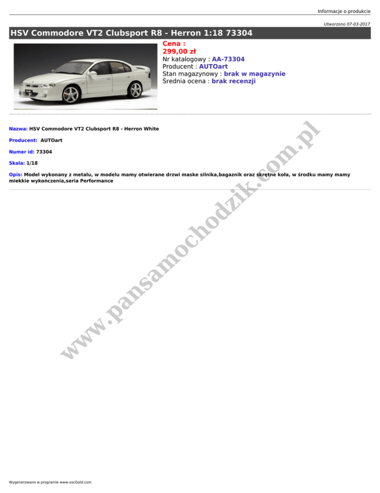 Informacje o produkcie Utworzono 07-03-2017 HSV Commodore VT2 Clubsport R8 - Herron 1:18 73304 Cena : 299,00 zł Nr katalogowy : AA-73304 Producent : AUTOart Stan magazynowy : brak w magazynie Średnia ocena : brak recenzji .p l Nazwa: HSV Commodore VT2 Clubsport R8 - Herron White Producent: AUTOart om Numer id: 73304 Skala: 1/18 w w w .p an sa m oc ho dz ik .c Opis: Model wykonany z metalu, w modelu mamy otwierane drzwi maske silnika,bagaznik oraz skrętne koła, w środku mamy mamy miekkie wykończenia,seria Performance Wygenerowano w programie www.oscGold.com