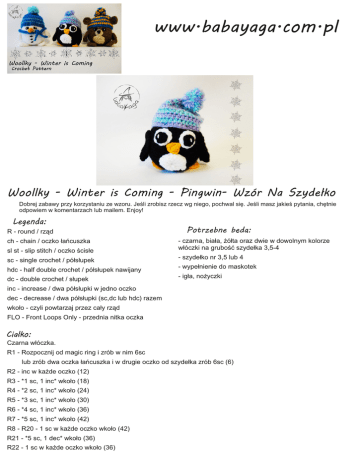 www.babayaga.com.pl Woollky - Winter is Coming - Pingwin- Wzór Na Szydelko Dobrej zabawy przy korzystaniu ze wzoru. Jeśli zrobisz rzecz wg niego, pochwal się. Jeśli masz jakieś pytania, chętnie odpowiem w komentarzach lub mailem. Enjoy! Legenda: R - round / rząd Potrzebne beda: sl st - slip stitch / oczko ścisłe - czarna, biała, żółta oraz dwie w dowolnym kolorze włóczki na grubość szydełka 3,5-4 sc - single crochet / półsłupek - szydełko nr 3,5 lub 4 hdc - half double crochet / półsłupek nawijany - wypełnienie do maskotek dc - double crochet / słupek - igła, nożyczki ch - chain / oczko łańcuszka inc - increase / dwa półsłupki w jedno oczko dec - decrease / dwa półsłupki (sc,dc lub hdc) razem wkoło - czyli powtarzaj przez cały rząd FLO - Front Loops Only - przednia nitka oczka Czarna włóczka. R1 - Rozpocznij od magic ring i zrób w nim 6sc lub zrób dwa oczka łańcuszka i w drugie oczko od szydełka zrób 6sc (6) R2 - inc w każde oczko (12) R3 - *1 sc, 1 inc* wkoło (18) R4 - *2 sc, 1 inc* wkoło (24) R5 - *3 sc, 1 inc* wkoło (30) R6 - *4 sc, 1 inc* wkoło (36) R7 - *5 sc, 1 inc* wkoło (42) R8 - R20 - 1 sc w każde oczko wkoło (42) R21 - *5 sc, 1 dec* wkoło (36) R22 - 1 sc w każde oczko wkoło (36) R23 - *4 sc, 1 dec* wkoło (30) R24 - *3 sc, 1 dec* wkoło (24) W tym momencie wypełnij większość maskotki silikonowymi kulkami lub innym wypełnieniem R25 - *2 sc, 1 dec* wkoło (18) R26 - *1 sc, 1 dec* wkoło (12) R27 - 6 x dec (6) Zaszyj. Oczy: Biała włóczka. Zrób 2. R1 - Rozpocznij od magic ring i zrób w nim 6sc lub zrób dwa oczka łańcuszka i w drugie oczko od szydełka zrób 6sc (6) R2 - inc w każde oczko (12) R3 - *1 sc, 1 inc* wkoło (18) Zakończ slst. Źrenice: R1 - Rozpocznij od magic ring i zrób w nim 6sc lub zrób dwa oczka łańcuszka i w drugie oczko od szydełka zrób 6sc (6) Zakończ slst. Dziób: Żółta włóczka. R1 - 4 ch R2 - 1sc w drugie oczko od szydełka, 2sc, obróć R3 - 1ch, 1dec, 1sc, obróć R4 - 1ch, 1dec Lapki: Żółta włóczka. Zrób 2. K1 - 9ch, K2 - 1sc w drugie oczko od szydełka, 2sc, 1hdc, 2dc, 2trc FO Skrzydla: Czarna włóczka. Zrób 2. R1 - Rozpocznij od magic ring i zrób w nim 6sc lub zrób dwa oczka łańcuszka i w drugie oczko od szydełka zrób 6sc (6) R2 - inc w każde oczko (12) R3 - *1 sc, 1 inc* wkoło (18) Teraz zacznij przerabiać w rzędach. R4 - 5sc, 1slst, obróć R5 - 1ch, 4sc, obróć (5) R6 - 1ch, 1dec, 2sc, obróć (4) R7 - 1ch, 1dec, 1sc, obróć (2) R8 - 1ch, 1dec Wykonaj ok. 24sc wkoło całego skrzydełka. Zakończ zostawiając długą nitkę. Brzuszek: Biała włóczka. R1 - Rozpocznij od magic ring i zrób w nim 6sc lub zrób dwa oczka łańcuszka i w drugie oczko od szydełka zrób 6sc (6) R2 - inc w każde oczko (12) R3 - *1 sc, 1 inc* wkoło (18) R4 - 12sc Zakończ slst. Czapeczka: Wykonaj dwoma różnymi kolorami. Czapkę wykonujemy wkoło zakańczając każdy rząd slst, a rozpoczynając 2ch zastępującymi jeden hdc. Kolor A R1 - 40 ch, połącz slst, przerabiaj wkoło R2 - 2ch, 39 hdc (40) Kolor B R3 - 2ch, 39 hdc (40) Kolor A R4 - 2ch, 39 hdc (40) Kolor B R5 - 2ch, 39 hdc (40) Kolor A R6 - 2ch, 7hdc, 1dec, 3x(8hdc, 1dec) (36) Kolor B R7 - 2ch, 5hdc, 1dec, 3x(6hdc, 1dec), 5hdc (32) Kolor A R8 - 2ch, 1hdc, 1dec, 7x(2hdc, 1dec) (24) Kolor B R9 - 2ch, 1hdc, 1 dec, 7x(2hdc, 1dec) (18) Kolor A R10 - 2ch, 1dec, 8x(1hdc, 1dec) (12) Kolor B R11 - 2ch, 6 x dec (6) Zszyj. Na czubku przyszyj pompon. Pompon: 1. Owiń włóczkę wkoło ząbków widelca. 2. Następnie przewiąż osobną nitkę przeciągając ją pomiędzy środkowymi ząbkami i mocno zaciśnij. Dokładnie tak jak na kole do pomponów. 3. Przetnij krawędzie włóczki, uformuj kulkę i (4.) nożyczkami wyrównaj „włoski”. 1. 3. 2. 4. Wykonczenie: Za pomocą długich nitek pozszywaj elementy. Przyszyj źrenice do oczek, a następnie przyszyj oczy. Pomiędzy oczkami przyszyj dziób. Po bokach przyszyj skrzydełka. Możesz przyszyć tylko górną ich część, a wtedy będzie można je odginać. Na spodzie przyszyj łapki. Pod dzióbkiem przyszyj brzuszek. Czapkę możesz nałożyć lub tak jak ja przyszyć. Poukrywaj wszystkie nitki. Gotowe! Ten wzór jest wymyślony przez Celinę Bagińską. Nie wyrażam zgody na umieszczanie go na innych stronach. Jeśli podobał Ci się wzór i chciałbyś posłać go dalej, proszę zrób to tylko poprzez umieszczenie linka do mojego bloga (www.babayaga.com.pl) lub profilu na ravelry.com Nie przedstawiaj wzoru jako swój. Wzór jest darmowy i nie na sprzedaż. Nie sprzedawaj rzeczy wykonanych wg darmowych wzorów.