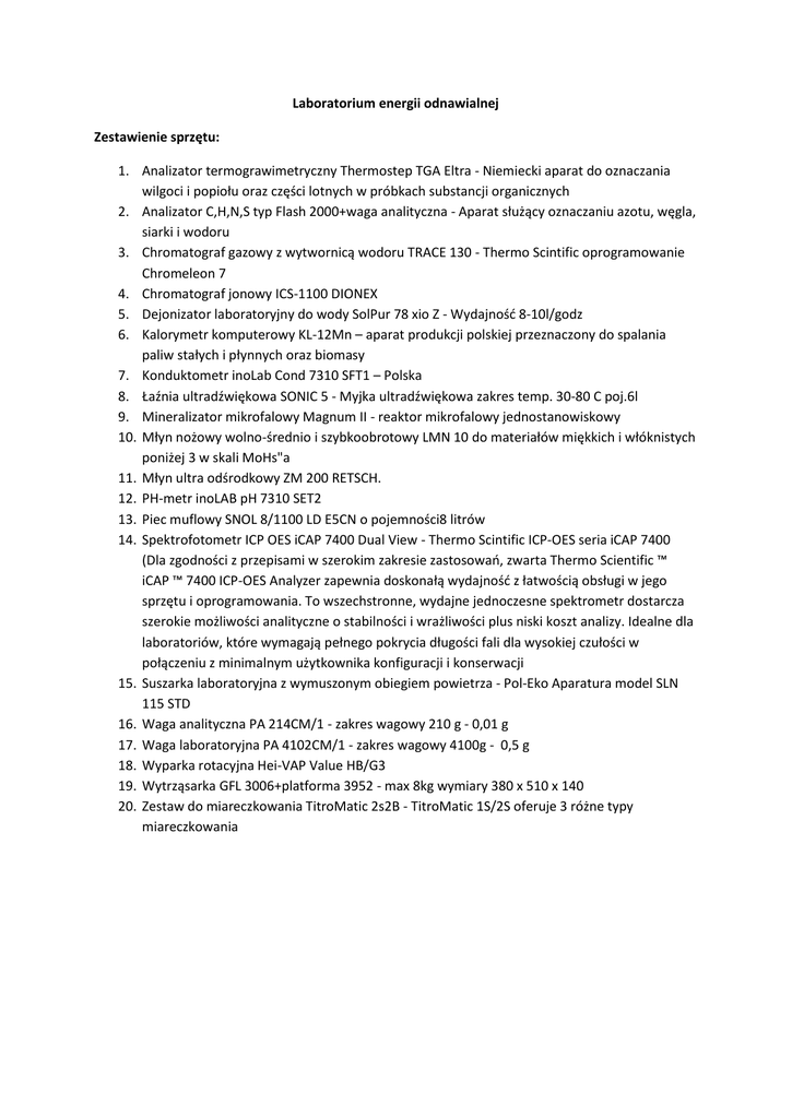 Laboratorium energii odnawialnej Zestawienie sprzętu: 1. Analizator termograwimetryczny Thermostep TGA Eltra - Niemiecki aparat do oznaczania wilgoci i popiołu oraz części lotnych w próbkach substancji organicznych 2. Analizator C,H,N,S typ Flash 2000+waga analityczna - Aparat służący oznaczaniu azotu, węgla, siarki i wodoru 3. Chromatograf gazowy z wytwornicą wodoru TRACE 130 - Thermo Scintific oprogramowanie Chromeleon 7 4. Chromatograf jonowy ICS-1100 DIONEX 5. Dejonizator laboratoryjny do wody SolPur 78 xio Z - Wydajność 8-10l/godz 6. Kalorymetr komputerowy KL-12Mn – aparat produkcji polskiej przeznaczony do spalania paliw stałych i płynnych oraz biomasy 7. Konduktometr inoLab Cond 7310 SFT1 – Polska 8. Łaźnia ultradźwiękowa SONIC 5 - Myjka ultradźwiękowa zakres temp. 30-80 C poj.6l 9. Mineralizator mikrofalowy Magnum II - reaktor mikrofalowy jednostanowiskowy 10. Młyn nożowy wolno-średnio i szybkoobrotowy LMN 10 do materiałów miękkich i włóknistych poniżej 3 w skali MoHs"a 11. Młyn ultra odśrodkowy ZM 200 RETSCH. 12. PH-metr inoLAB pH 7310 SET2 13. Piec muflowy SNOL 8/1100 LD E5CN o pojemności8 litrów 14. Spektrofotometr ICP OES iCAP 7400 Dual View - Thermo Scintific ICP-OES seria iCAP 7400 (Dla zgodności z przepisami w szerokim zakresie zastosowań, zwarta Thermo Scientific ™ iCAP ™ 7400 ICP-OES Analyzer zapewnia doskonałą wydajność z łatwością obsługi w jego sprzętu i oprogramowania. To wszechstronne, wydajne jednoczesne spektrometr dostarcza szerokie możliwości analityczne o stabilności i wrażliwości plus niski koszt analizy. Idealne dla laboratoriów, które wymagają pełnego pokrycia długości fali dla wysokiej czułości w połączeniu z minimalnym użytkownika konfiguracji i konserwacji 15. Suszarka laboratoryjna z wymuszonym obiegiem powietrza - Pol-Eko Aparatura model SLN 115 STD 16. Waga analityczna PA 214CM/1 - zakres wagowy 210 g - 0,01 g 17. Waga laboratoryjna PA 4102CM/1 - zakres wagowy 4100g - 0,5 g 18. Wyparka rotacyjna Hei-VAP Value HB/G3 19. Wytrząsarka GFL 3006+platforma 3952 - max 8kg wymiary 380 x 510 x 140 20. Zestaw do miareczkowania TitroMatic 2s2B - TitroMatic 1S/2S oferuje 3 różne typy miareczkowania Przykład: Nazwa: Młyn ultra odśrodkowy Model: ZM 200 RETSCH Zastosowanie: Używany do szybkiego rozdrabniania materiałów średnio twardych i włóknistych. Ze względu na skuteczną technikę rozdrabniania oraz szeroką gamę akcesoriów, ZM 200 gwarantuje delikatne przygotowanie próbek analitycznych w bardzo krótkim czasie.