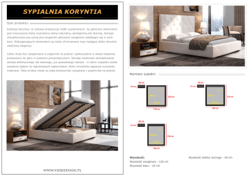 sypialnia koryntia Opis produktu: Kolekcja Koryntia, to ciekawa propozycja mebli sypialnianych. Jej głównym elementem jest nowoczesne łózko wyścielane skórą naturalną, ekologiczną lub tkaniną, którego charakterystyczną cechą jest elegancko pikowane wezgłowie układające się w wzór karo. Wzbogacającym elementem są niskie chromowane nogi nadające łóżku Koryntia właściwej elegancji. Łóżko może być zaopatrzone w pojemnik na pościel i jednocześnie w stelaż klepkowy podnoszony do góry w systemie pneumatycznym. Istnieje możliwość zainstalowania stelaża elektrycznego lub własnego, już posiadanego stelaża - w takim wypadku stelaż osadzony będzie na regulowanych kątownikach, które umożliwią regulacje wysokości materaca. Taka zmiana niesie za sobą konieczność rezygnacji z pojemnika na pościel. Wymiary sypialni: 60 cm 60 cm 35 cm 35 cm stolik nocny stolik nocny materac 200 cm materac 220 cm 200 cm 160 cm 180 cm 178 cm 206 cm 226 cm 60 cm 35 cm stolik nocny materac 200 cm 226 cm 140 cm 166 cm Wysokość: Wysokość wezgłowia - 120 cm Wysokość boku - 35 cm www.vieridivani.pl Wysokość stolika nocnego - 40 cm