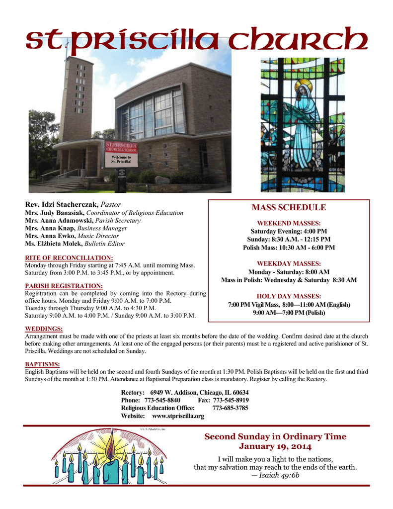 Welcome to St. Priscilla! Rev. Idzi Stacherczak, Pastor MASS SCHEDULE Mrs. Judy Banasiak, Coordinator of Religious Education Mrs. Anna Adamowski, Parish Secretary Mrs. Anna Knap, Business Manager Mrs. Anna Ewko, Music Director Ms. Elżbieta Molek, Bulletin Editor WEEKEND MASSES: Saturday Evening: 4:00 PM Sunday: 8:30 A.M. - 12:15 PM Polish Mass: 10:30 AM - 6:00 PM RITE OF RECONCILIATION: Monday through Friday starting at 7:45 A.M. until morning Mass. Saturday from 3:00 P.M. to 3:45 P.M., or by appointment. PARISH REGISTRATION: Registration can be completed by coming into the Rectory during office hours. Monday and Friday 9:00 A.M. to 7:00 P.M. Tuesday through Thursday 9:00 A.M. to 4:30 P.M. Saturday 9:00 A.M. to 4:00 P.M. / Sunday 9:00 A.M. to 3:00 P.M. WEEKDAY MASSES: Monday - Saturday: 8:00 AM Mass in Polish: Wednesday & Saturday 8:30 AM HOLY DAY MASSES: 7:00 PM Vigil Mass, 8:00—11:00 AM (English) 9:00 AM—7:00 PM (Polish) WEDDINGS: Arrangement must be made with one of the priests at least six months before the date of the wedding. Confirm desired date at the church before making other arrangements. At least one of the engaged persons (or their parents) must be a registered and active parishioner of St. Priscilla. Weddings are not scheduled on Sunday. BAPTISMS: English Baptisms will be held on the second and fourth Sundays of the month at 1:30 PM. Polish Baptisms will be held on the first and third Sundays of the month at 1:30 PM. Attendance at Baptismal Preparation class is mandatory. Register by calling the Rectory. Rectory: 6949 W. Addison, Chicago, IL 60634 Phone: 773-545-8840 Fax: 773-545-8919 Religious Education Office: 773-685-3785 Website: www.stpriscilla.org Second Sunday in Ordinary Time January 19, 2014 I will make you a light to the nations, that my salvation may reach to the ends of the earth. — Isaiah 49:6b PageTwoJanuary19,2014 WHEN SUNDAY, JANUARY 19, 2014 1:00 TO 3:00 PM WHERE Start: Federal Plaza (50 W. Adams) End: State of Illinois Building (100 W. Randolph) WHO The Chicago March for Life is an annual public event composed of people from diverse ethnic, social, and religious backgrounds dedicated to defending and protecting the gift of every human life. WHY Marching together in hope, we call upon religious, civic, and community leaders to renew every effort to build a nation that affirms the authentic dignity of women, the gift of children, and a culture dedicated to protecting life at every stage of development in law and love. MarchForLifeChicago.com SecondSundayinOrdinaryTimePageThree SECOND SUNDAY IN ORDINARY TIME (19) 8:30 — St. Priscilla Parishioners #6 10:30— O bł. Boże dla Ojczyzny i wszystkich Polaków na całym świecie, święte owoce działalności Ligi Katolickiej oraz dusze w Czyśćcu cierpiące W dniu urodzin o zdrowie i Boże bł. dla Justyny Matelski (Babcia) O Boże bł., zdrowie i wszelkie potrzebne łaski dla Dorianka w dniu 13-tych urodzin (Babcia) O radość w wieczności dla: +Dominik Kalinowski (Żona i dzieci) ++Katarzyna i Paweł Dziura (Tato z rodziną) +Stanisław Kraus (Rodzina) +Józef Jabłoński w 14-tą rocz. śmierci (Córka z rodz.) +Józef Kowalczyk 33 miesiące po śmierci (Żona) +Karolina Grudzień w 16-tą rocz. śmierci (Córka z rodz.) 12:15— +Alina Zegarska 4th Death Anniversary (Son and family) 6:00 — Podziękowanie za otrzymane łaski MONDAY (20) Weekday (Saints: Fabian and Sebastian) 8:00 — +Katharina Weiterschan (Family) TUESDAY (21) Saint Agnes, Virgin and Martyr 8:00 — All Souls in Purgatory #21 WEDNESDAY(22) Day of Prayer for Unborn Children 8:00 — ++Pasquale and Philomena Costabile (Theresa) 8:30 — Za parafian św. Pryscylli #7 Fernando and Pat Abella Ann Aitken Joe Bargi Lorraine Belokon Jan Drożdż Nick Grossmayer Dorothy Heck Jennifer Hebda Marian Henaghan Andrew Jennings Carrie Kacen Marie Kane Janet Kaplan Maureen Kearney LaVerne Kmiec Dolores LaCour Maria Lech Peter Leyden Joseph LoPiccolo Mary Lund Mary Lynch Michael Manczko Barbara McDonald Mike Muka Antoni Nierzejewski Carol Niewinski Henry Orry Marge Reavis Augusto Sandoval Norbert Schultz Gina Swensen Roger Vlasos Jola Wolfe Katie Young Carla and Adam If you would like to have a name added or removed from our Parish “Pray For…” sick list, please call the rectory at 773-545-8840 ext. 221. Thank you! THURSDAY (23) Weekday (St. Vincent, Deacon and Martyr) 8:00 — St. Priscilla Parishioners #8 FRIDAY (24) St. Francis de Sales, Bishop & Doctor of the Church 8:00 — All Souls in Purgatory #22 Jacob Evan Thompson SATURDAY (25) The Conversion of Saint Paul the Apostle 8:00 — +Richard Pacyna (Pacyna Family) 8:30 — O Boże bł. dla Holly i Pawła z rodziną (Rodz. Harmata) 4:00 — +Daniel G. Manczak (Mary Kay and Tom Livorsi) THIRD SUNDAY IN ORDINARY TIME (26) 8:30 — +Ralph Ellerth (Henry Kruzel) +Deacon Fred J. Spitzzeri (Pastor and parishioners) 10:30— O bł. Boże dla Ojczyzny i wszystkich Polaków na całym świecie, święte owoce działalności Ligi Katolickiej oraz dusze w Czyśćcu cierpiące O zdrowie i Boże bł. dla Józefy i Czesława Cybulskich w rocz. ślubu z prośbą o opiekę M. Bożej i potrzebne łaski O Boże bł. i potrzebne łaski dla Antoniego Niemczyk i Stanisława Ryczek z racji urodzin (Polska Grupa) O Boże bł. i opiekę M. Bożej dla Kazimierza Czochara z racji urodzin O radość w wieczności dla: ++Katarzyna i Paweł Dziura (Tato z rodziną) +Stanisław Kraus (Rodzina) 12:15— 6:00 — Patricia Tytro January 5, 2014 Currency $ 2,626.00 Checks $ 2,775.00 Loose Coin $ 11.10 Total $ 5,412.10 Weekly Goal $ 7,500.00 Budget Year to Date $202,500.00 Collections Year to Date $171,818.24 Under Budget $<30,681.76> Thank you for your generosity and support of our Parish. PageFourJanuary19,2014 Eleventh Annual Valentine’s Day Dance The Polish community from St. Priscilla is hosting its Eleventh annual Valentine’s Day Dance, which will be held on Saturday, February 15, 2014 at 7:00 PM in McGowan Hall. 