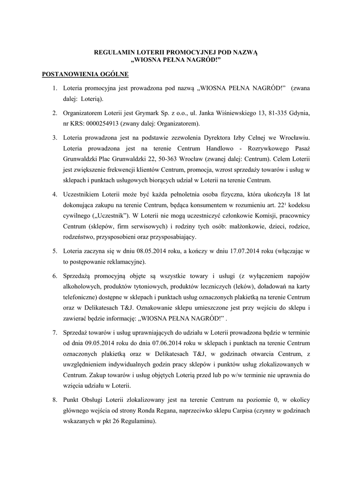 REGULAMIN LOTERII PROMOCYJNEJ POD NAZWĄ „WIOSNA PEŁNA NAGRÓD!” POSTANOWIENIA OGÓLNE 1. Loteria promocyjna jest prowadzona pod nazwą „WIOSNA PEŁNA NAGRÓD!” (zwana dalej: Loterią). 2. Organizatorem Loterii jest Grymark Sp. z o.o., ul. Janka Wiśniewskiego 13, 81-335 Gdynia, nr KRS: 0000254913 (zwany dalej: Organizatorem). 3. Loteria prowadzona jest na podstawie zezwolenia Dyrektora Izby Celnej we Wrocławiu. Loteria prowadzona jest na terenie Centrum Handlowo - Rozrywkowego Pasaż Grunwaldzki Plac Grunwaldzki 22, 50-363 Wrocław (zwanej dalej: Centrum). Celem Loterii jest zwiększenie frekwencji klientów Centrum, promocja, wzrost sprzedaży towarów i usług w sklepach i punktach usługowych biorących udział w Loterii na terenie Centrum. 4. Uczestnikiem Loterii może być każda pełnoletnia osoba fizyczna, która ukończyła 18 lat dokonująca zakupu na terenie Centrum, będąca konsumentem w rozumieniu art. 22¹ kodeksu cywilnego („Uczestnik”). W Loterii nie mogą uczestniczyć członkowie Komisji, pracownicy Centrum (sklepów, firm serwisowych) i rodziny tych osób: małżonkowie, dzieci, rodzice, rodzeństwo, przysposobieni oraz przysposabiający. 5. Loteria zaczyna się w dniu 08.05.2014 roku, a kończy w dniu 17.07.2014 roku (włączając w to postępowanie reklamacyjne). 6. Sprzedażą promocyjną objęte są wszystkie towary i usługi (z wyłączeniem napojów alkoholowych, produktów tytoniowych, produktów leczniczych (leków), doładowań na karty telefoniczne) dostępne w sklepach i punktach usług oznaczonych plakietką na terenie Centrum oraz w Delikatesach T&J. Oznakowanie sklepu umieszczone jest przy wejściu do sklepu i zawierać będzie informację: „WIOSNA PEŁNA NAGRÓD!” . 7. Sprzedaż towarów i usług uprawniających do udziału w Loterii prowadzona będzie w terminie od dnia 09.05.2014 roku do dnia 07.06.2014 roku w sklepach i punktach na terenie Centrum oznaczonych plakietką oraz w Delikatesach T&J, w godzinach otwarcia Centrum, z uwzględnieniem indywidualnych godzin pracy sklepów i punktów usług zlokalizowanych w Centrum. Zakup towarów i usług objętych Loterią przed lub po w/w terminie nie uprawnia do wzięcia udziału w Loterii. 8. Punkt Obsługi Loterii zlokalizowany jest na terenie Centrum na poziomie 0, w okolicy głównego wejścia od strony Ronda Regana, naprzeciwko sklepu Carpisa (czynny w godzinach wskazanych w pkt 26 Regulaminu). ZASADY PROWADZENIA LOTERII 9. Aby zostać uczestnikiem Loterii należy spełnić łącznie następujące warunki: a) dokonać transakcji zakupu towarów/usług za dowolną kwotę brutto (zwanej dalej Zakupem promocyjnym) w terminie od dnia 09.05.2014 roku do dnia 07.06.2014 roku w sklepach i punktach usług oznakowanych plakietką (pkt 6 Regulaminu) oraz w Delikatesach T&J, w godzinach otwarcia Centrum oraz godzinach otwarcia sklepów i punktów znajdujących się w Centrum, b) zarejestrować kod kreskowy umieszczony na odwrocie paragonu fiskalnego Zakupu promocyjnego, w jednym z 5 urządzeń multimedialnych zwanych Rabatomatami, poprzez jego przyłożenie do urządzenia tj. Rabatomatu w terminie od dnia 09.05.2014 roku do dnia 07.06.2014 roku w godzinach: od 9:00 do 21:00 od poniedziałku do soboty oraz od 10:00 do 20:00 w niedzielę. 10. Na odwrocie każdego z paragonów fiskalnych Zakupu promocyjnego znajduje się wydrukowany co najmniej jeden kod kreskowy (graficzny zapis znaków w postaci kombinacji jasnych i ciemnych elementów (pasków-kresek) oraz co najmniej jeden Kod (ciąg 13-stu indywidualnych liczb umieszczonych pod kodem kreskowym). Rabatomaty wystawione będą w terminie od dnia 09.05.2014 roku do dnia 07.06.2014 roku na terenie Centrum. Lokalizacja pięciu Rabatomatów: a) na poziomie -1 Centrum koło Delikatesów T&J, b) na poziomie 0 Centrum koło sklepu Maxima, c) na poziomie 0 Centrum koło sklepu Sephora, d) na poziomie +1 Centrum koło sklepu Zara, e) na poziomie +1 Centrum koło sklepu Diverse. 11. Uczestnik jest zobowiązany zachować w trakcie trwania Loterii oryginał paragonu fiskalnego Zakupu promocyjnego. 12. Zadaniem Uczestnika jest zarejestrowanie Kodu na posiadanym paragonie fiskalnym Zakupu promocyjnego w terminie od dnia 09.05.2014 roku do dnia 07.06.2014 roku w godzinach: od 9:00 do 21:00 od poniedziałku do soboty oraz od 10:00 do 20:00 w niedzielę. W tym celu Uczestnik jest zobowiązany przyłożyć paragon fiskalny dokumentujący dokonanie Zakupu promocyjnego do czytnika jednego z Rabatomatów, w taki sposób, aby pole skanujące pokryło się kodem kreskowym na paragonie fiskalnym. Uczestnik może zapoznać się z treścią Regulaminu, który po naciśnięciu odpowiedniego przycisku wyświetla się na ekranie Rabatomatu. Uczestnik zobowiązany jest przestrzegać postanowień Regulaminu. 13. Uczestnik może zarejestrować Kod znajdujący się wyłącznie na paragonie fiskalnym, tj. dokumencie fiskalnym zawierający m.in. takie dane jak: nazwę towaru, wartość towaru, kwotę opodatkowania brutto, kwotę podatku oraz sumę do zapłaty. W Loterii nie są brane pod uwagę paragony niefiskalne lub wydruki potwierdzające dokonanie zapłaty kartą płatniczą i inne dokumenty niebędące paragonem fiskalnym. 14. W przypadku gdy na paragonie fiskalnym znajduje się więcej niż jeden Kod, wówczas Uczestnik ma prawo zarejestrować w Rabatomacie wszystkie pełne Kody na posiadanym paragonie fiskalnym w czasie od dnia 09.05.2014 roku do dnia 07.06.2014 roku w godzinach wskazanych w pkt 12 Regulaminu. NAGRODY 15. W Loterii przewidziane zostały następujące nagrody: a) Nagroda I stopnia: bon zakupowy o wartości 500 zł do realizacji na terenie Centrum – 14 nagród o łącznej wartości 7.000 zł; b) Nagroda II stopnia: bon zakupowy o wartości 200 zł do realizacji na terenie Centrum – 28 nagród o łącznej wartości 5.600 zł; c) Nagroda III stopnia: bon zakupowy o wartości 100 zł do realizacji na terenie Centrum – 132 nagrody o łącznej wartości 13.