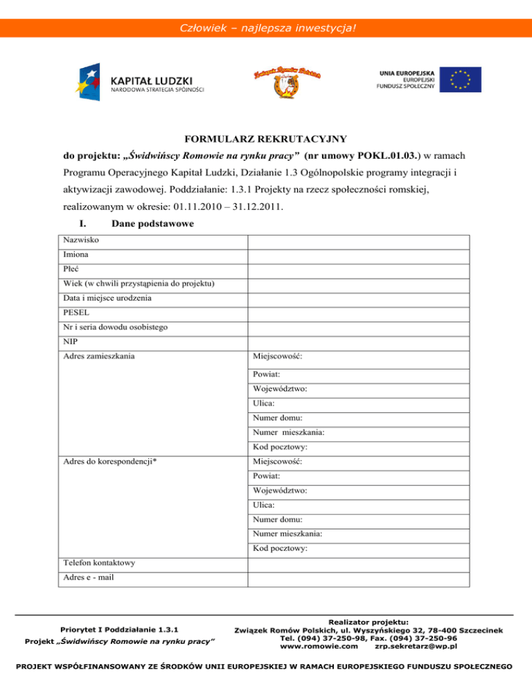 Człowiek – najlepsza inwestycja! FORMULARZ REKRUTACYJNY do projektu: „Świdwińscy Romowie na rynku pracy” (nr umowy POKL.01.03.) w ramach Programu Operacyjnego Kapitał Ludzki, Działanie 1.3 Ogólnopolskie programy integracji i aktywizacji zawodowej. Poddziałanie: 1.3.1 Projekty na rzecz społeczności romskiej, realizowanym w okresie: 01.11.2010 – 31.12.2011. I. Dane podstawowe Nazwisko Imiona Płeć Wiek (w chwili przystąpienia do projektu) Data i miejsce urodzenia PESEL Nr i seria dowodu osobistego NIP Adres zamieszkania Miejscowość: Powiat: Województwo: Ulica: Numer domu: Numer mieszkania: Kod pocztowy: Adres do korespondencji* Miejscowość: Powiat: Województwo: Ulica: Numer domu: Numer mieszkania: Kod pocztowy: Telefon kontaktowy Adres e - mail Priorytet I Poddziałanie 1.3.1 Projekt „Świdwińscy Romowie na rynku pracy” Realizator projektu: Związek Romów Polskich, ul. Wyszyńskiego 32, 78-400 Szczecinek Tel. (094) 37-250-98, Fax. (094) 37-250-96 www.romowie.com [email protected] PROJEKT WSPÓŁFINANSOWANY ZE ŚRODKÓW UNII EUROPEJSKIEJ W RAMACH EUROPEJSKIEGO FUNDUSZU SPOŁECZNEGO Człowiek – najlepsza inwestycja! Obszar Miejski Wiejski *jeśli jest taki sam jak adres zamieszkania – zostawić puste II. Wykształcenie (właściwe zaznaczyć znakiem X) Brak Niepełne podstawowe Podstawowe Gimnazjalne Ponadgimnazjalne Zasadnicze zawodowe Średnie zawodowe Średnie ogólnokształcące Wyższe zawodowe Wyższe III. Kryteria rekrutacji (właściwe zaznaczyć w 3 kolumnie znakiem X) 1. Bezrobotny/a Nieaktywny/a zawodowo Osoba niepełnosprawna 2. Osoba w wieku produkcyjnym (kobiety w wieku 18-59 lat, mężczyźni w wieku 18-64 lat) pozostająca bez zatrudnienia zarejestrowana w Powiatowym Urzędzie Pracy. Osoba nieaktywna zawodowo to osoba pozostającą bez zatrudnienia (kobiety w wieku 18-59 lat, mężczyźni w wieku 18-64 lat) niezatrudniona, niewykonująca innej pracy zarobkowej, zdolna i gotowa do podjęcia zatrudnienia lub innej pracy zarobkowej w co najmniej połowie wymiaru czasu pracy, która jednocześnie nie zalicza się do kategorii bezrobotni ( nie jest zarejestrowana w PUP). Osoba powyżej 18 r. życia posiadająca orzeczenie o stopniu niepełnosprawności. 3. Osoba pracująca (gdzie)lub prowadząca własną działalność gospodarczą (jaką ) Osoba ucząca się (gdzie) Priorytet I Poddziałanie 1.3.1 Projekt „Świdwińscy Romowie na rynku pracy” Realizator projektu: Związek Romów Polskich, ul. Wyszyńskiego 32, 78-400 Szczecinek Tel. (094) 37-250-98, Fax. (094) 37-250-96 www.romowie.com [email protected] PROJEKT WSPÓŁFINANSOWANY ZE ŚRODKÓW UNII EUROPEJSKIEJ W RAMACH EUROPEJSKIEGO FUNDUSZU SPOŁECZNEGO Człowiek – najlepsza inwestycja! Oczekiwania związane z udziałem w projekcie (ankieta potrzeb i motywacji) IV. 1. Co motywuje Pana/ią do wzięcia udziału w projekcie*? Zmiana sytuacji życiowej Znalezienie zatrudnienia Zmiana zatrudnienia Uzyskanie nowej wiedzy i umiejętności Nabycie nowych umiejętności związanych z poszukiwaniem pracy Inne (jakie) * można zaznaczyć więcej niż jedno pole 2. W ramach projektu wstępnie deklaruję chęć uczestnictwa w jednym z poniższych szkoleń (można dokonać wyboru jednego kursu, stawiając znak X) 1. Kurs Komputerowy/ 80 h 2. Kurs Prawa jazdy KAT B 3. Kurs na spawacza / 140 h 4. Kurs na operatora wózków widłowych /67 h 5. Operator żurawi przeładunkowych 36/h 6. Kurs wizażu i paznokcia / 100 h 7. Kurs na kucharza / 150 h 8. Kurs nowoczesny sprzedawca z obsługą kasy fiskalnej z fakturowaniem 50/h 9. Kurs krawiectwa / 150 h 10. Kurs gospodyni domowa /80 h Priorytet I Poddziałanie 1.3.1 Projekt „Świdwińscy Romowie na rynku pracy” Realizator projektu: Związek Romów Polskich, ul. Wyszyńskiego 32, 78-400 Szczecinek Tel. (094) 37-250-98, Fax. (094) 37-250-96 www.romowie.com [email protected] PROJEKT WSPÓŁFINANSOWANY ZE ŚRODKÓW UNII EUROPEJSKIEJ W RAMACH EUROPEJSKIEGO FUNDUSZU SPOŁECZNEGO Człowiek – najlepsza inwestycja! V. Źródło informacji o projekcie Ogłoszenia w prasie Strona internetowa Plakat Ulotka Przekaz słowny Inne (jakie) Deklaruję chęć wzięcia udziału w projekcie pt: „Świdwińscy Romowie na rynku pracy”, realizowanego przez Związek Romów Polskich z siedzibą w Szczecinku w ramach Programu Operacyjnego Kapitał Ludzki, , Działanie 1.3 Ogólnopolskie programy integracji i aktywizacji zawodowej. Poddziałanie: 1.3.1 Projekty na rzecz społeczności romskiej. Czytelny podpis uczestnika/czki projektu ……………………………….. Miejsce i data wypełnienia formularza………………………....…………… Wypełnia osoba rekrutująca: Beneficjent Ostateczny posiada/nie posiada stopień niepełnosprawności lekki umiarkowany - posiada orzeczenie o stopniu niepełnosprawności o numerze:…………. ………………………................................ Data i podpis osoby przyjmującej formularz Priorytet I Poddziałanie 1.3.1 Projekt „Świdwińscy Romowie na rynku pracy” Realizator projektu: Związek Romów Polskich, ul. Wyszyńskiego 32, 78-400 Szczecinek Tel. (094) 37-250-98, Fax. (094) 37-250-96 www.romowie.com [email protected] PROJEKT WSPÓŁFINANSOWANY ZE ŚRODKÓW UNII EUROPEJSKIEJ W RAMACH EUROPEJSKIEGO FUNDUSZU SPOŁECZNEGO Człowiek – najlepsza inwestycja! 1. Oświadczam, że: a) Zostałem/am poinformowana/y, że projekt jest współfinansowany ze środków Unii Europejskiej w ramach Europejskiego Funduszu Społecznego; b) W przypadku zakwalifikowania się do projektu zobowiązuje się do uczestnictwa we wszystkich zaplanowanych zajęciach i podpisywania listy obecności, wypełniania ankiet ewaluacyjnych; c) Wyrażam zgodę na pozostawienie w siedzibie Biura Projektu kserokopii dowodu tożsamości d) Wyrażam zgodę na przetwarzanie mojego wizerunku w dokumentacji fotograficznej tworzonej na potrzeby realizacji projektu e) Zapoznałem/am się z regulaminem procesu rekrutacji i selekcji. f) Nie jestem obję