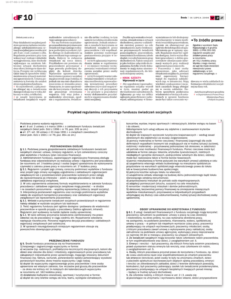 16-07-RZ-1-F-010-KO 10 Dokończenie ze str. 9 Przy działalności socjalnej podstawą prawną żądania ewentualnego udokumentowania sytuacji socjalnej pracownika jest art. 8 ust. 1 i ust. 2 ustawy o zfśs. Regulamin powinien przy tym wskazywać: rodzaje i składniki wynagrodzenia, inne dochody wpływające na ustalenie faktycznej sytuacji dochodowej oraz okres, którego te dane dotyczą. Przepisy nie wykluczają także innych sposobów dokumentowania sytuacji materialnej uprawnionych. Ustawa pozostawia tę kwestię do ustaleń stron regulaminu funduszu. # 8) częstotliwość, z jaką można ubiegać się o świadczenia danego rodzaju (raz w roku, kilka razy w roku, co kilka lat); # 9) zasady korzystania ze świadczeń socjalnych współ- Środa | 16 lipca 2008 małżonków zatrudnionych u tego samego pracodawcy; # Nie ma bowiem racjonalnego uzasadnienia przyznawanie świadczeń tego samego rodzaju w podwójnej wysokości, tylko dlatego że małżonkowie są pracownikami tego samego zakładu. Dotyczy to zwłaszcza świadczeń na rzecz dzieci. Przykładowo nie powinno się pracownikowi przyznawać z tego powodu podwójnej dopłaty do kolonii dziecka. Wprawdzie uprawnienie do korzystania z pomocy socjalnej ma pracownik i jego rodzina, to jednak nie ma ono charakteru roszczenia ze stosunku pracy. Oznacza to, że samo uprawnienie do korzystania z funduszu nie gwarantuje otrzymania wsparcia. Gdy więc jeden z małżonków otrzymuje, zgodnie z regulaminem, świadcze- nie dla siebie i rodziny, to tym samym ta rodzina zrealizowała uprawnienie. Jednak ostatecznie o zasadach korzystania ze świadczeń socjalnych przez pracowników i ich współmałżonków powinny rozstrzygać postanowienia przyjęte w regulaminie. # 10) tryb zgłaszania i wprowadzania zmian w regulaminie; # 11) miejsce i terminy występowania z wnioskami o świadczenia socjalne przez osoby uprawnione; # 12) tryb rozpatrywania i załatwiania wniosków o świadczenia z możliwością wprowadzenia wewnętrznej procedury odwoławczej w razie negatywnej decyzji o ich przyznaniu; # 13) przyjęte u pracodawcy wzory dokumentów przydatnych w organizowaniu działalności socjalnej; Zwykle są to wnioski o świadczenia, oświadczenia o sytuacji dochodowej, umowy o udzielenie zwrotnej pomocy na cele mieszkaniowe, karty ewidencyjne przyznawanych świadczeń poszczególnym pracownikom, emerytom iich rodzinom, tabele dopłat z wyodrębnieniem grup dochodowych. Należy oznaczyć je jako kolejne załączniki do regulaminu, bo tylko wtedy dokumenty te mają status unormowań regulaminowych, do których stosujemy ustawę. # KROK SZÓSTY: Wprowadź w życie # Aby uzgodniony i sporządzony regulamin socjalny wszedł w życie, musimy podać go do wiadomości zatrudnionych. Ogłaszamy go więc na tablicy ogłoszeń, przez firmowy radiowęzeł, udostępniamy w firmo- ◊ rp .pl wym intranecie lub drukujemy i przekazujemy w miarę możliwości wszystkim pracownikom. Zacznie on obowiązywać po Zgodnie z wyrokiem Sądu upływie dwóch tygodni od upuNajwyższego z 6 grudnia blicznienia go w opisany spo2001 r. (I PKN 355/00) sób. Regulamin musi być ogólregulamin socjalny jest nie dostępny. Jest to wyraz dbaźródłem prawa pracy łości pracodawcy o dobro praw rozumieniu cowników (dostarczanie inforart. 9 § 1 kodeksu pracy. macji ważnych przy realizacji Wynika z niego również, uprawnień pracowniczych). że sąd nie może stwierdzić # Pracownicy i inne osoby nieważności prawa uprawnione, jako adresaci zakładowego, w tym świadczeń socjalnych, powinni regulaminu socjalnego. ∑ mieć zapewniony bieżący wgląd do regulacji zakładowych (np. w intranecie). Mają dawana w wielu zakładach inwiedzieć, o jaką pomoc i na ja- formacja o działalności socjalkich zasadach mogą ubiegać nej na dany rok. się w swoim zakładzie. Dobrym sposobem podawania Autorka jest głównym specjalistą # w Departamencie Prawa Pracy wiadomości o bieżących ustaleniach w sprawie funduszu Ministerstwa Pracy może być także corocznie wyi Polityki Socjalnej >To źródło prawa Przykład regulaminu zakładowego funduszu świadczeń socjalnych 1 Podstawa prawna wydania regulaminu: ∑ art. 8 ust. 2 ustawy z 4 marca 1994 r. o zakładowym funduszu świadczeń socjalnych (tekst jedn. DzU z 1996 r. nr 70, poz. 335 ze zm.) ∑ art. 27 i art. 30 ustawy z 23 maja 1991 r. o związkach zawodowych (tekst jedn. DzU z 2001 r. nr 79, poz. 854 ze zm.) POSTANOWIENIA OGÓLNE § 1.1. Podstawę prawną gospodarowania zakładowym funduszem świadczeń socjalnych stanowi: ustawa, niniejszy regulamin, w tym zatwierdzony coroczny plan wydatków z funduszu (plan rzeczowo-finansowy). 2. Administratorem funduszu, zapewniającym organizacyjno-finansową obsługę funduszu oraz odpowiedzialnym za realizację ustawy i regulaminu jest pracodawca (w rozumieniu art. 3 kodeksu pracy) i osoba (organ) upoważniona do wykonywania czynności z zakresu prawa pracy w rozumieniu art. 31 kodeksu pracy. § 2.1. Regulamin i projekt jego zmiany, coroczny preliminarz wydatków z funduszu oraz projekt jego zmiany wymagają uzgodnienia z zakładowymi organizacjami związkowymi lub z przedstawicielem pracowników wybranym przez załogę do reprezentowania jej interesów – jeżeli u danego pracodawcy nie działa zakładowa organizacja związkowa. 2. W celu usprawnienia ustawowej formuły współstanowienia w zakresie funduszu pracodawca i zakładowe organizacje związkowe mogą powołać – w drodze i na zasadach porozumienia – wspólną reprezentację (roboczy zespół socjalny). 3. Interpretacja postanowień regulaminu oraz rocznego preliminarza wydatków należy do wspólnych kompetencji pracodawcy oraz zakładowych organizacji związkowych lub reprezentanta pracowników. § 3.1. Wnioski o przyznanie świadczeń socjalnych przewidzianych w regulaminie należy składać w wydziale socjalnym lub kadrowym. 2. Treść regulaminu funduszu jest ogólnie dostępna i podawana do wiadomości pracowników w spos
