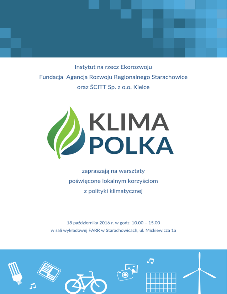 Instytut na rzecz Ekorozwoju Fundacja Agencja Rozwoju Regionalnego Starachowice oraz ŚCITT Sp. z o.o. Kielce zapraszają na warsztaty poświęcone lokalnym korzyściom z polityki klimatycznej 18 października 2016 r. w godz. 10.00 – 15.00 w sali wykładowej FARR w Starachowicach, ul. Mickiewicza 1a Polityka klimatyczna i wynikająca z niej gospodarka niskoemisyjna to nie tylko inwestycje w skali kraju, to nie tylko hasła ekspertów ochrony środowiska i wytyczne Unii Europejskiej. To również działania, które można realizować lokalnie i czerpać z nich wymierne korzyści. Mamy na to dowody – a raczej Wy je macie – w swojej okolicy. Przyjdź na warsztaty, a pomożemy Ci je dostrzec! Na warsztatach: Zaprezentujemy technologie odnawialnych źródeł energii, które można stosować na skalę lokalną i indywidualną. Powiemy jakie korzyści można czerpać z zastosowania technologii zwiększających efektywność energetyczną i które z nich najlepiej wybrać. Pokażemy, gdzie szukać wsparcia dla realizacji tego typu przedsięwzięć. Odwiedzimy Laboratorium Badawcze Biomasy Stałej, Biogazu i Biopaliw oraz Sposobów ich Efektywnego Wykorzystania Energetycznego. Będzie można dopytać się o szczegóły dotyczące ekonomiki, technologii i praktycznego zastosowania wybranych rozwiązań. Warsztaty odbędą się 18 października 2016 r. w godz. 10.00 – 15.00 w sali wykładowej FARR w Starachowicach, ul. Mickiewicza 1a Zgłoszenia na warsztaty przyjmujemy do piątku 14 października 2016 r. pod adresem e-mail: [email protected], tel. 22 851 04 03 Na warsztaty zapraszają Fundacja Agencja Rozwoju Regionalnego Starachowice, ŚCITT Sp. z o.o. Kielce, Prezes Instytutu na rzecz Ekorozwoju oraz cały zespół projektu KLIMAPOLKA Liczymy na Państwa obecność! RAMOWY PROGRAM WARSZTATU KLIMAPOLKA 18 października 2016 r. godz. 10.00 - 15.00 Laboratorium Badawcze Biomasy Stałej, Biogazu i Biopaliw oraz Sposobów ich Efektywnego Wykorzystania Energetycznego Rejestracja od godz. 9.30, sala wykładowa FARR, ul. Mickiewicza 1a Część I: Korzyści z polityki klimatycznej Otwarcie warsztatów Prezentacja projektu oraz publikacji „KLIMAPOLKA – przewodnik po korzyściach z polityki klimatycznej” Jakie są możliwości rozwoju gospodarki niskoemisyjnej w woj. świętokrzyskim? Gdzie szukać wsparcia finansowego i niefinansowego? [Przerwa kawowa] Część II: Inwestycje w odnawialne źródła energii i efektywność energetyczną w praktyce Wizyta w Laboratorium Badawczym Biomasy Stałej, Biogazu i Biopaliw oraz Sposobów ich Efektywnego Wykorzystania Energetycznego. Wizyta odbędzie się w dwóch grupach: część analityczna (dr Anna Twarowska) część biogazowa i kogeneracyjna (dr inż. Włodzimierz Grochal i Wojciech Kurdziel) Bioelektrownie świętokrzyskie (Wojciech Łukaszek, EkoEnergia) Dyskusja na temat możliwości realizacji podobnych inwestycji na poziomie lokalnym i indywidualnym Podsumowanie [Poczęstunek] Dzięki polityce energetyczno-klimatycznej Unii Europejskiej, w Polsce, na inwestycje w modernizację energetyczną dostępne jest ponad 60 mld złotych. Dwie trzecie tej kwoty może trafić do lokalnych samorządów, firm i organizacji. Dzięki tym pieniądzom mogą powstać nowe elektrownie wykorzystujące odnawialne źródła energii, można będzie ocieplić budynki mieszkalne, a nieefektywne i wysokoemisyjne systemy grzewcze zastąpić sprawniejszymi, przyjaznymi dla środowiska i mieszkańców. Będzie można zmodernizować wiele szkół, przedszkoli, urzędów, zakupić nowe niskoemisyjne pojazdy transportu publicznego. Wszystkie te inwestycje pozwolą nam odetchnąć czystszym powietrzem. Będą miały również wymierne korzyści finansowe generowane znaczną oszczędnością energii. To także poprawa wizerunku przedsiębiorstwa czy samorządu lokalnego, większa konkurencyjność, ale przede wszystkim lepsza jakość życia mieszkańców. Podczas warsztatów odwiedzimy Laboratorium Badawczym Biomasy Stałej, Biogazu i Biopaliw oraz Sposobów ich Efektywnego Wykorzystania Energetycznego. Uczestnicy warsztatów będą mogli dopytywać się o szczegóły dotyczące ekonomiki, technologii i praktycznego zastosowania wybranych rozwiązań. Laboratorium, które otwarto równo rok temu powstało dzięki zaangażowaniu Świętokrzyskiego Centrum Innowacji i Transferu Technologii oraz fundacji Agencja Rozwoju Regionalnego w Starachowicach. Jego koncepcja zakłada zrównoważony rozwój energetyczny regionu poprzez wykorzystanie odnawialnych lokalnych źródeł energii oraz odpadów w celu wytwarzania energii cieplnej i elektrycznej w kogeneracji. Obiekt podzielony jest na trzy obszary przestrzenne i funkcjonalne: część analityczną, kogeneracyjną i fermentacyjną. Instytut na rzecz Ekorozwoju (InE) jest pozarządową organizacją typu think-tank, której misją jest budowanie pomostów między ochroną środowiska a gospodarką i społeczeństwem. Motto Instytutu brzmi: „W interesie przyszłych pokoleń”. W projekcie „Polityka klimatyczna szansą dla Polski. Jak ją wykorzystać? (KLIMAPOLKA)” prezentujemy korzyści płynące z wdrażania gospodarki niskoemisyjnej również na poziomie lokalnym – dla samorządów, przedsiębiorców i indywidualnych gospodarstw domowych, czyli bezpośrednio dla każdego z nas. Projekt „Polityka klimatyczna szansą dla Polski. Jak ją wykorzystać? (KLIMAPOLKA)” jest realizowany przez Instytut na rzecz Ekorozwoju i dofinansowany ze środków Narodowego Funduszu Ochrony Środowiska i Gospodarki Wodnej.