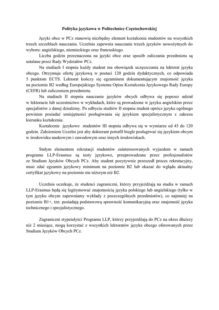 Polityka językowa w Politechnice Częstochowskiej Języki obce w PCz stanowią niezbędny element kształcenia studentów na wszystkich trzech szczeblach nauczania. Uczelnia zapewnia nauczanie trzech języków nowożytnych do wyboru: angielskiego, niemieckiego oraz francuskiego. Liczba godzin przeznaczona na języki obce oraz sposób zaliczania przedmiotu są ustalane przez Rady Wydziałów PCz. Na studiach I stopnia każdy student ma obowiązek uczęszczania na lektorat języka obcego. Otrzymuje ofertę językową w postaci 120 godzin dydaktycznych, co odpowiada 5 punktom ECTS. Lektorat kończy się egzaminem dokumentującym znajomość języka na poziomie B2 według Europejskiego Systemu Opisu Kształcenia Językowego Rady Europy (CEFR) lub zaliczeniem przedmiotu. Na studiach II stopnia nauczanie języków obcych odbywa się poprzez udział w lektoracie lub uczestnictwo w wykładach, które są prowadzone w języku angielskim przez specjalistów z danej dziedziny. Po odbyciu studiów II stopnia student oprócz języka ogólnego powinien posiadać umiejętności posługiwania się językiem specjalistycznym z zakresu kierunku kształcenia. Kształcenie językowe studentów III stopnia odbywa się w wymiarze od 45 do 120 godzin. Założeniem Uczelni jest aby doktorant potrafił biegle posługiwać się językiem obcym w środowisku naukowym i zawodowym oraz innych środowiskach. Stałym elementem rekrutacji studentów zainteresowanych wyjazdem w ramach programu LLP-Erasmus są testy językowe, przeprowadzane przez profesjonalistów ze Studium Języków Obcych PCz. Aby student pozytywnie przeszedł proces rekrutacyjny, musi zdać egzamin językowy minimum na poziomie B2 lub okazać do wglądu aktualny certyfikat językowy na poziomie nie niższym niż B2. Uczelnia oczekuje, że studenci zagraniczni, którzy przyjeżdżają na studia w ramach LLP-Erasmus będą się legitymować znajomością języka polskiego lub angielskiego (tylko w tym języku obcym zapewniamy wykłady z poszczególnych przedmiotów), co najmniej na poziomie B1+, tzn. posiadają podstawową sprawność komunikacyjną oraz znajomość języka technicznego i specjalistycznego. Zagraniczni stypendyści Programu LLP, którzy przyjeżdżają do PCz na okres dłuższy niż 2 miesiące, mogą korzystać z wszystkich lektoratów języka obcego oferowanych przez Studium Języków Obcych PCz.