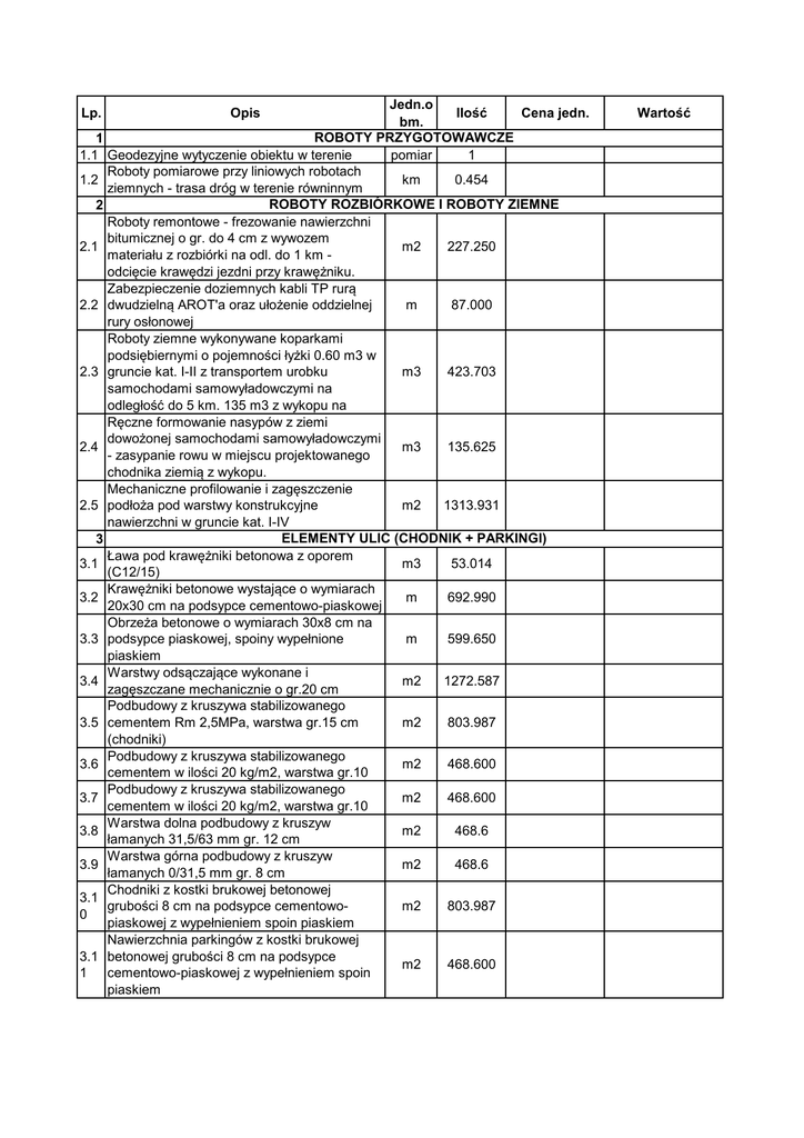Jedn.o Ilość Cena jedn. bm. ROBOTY PRZYGOTOWAWCZE 1 1.1 Geodezyjne wytyczenie obiektu w terenie pomiar 1 Roboty pomiarowe przy liniowych robotach 1.2 km 0.454 ziemnych - trasa dróg w terenie równinnym ROBOTY ROZBIÓRKOWE I ROBOTY ZIEMNE 2 Roboty remontowe - frezowanie nawierzchni bitumicznej o gr. do 4 cm z wywozem 2.1 m2 227.250 materiału z rozbiórki na odl. do 1 km odcięcie krawędzi jezdni przy krawężniku. Zabezpieczenie doziemnych kabli TP rurą 2.2 dwudzielną AROT'a oraz ułożenie oddzielnej m 87.000 rury osłonowej Roboty ziemne wykonywane koparkami podsiębiernymi o pojemności łyżki 0.60 m3 w 2.3 gruncie kat. I-II z transportem urobku m3 423.703 samochodami samowyładowczymi na odległość do 5 km. 135 m3 z wykopu na Ręczne formowanie nasypów z ziemi dowożonej samochodami samowyładowczymi 2.4 m3 135.625 - zasypanie rowu w miejscu projektowanego chodnika ziemią z wykopu. Mechaniczne profilowanie i zagęszczenie 2.5 podłoża pod warstwy konstrukcyjne m2 1313.931 nawierzchni w gruncie kat. I-IV ELEMENTY ULIC (CHODNIK + PARKINGI) 3 Ława pod krawężniki betonowa z oporem 3.1 m3 53.014 (C12/15) Krawężniki betonowe wystające o wymiarach 3.2 m 692.990 20x30 cm na podsypce cementowo-piaskowej Obrzeża betonowe o wymiarach 30x8 cm na 3.3 podsypce piaskowej, spoiny wypełnione m 599.650 piaskiem Warstwy odsączające wykonane i 3.4 m2 1272.587 zagęszczane mechanicznie o gr.20 cm Podbudowy z kruszywa stabilizowanego 3.5 cementem Rm 2,5MPa, warstwa gr.15 cm m2 803.987 (chodniki) Podbudowy z kruszywa stabilizowanego 3.6 m2 468.600 cementem w ilości 20 kg/m2, warstwa gr.10 Podbudowy z kruszywa stabilizowanego 3.7 m2 468.600 cementem w ilości 20 kg/m2, warstwa gr.10 Warstwa dolna podbudowy z kruszyw 3.8 m2 468.6 łamanych 31,5/63 mm gr. 12 cm Warstwa górna podbudowy z kruszyw 3.9 m2 468.6 łamanych 0/31,5 mm gr. 8 cm Chodniki z kostki brukowej betonowej 3.1 m2 803.987 grubości 8 cm na podsypce cementowo0 piaskowej z wypełnieniem spoin piaskiem Nawierzchnia parkingów z kostki brukowej 3.1 betonowej grubości 8 cm na podsypce m2 468.600 1 cementowo-piaskowej z wypełnieniem spoin piaskiem Lp. Opis Wartość Ręczne formowanie nasypów z ziemi 3.1 m3 5.236 dowożonej samochodami samowyładowczymi 2 (kat.gr.III-IV) - formowanie zielenców 3.1 Humusowanie zieleńców z obsianiem przy m2 26.18 3 grub.warstwy humusu 5 cm 3.1 Humusowanie skarp z obsianiem dodatek za m2 26.18 4 każde nast.5 cm humusu ODWODNIENIE 4 Przepusty rurowe pod zjazdami - ława 4.1 m3 2.940 fundamentowa żwirowa Przepusty rurowe pod zjazdami - rury 4.2 m 21.000 betonowe o śr. 50 cm Przepusty rurowe pod zjazdami - ścianki 4.3 ściank. 1.000 czołowe dla rur o śr. 50 cm Studnie rewizyjne o śr. 1000 mm (studnia na 4.4 kpl. 1 przepuście) Roboty remontowe - frezowanie nawierzchni bitumicznej o gr. do 4 cm z wywozem 4.5 m2 20.800 materiału z rozbiórki na odl. do 1 km odcięcie krawędzi jezdni przy krawężniku. Roboty ziemne wykonywane koparkami podsiębiernymi o pojemności łyżki 0.60 m3 w 4.6 gruncie kat. I-II z transportem urobku m3 13.300 samochodami samowyładowczymi na odległość do 1 km (pod przykanaliki) Wykopy jamiste wykonywane koparkami podsiębiernymi 0.40 m3 na odkład (pod 4.7 m3 18.840 studzienki ściekowe z osadnikiem oraz studnie rewizyjną) Studzienki ściekowe, z osadnikiem, o śr. 500 4.8 kpl. 2 mm Przykanaliki z rur z tworzyw sztucznych 4.9 m 10.000 dwuściennych o śr. nom. 200 mm 4.1 Oczyszczenie rowów z namułu o grub. 30 cm m 44.000 0 z wyprofilowaniem skarp rowu ZJAZDY INDYWIDUALNE 5 Obrzeża betonowe o wymiarach 30x8 cm na 5.1 podsypce piaskowej, spoiny wypełnione m 56.200 piaskiem Warstwy odsączające wykonane i 5.2 m2 93.500 zagęszczane mechanicznie o gr.20 cm Podbudowy z gruntu stabilizowanego 5.3 m2 93.5 cementem Rm 2,5 MPa, warstwa gr.10 cm Warstwa dolna podbudowy z kruszyw 5.4 m2 93.5 łamanych 31,5/63 mm gr. 12 cm Warstwa górna podbudowy z kruszyw 5.5 m2 93.5 łamanych 0/31,5 mm gr. 8 cm Nawierzchnia z kostki brukowej betonowej grubości 8 cm na podsypce cementowo5.6 m2 93.5 piaskowej grubości 5 cm z wypełnieniem spoin piaskiem ROBOTY ODTWORZENIOWE 6 Ręczne formowanie nasypów z ziemi dowożonej samochodami samowyładowczymi 6.1 m3 1.300 - odtworzenie konstrukcji jezdni po wbudowaniu przykanalików Warstwy odsączające wykonane i m2 26.000 zagęszczane mechanicznie o gr.20 cm Podbudowy z kruszywa stabilizowanego 6.3 m2 26.000 cementem Rm 2,5MPa, warstwa gr.15 cm Warstwa dolna podbudowy z kruszyw 6.4 m2 26.000 łamanych 31,5/63 mm gr. 12 cm Warstwa górna podbudowy z kruszyw 6.5 m2 26.000 łamanych 5/31,5 mm gr. 8 cm Skropienie nawierzchni drogowej emulsją 6.6 asfaltową szybkorozpadową niemodyfikowaną m2 26 K1-60 Nawierzchnia z mieszanek mineralno6.7 bitumicznych grysowych 0/16 mm - warstwa m2 26 wiążąca asfaltowa - grubość po zagęszcz. 7 Skropienie nawierzchni drogowej emulsją 6.8 asfaltową szybkorozpadową niemodyfikowaną m2 26 K1-60 Nawierzchnia z mieszanek mineralnobitumicznych grysowych 0/11 mm - warstwa 6.9 m2 26 ścieralna asfaltowa - grubość po zagęszcz. 5 cm 6.1 Mechaniczne czyszczenie nawierzchni m2 227.25 0 drogowej ulepszonej (bitum) Skropienie nawierzchni drogowej emulsją 6.1 asfaltową szybkorozpadową niemodyfikowaną m2 227.25 1 K1-60 Nawierzchnia z mieszanek mineralno6.1 bitumicznych grysowych 0/11 mm - warstwa m2 227.25 2 ścieralna asfaltowa - grubość po zagęszcz. 4 cm 6.1 Regulacja wysokościowa zaworów szt 2 3 wodociągowych OZNAKOWANIE PIONOWE I POZIOME 7 Słupki do znaków drogowych z rur stalowych 7.1 szt. 2 o śr. 70 mm Przymocowanie tablic znaków drogowych 7.2 zakazu, nakazu, ostrzegawczych, szt. 4 informacyjnych o powierzchni ponad 0.3 m2 Ręczne malowanie linii na skrzyżowaniach i 7.3 przejściach dla pieszych farbą m2 8 chlorokauczukową ROBOTY GEODEZYJNE 8 Odtworzenie punktów stałej osnowy 8.1 szt 2 geodezyjnej 6.2 8.2 Geodezyjna inwentaryzacja powykonawcza NETTO VAT BRUTTO pomiar 1