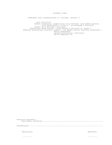 Przedmiar robót Przebudowa sieci energetycznych ul. Korczaka odcinek II Data: 2010-07-08 Budowa: Przebudowa i modernizacja ulicy Korczaka oraz budowa łącznika ulicy Bardiowskiej z ulicą 11 - go Listopada w Gorlicach Obiekt: Ulica Korczaka w Gorlicach Zamawiający: Gmina Miejska - Urząd Miejski w Gorlicach ul. Rynek 2 Jednostka opracowująca kosztorys: Compact - chs Spółka Cywilna Stanisław Chumikowski i Marcin Chumikowski Zaklad Projektowania i Realizacji 38-333 Zagórzany 720 Kosztorys opracowali: Irena Kwoka, projektant ........................................................................... Sprawdzający: ......................................................................................... Zamawiający: Wykonawca: .......... .......... Przebudowa sieci energetycznych ul. Korczaka odcinek II Zuzia (C) DataComp 1994-2009(lic. 14697) Ogólna charakterystyka obiektów lub robót Kosztorys obejmuje: - przebudowę odcinka linii napowietrznej nN i oswietlenia ulic na odcinku kolizji z projektowaną modernizacją ulicy Korczaka: - przełożenie istniejących kabli nN na odcinku kolizji z projektowanym wjazdem - przebudowa istniejących słupów linii napowietrznej nN kolidujących z projektowana inwestycją - przełożenie istniejacego słupa oświetleniowego usytuowanego przy ul. Hallera - zabezpieczenie skrzyżowań kabli z istniejącym uzbrojeniem oraz projektowaną jezdnią - rozebranie nawierzchni w celu wykonania zabezpieczeń rurami ochronnymi istniejących kabli na skrzyzowaniu z poszerzeniem nawierzchni utwardzonych uwzgledniono w przedmiarze robot drogowych Przedmiar robót Podstawa nakładu, opis pozycji, wyliczenie ilości robót Ilość Krot. Jedn. 1 Demontaż fragmentu sieci napowietrznej nN i oswietlenia ulicznego 1.1 Kody CPV: 45231400-9 Roboty budowlane w zakresie budowy linii energetycznych KNR 510/9931/5 Zeszyt 8/9 1993r. Demontaż słupów oświetleniowych, mechaniczny, słup WZ-9 - p.a. słup oświetleniowy stalowy z wysięgnikiem 1 słup 1.2 Kody CPV: 45231400-9 Roboty budowlane w zakresie budowy linii energetycznych KNR 510/9923/3 Zeszyt 7 1993r. Demontaż mechaniczny słupów żelbetowych, słup bliźniaczy do 10·m 1 szt 1.3 KNR 510/9923/1 Zeszyt 7 1993r. Demontaż mechaniczny słupów żelbetowych, słup pojedynczy do 10·m 1 szt 1.4 Kody CPV: 45231400-9 Roboty budowlane w zakresie budowy linii energetycznych KNR 510/9923/5 Zeszyt 7 1993r. Demontaż mechaniczny słupów żelbetowych, słup rozkraczny do 10·m 1 szt 1.5 Kody CPV: 45231400-9 Roboty budowlane w zakresie budowy linii energetycznych KNR 510/9934/1 Zeszyt 12 1993r. Montaż przewodów izolowanych linii napowietrznych niskiego napięcia z dodatkowym przewodem oświetleniowym typu AsXSn lub podobnym, ręcznie, przewód izolowany 4x70+25·mm2 - p.a. demontaż 0,04 km 1.6 Kody CPV: 45231400-9 Roboty budowlane w zakresie budowy linii energetycznych KNR 403/1144/4 Demontaż przewodów, przyłączy i przerzutów, z wejściem na słup lub z drabin, długość przyłącza do 30·m, 4 przewody w przyłączu 1 kpl 2 Przebudowa fragmentu sieci 2.1 Nr STWiOR: ST str 6 Kody CPV: 45231400-9 Roboty budowlane w zakresie budowy linii energetycznych KNR 201/701/3 (2) Ręczne kopanie rowów dla kabli, szerokość dna do 0.4·m, kategoria gruntu IV, głębokość rowu do 0.8·m 153,5 m 2.2 Nr STWiOR: ST str 6 Kody CPV: 45231400-9 Roboty budowlane w zakresie budowy linii energetycznych KNR 201/701/5 (3) Ręczne kopanie rowów dla kabli, szerokość dna do 0.6·m, kategoria gruntu III, głębokość rowu do 1.0·m 81 m 2.3 Nr STWiOR: ST str 3 Kody CPV: 45231400-9 Roboty budowlane w zakresie budowy linii energetycznych KNR 510/301/1 Nasypanie warstwy piasku na dnie rowu kablowego, o szerokości do 0,4·m 256 m 2.4 Nr STWiOR: ST str.3, 9 Kody CPV: 45231400-9 Roboty budowlane w zakresie budowy linii energetycznych KNR 510/303/1 Układanie rur ochronnych z PCW w wykopie, rura do Fi·75·mm - DVK 75 13,5 m 2.5 KNR 510/303/1 Układanie rur ochronnych z PCW w wykopie, rura do Fi·75·mm- p.a A 75PS 6 m ul. Korczaka odcinek II strona nr: 2 Przebudowa sieci energetycznych ul. Korczaka odcinek II Zuzia (C) DataComp 1994-2009(lic. 14697) Podstawa nakładu, opis pozycji, wyliczenie ilości robót 2.6 Nr STWiOR: ST str 3, 9 Kody CPV: 45231400-9 Roboty budowlane w zakresie budowy linii energetycznych KNR 510/303/3 Układanie rur ochronnych z PCW w wykopie, rura do Fi·140·mm -p.a. A 160 PS 2.7 Nr STWiOR: ST str 3, 9 Kody CPV: 45231400-9 Roboty budowlane w zakresie budowy linii energetycznych KNR 510/303/2 Układanie rur ochronnych z PCW w wykopie, rura do Fi·110·mm - rura typu A 110PS 2.8 Nr STWiOR: ST str 10 Kody CPV: 45231400-9 Roboty budowlane w zakresie budowy linii energetycznych KNR 510/114/2 Układanie kabli wielożyłowych w rurach, pustakach lub kanałach zamkniętych, do 1,0·kg/m - istniejący kabel YAKY 4x35 mm2 2.9 Nr STWiOR: ST str 10 Kody CPV: 45231400-9 Roboty budowlane w zakresie budowy linii energetycznych KNR 510/114/2 Układanie kabli wielożyłowych w rurach, pustakach lub kanałach zamkniętych, do 1,0·kg/m - kabel YAKXS 2x35 mm2 2.10 Nr STWiOR: ST str 10 Kody CPV: 45231400-9 Roboty budowlane w zakresie budowy linii energetycznych KNR 510/114/3 Układanie kabli wielożyłowych w rurach, pustakach lub kanałach zamkniętych, do 3,0·kg/m - kabel istniejącey YAKY 4x120 mm2 2.11 Nr STWiOR: ST str 10 Kody CPV: 45231400-9 Roboty budowlane w zakresie budowy linii energetycznych KNR 510/114/4 Układanie kabli wielożyłowych w rurach, pustakach lub kanałach zamkniętych, do 5,5·kg/m - kabel istniejący XUHAKXS 3x(1x120 )mm2 2.12 Nr STWiOR: ST str 7 Kody CPV: 45231400-9 Roboty budowlane w zakresie budowy linii energetycznych KNR 510/103/2 (1) Układanie kabli wielożyłowych układanych ręcznie w rowach kablowych, kabel do 1,0·kg/m, przykrycie kabla folią kalandrowaną z PCW uplastycznionego - kabel YAKXS 2x35 mm2 2.13 Nr STWiOR: ST str 7 Kody CPV: 45231400-9 Roboty budowlane w zakresie budowy linii energ