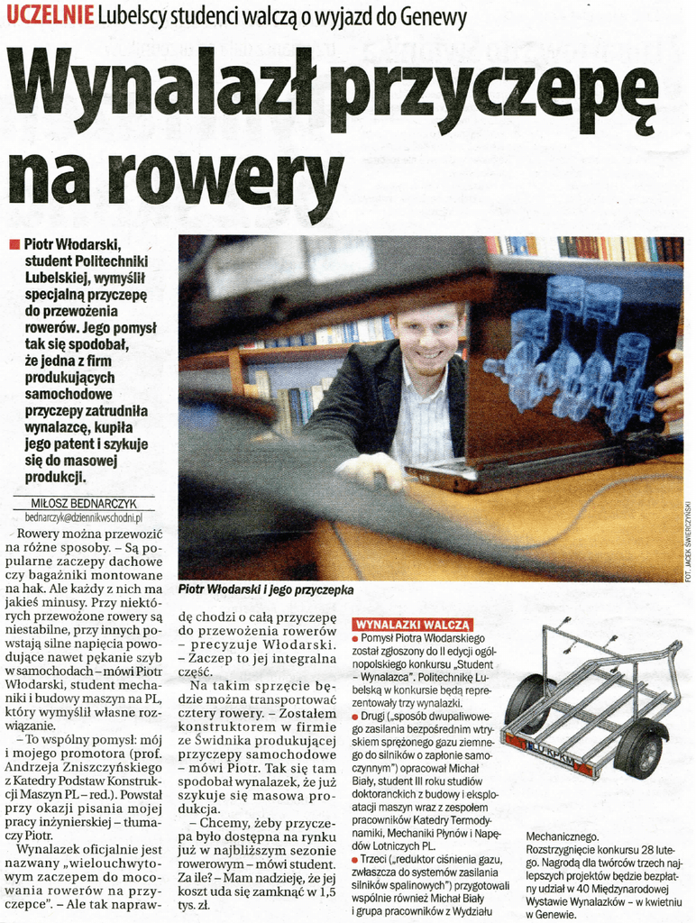 UCZELNIE Lubelscy studenci walczq 0 wyjazd do Genewy Wynalazt pnyczepf na rowery • Piotr wtodarski, student Politeclinil(i Lubelsltiej, wymysiit specjaln^przyczepQ do przewozenia rowerow. Jego pomyst taksi^ spodobat, ' zejednazfirm produkuj^cych samocliodowe przyczepy zatrudnita wynalazc^, kupita jego patent i szykuje siQ do masowej produkcji. MILOSZBEDNARCZYK [email protected] Rowery mozna przewozic na rozne sposoby. - popularne zaczepy dachowe czy bagazniki montowane na hak. Ale kazdy z nich ma jakies minusy. Przy niektorych przewozone rowery niestabilne, przy innych powstaj^ silne napi^cia powodujqce nawet p^kanie szyb w samochodach - mowi Piotr Wlodarski, student mechaniki i budowy maszyn na PL, ktory wymyslil wlasne rozwi^anie. - To wspolny pomysl: moj i mojego promotora (prof. Andrzeja Zniszczynskiego z Katedry Podstaw Konstrukcji Maszyn PL - red.). Powstal przy okazji pisania mojej pracy inzynierskiej - tiumaczy Piotr. Wynalazek oficjalnie jest nazwany „wielouchwytowym zaczepem do mocow a n i a rowerow n a przyczepce". - Ale tak napraw- Piotr Wtodarski ijego przyczepka d^ chodzi o caiq przyczepy do przewozenia rowerow - precyzuje Wlodarski. - Zaczep to jej integralna cz^sc. N a t a k i m sprz^cie b ? dzie mozna transportowac cztery rowery. - Zostaiem konstruktorem w firmie ze Swidnika produkuj^cej przyczepy samochodowe - mowi Piotr. Tak si§ t a m spodobal wynalazek, ze juz szykuje siq masowa p r o dukcja. - Chcemy, zeby przyczepa bylo dostQpna na rynku juz w najblizszym sezonie rowerowym - mowi student. Za Ue? - Mam nadziej^, ze jej koszt uda si^ zamknqc w 1,5 tys.zl. WYNALAZKI WALCZ^ • Pomyst Piotra Wtodarskiego zostal zgtoszony do II edycji ogolnopolskiego konkursu „Student - Wynalazca". PolitechnikQ Lubelskq w konkursie b^dq reprezentowaly trzy wynaiazkl. • Drugi („spos6b dwupaliwowego zasilania bezposrednim wtrysklem sprQzonego gazu zlemnego do silnikow o zaptonie samoczynnym") opracowat MichaJ Biafy, student III roku studiow doktoranckich z budowy i eksploatacji maszyn wraz z zespotem pracownikow Katedry Termodynamiki, Mechaniki Ptynow i NapQ- Mechanicznego. dow Lotniczych PL. Rozstrzygni^cie konkursu 28 lute• Trzeci („reduktor cisnienia gazu, go. Nagrodq dia tworcowtrzech najzwtaszcza do systemow zasilania lepszych projektow b^dzie bezptatsilnikow spalinowych") przygotowali ny udziat w 40 Miedzynarodowej wspolnie rowniez Michat Biafy Wystawie Wynalazkow - w kwietniu i grupa pracownikow z Wydziatu w Genewie.