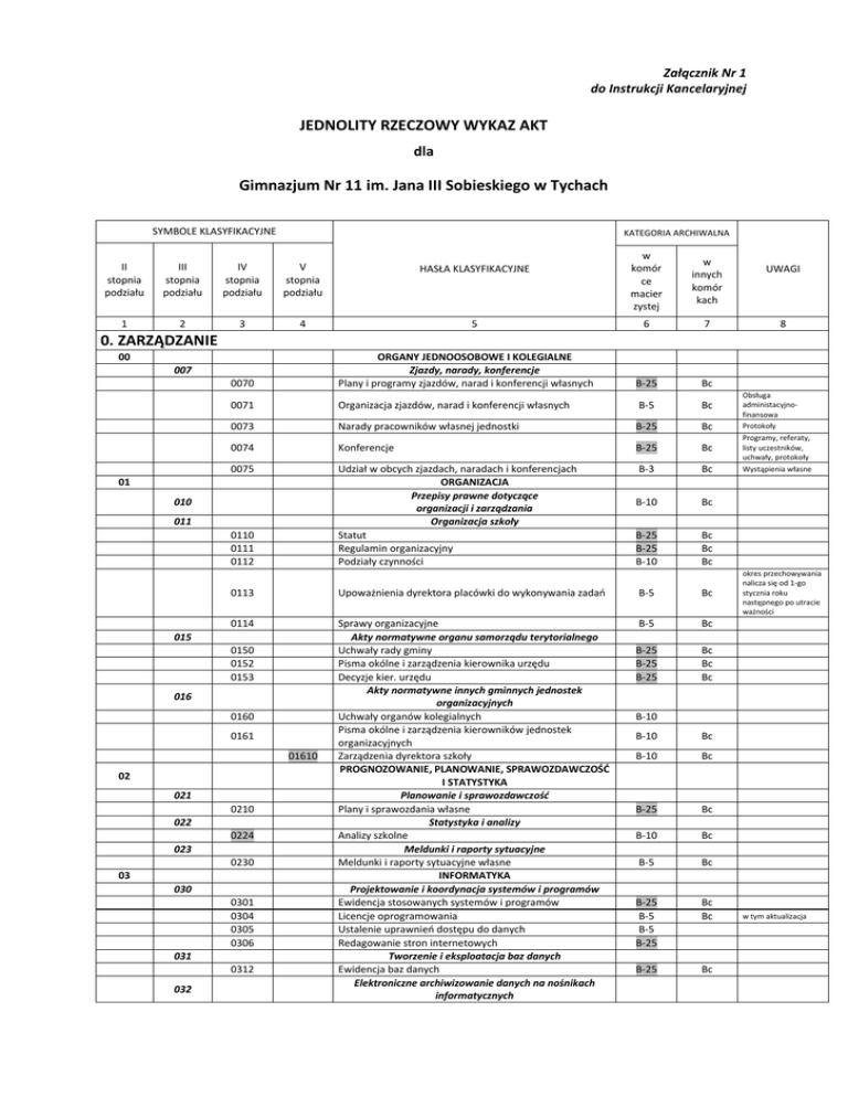 JEDNOLITY RZECZOWY WYKAZ AKT Gimnazjum Nr 11 im. Jana III