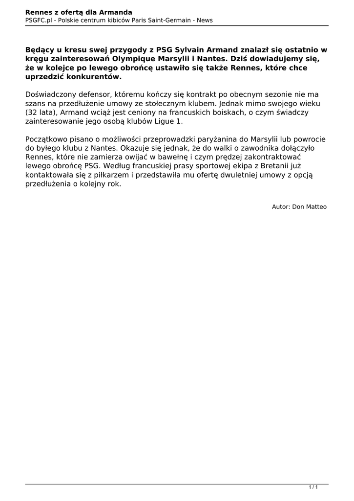 Rennes z ofertą dla Armanda PSGFC.pl - Polskie centrum kibiców Paris Saint-Germain - News Będący u kresu swej przygody z PSG Sylvain Armand znalazł się ostatnio w kręgu zainteresowań Olympique Marsylii i Nantes. Dziś dowiadujemy się, że w kolejce po lewego obrońcę ustawiło się także Rennes, które chce uprzedzić konkurentów. Doświadczony defensor, któremu kończy się kontrakt po obecnym sezonie nie ma szans na przedłużenie umowy ze stołecznym klubem. Jednak mimo swojego wieku (32 lata), Armand wciąż jest ceniony na francuskich boiskach, o czym świadczy zainteresowanie jego osobą klubów Ligue 1. Początkowo pisano o możliwości przeprowadzki paryżanina do Marsylii lub powrocie do byłego klubu z Nantes. Okazuje się jednak, że do walki o zawodnika dołączyło Rennes, które nie zamierza owijać w bawełnę i czym prędzej zakontraktować lewego obrońcę PSG. Według francuskiej prasy sportowej ekipa z Bretanii już kontaktowała się z piłkarzem i przedstawiła mu ofertę dwuletniej umowy z opcją przedłużenia o kolejny rok. Autor: Don Matteo 1/1 Powered by TCPDF (www.tcpdf.org)