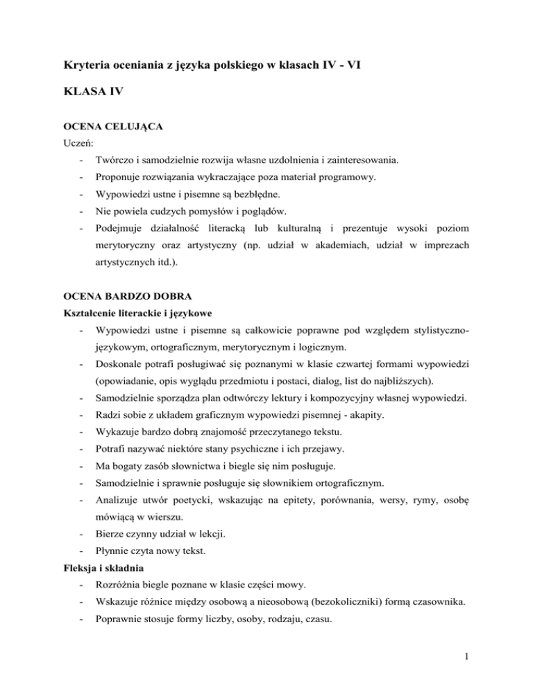 Kryteria oceniania z języka polskiego w klasach IV - VI KLASA IV OCENA CELUJĄCA Uczeń: - Twórczo i samodzielnie rozwija własne uzdolnienia i zainteresowania. - Proponuje rozwiązania wykraczające poza materiał programowy. - Wypowiedzi ustne i pisemne są bezbłędne. - Nie powiela cudzych pomysłów i poglądów. - Podejmuje działalność literacką lub kulturalną i prezentuje wysoki poziom merytoryczny oraz artystyczny (np. udział w akademiach, udział w imprezach artystycznych itd.). OCENA BARDZO DOBRA Kształcenie literackie i językowe - Wypowiedzi ustne i pisemne są całkowicie poprawne pod względem stylistycznojęzykowym, ortograficznym, merytorycznym i logicznym. - Doskonale potrafi posługiwać się poznanymi w klasie czwartej formami wypowiedzi (opowiadanie, opis wyglądu przedmiotu i postaci, dialog, list do najbliższych). - Samodzielnie sporządza plan odtwórczy lektury i kompozycyjny własnej wypowiedzi. - Radzi sobie z układem graficznym wypowiedzi pisemnej - akapity. - Wykazuje bardzo dobrą znajomość przeczytanego tekstu. - Potrafi nazywać niektóre stany psychiczne i ich przejawy. - Ma bogaty zasób słownictwa i biegle się nim posługuje. - Samodzielnie i sprawnie posługuje się słownikiem ortograficznym. - Analizuje utwór poetycki, wskazując na epitety, porównania, wersy, rymy, osobę mówiącą w wierszu. - Bierze czynny udział w lekcji. - Płynnie czyta nowy tekst. Fleksja i składnia - Rozróżnia biegle poznane w klasie części mowy. - Wskazuje różnice między osobową a nieosobową (bezokoliczniki) formą czasownika. - Poprawnie stosuje formy liczby, osoby, rodzaju, czasu. 1 - Biegle odmienia rzeczowniki przez przypadki i poprawnie stosuje je w zdaniach, oddziela temat od końcówki. - Odmienia przymiotniki i zauważa zależność form przymiotnika od określanego rzeczownika. - Potrafi zbudować zdanie z podanych związków wyrazowych. Fonetyka - Odróżnia głoskę od litery, spółgłoskę od samogłoski. - Określa spółgłoski. - Zna zasady akcentowania w języku polskim i poprawnie akcentuje. OCENA DOBRA Kształcenie literackie i językowe - Czyta poprawnie, stosują zasady prawidłowego przestankowania. - Jego wypowiedzi ustne i pisemne mogą zawierać jedynie nieliczne błędy językowostylistyczne, logiczne i ortograficzne. - W wypowiedziach próbuje oceniać zachowania bohaterów literackich oraz formułuje ogólne wnioski o utworach. - Poprawnie sporządza plan ramowy. - Potrafi posługiwać się słownikiem ortograficznym. - Potrafi wskazać w wierszu epitet, porównanie, rymy, wersy, strofy. Fleksja i składnia - Rozróżnia części mowy poznane w klasie IV. - Poprawnie odmienia (stosuje w zdaniach) czasowniki i rzeczowniki. Fonetyka - Rozróżnia głoskę, literę, samogłoskę, spółgłoskę. - Określa spółgłoski. - Poprawnie dzieli wyrazy na sylaby. OCENA DOSTATECZNA Kształcenie literackie i językowe - W wypowiedziach ustnych i pisemnych na ogół przestrzega zasad poprawnościowych w zakresie budowy zdań, precyzyjnego stosowania poznanego słownictwa i ortografii. - Przy małej pomocy nauczyciela wypowiada się w szkolnych formach pisemnych. - Umie wymienić elementy świata przedstawionego. 2 - Wskazuje epitety, porównania, wersy, strofy, rymy. - Odróżnia postacie i wydarzenia realistyczne od fantastycznych. Fleksja i składnia - Tworzy bezokoliczniki od czasowników w formie osobowej i odwrotnie. - Odróżnia przyimek od innych części mowy. - Odmienia rzeczownik przez przypadki. - Odmienia czasowniki przez osoby, liczby, czasy, rodzaje. Fonetyka - Rozróżnia głoski, litery. - Przy małej pomocy nauczyciela określa spółgłoski. - Dzieli wyrazy na sylaby. OCENA DOPUSZCZAJĄCA Uczeń samodzielnie lub przy pomocy nauczyciela wykonuje zadania o niewielkim stopniu trudności. - Technika cichego i głośnego czytania pozwala na zrozumienie tekstu. - Błędy językowe, stylistyczne, logiczne i ortograficzne popełniane w wypowiedziach pisemnych nie przekreślają wartości pracy i wysiłku, jaki uczeń włożył w ich napisanie. - Przy pomocy nauczyciela rozróżnia części mowy i wskazuje w tekście przyimek. - Odmienia rzeczowniki przypadki. - Wskazuje podmiot i orzeczenie. - Odmienia czasowniki przez osoby, liczby, czasy i rodzaje. - Wyróżnia głoski, litery i sylaby. - Zna podstawowe zasady ortograficzne. OCENA NIEDOSTATECZNA Uczeń nie opanował podstawowych wiadomości z fleksji, składni, słownictwa, ortografii w zakresie redagowania poznanych form wypowiedzi. - Nie opanował techniki głośnego i cichego czytania. - Wypowiedzi nie są poprawne pod względem językowym i rzeczowym. - W wypowiedziach pisemnych nie przestrzega reguł ortograficznych. - Nawet przy pomocy nauczyciela nie jest w stanie rozwiązać zagadnienia o elementarnym stopniu trudności. 3 KLASA V OCENĘ CELUJĄCĄ otrzymuje uczeń, który: - Twórczo rozwija własne uzdolnienia i zainteresowania. - Proponuje rozwiązania oryginalne i wykraczające poza materiał programowy. - Formułuje bezbłędne wypowiedzi ustne i pisemne. - Nie powiela cudzych poglądów, potrafi krytycznie ustosunkować się do językowej, literackiej i kulturalnej rzeczywistości. - Podejmuje działalność literacką lub kulturalną w różnych formach (np. udział w akademiach, inscenizacje teatralne, współpraca ze szkolną gazetką, itd.), prezentuje wysoki poziom merytoryczny oraz artystyczny. OCENĘ BARDZO DOBRĄ Kształcenie literackie i językowe - Wypowiedzi ustne i pisemne ucznia są całkowicie poprawne pod względem stylistyczno-językowym, ortograficznym, merytorycznym i logicznym. - Doskonale potrafi posługiwać się poznanymi w klasie piątej formami wypowiedzi (sprawozdanie z wycieczki, spaceru, opis przedmiotu, wyglądu człowieka z elementami charakterystyki, list prywatny, zaproszenie). - Samodzielnie sporządza notatki z czytanych lektur. - Bezbłędnie układa plan odtwórczy lektury, plan kompozycyjny własnej wypowiedzi. - Bardzo 