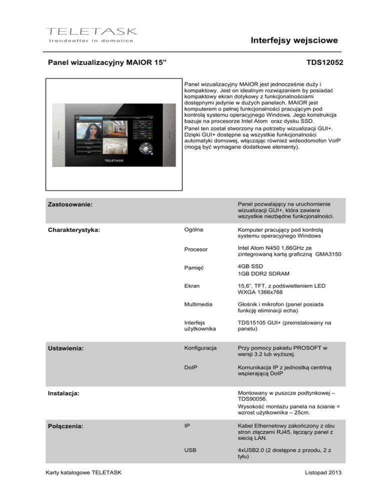 Interfejsy wejsciowe Panel wizualizacyjny MAIOR 15” TDS12052 Panel wizualizacyjny MAIOR jest jednocześnie duży i kompaktowy. Jest on idealnym rozwiązaniem by posiadać kompaktowy ekran dotykowy z funkcjonalnościami dostępnymi jedynie w dużych panelach. MAIOR jest komputerem o pełnej funkcjonalności pracującym pod kontrolą systemu operacyjnego Windows. Jego konstrukcja bazuje na procesorze Intel Atom oraz dysku SSD. Panel ten został stworzony na potrzeby wizualizacji GUI+. Dzięki GUI+ dostępne są wszystkie funkcjonalności automatyki domowej, włączając również wideodomofon VoIP (mogą być wymagane dodatkowe elementy). Panel pozwalający na uruchomienie wizualizacji GUI+, która zawiera wszystkie niezbędne funkcjonalności. Zastosowanie: Charakterystyka: Ustawienia: Ogólna Komputer pracujący pod kontrolą systemu operacyjnego Windows Procesor Intel Atom N450 1,66GHz ze zintegrowaną kartą graficzną GMA3150 Pamięć 4GB SSD 1GB DDR2 SDRAM Ekran 15,6”, TFT, z podświetleniem LED WXGA 1366x768 Multimedia Głośnik i mikrofon (panel posiada funkcję eliminacji echa) Interfejs użytkownika TDS15105 GUI+ (preinstalowany na panelu) Konfiguracja Przy pomocy pakietu PROSOFT w wersji 3.2 lub wyższej. DoIP Komunikacja IP z jednostką centrlną wspierającą DoIP Montowany w puszcze podtynkowej – TDS90056. Wysokość montażu panela na ścianie = wzrost użytkownika – 25cm. Instalacja: Połączenia: Karty katalogowe TELETASK IP Kabel Ethernetowy zakończony z obu stron złączami RJ45, łączący panel z siecią LAN. USB 4xUSB2.0 (2 dostępne z przodu, 2 z tyłu) Listopad 2013 Interfejsy wejsciowe Zasilanie Max. 25W Zużycie energii: Wymiary: Waga netto | brutto: Parametry pracy: 100-230V AC; 50Hz lub 60Hz Panel + płyta czołowa 510 szer. x 306 wys. x 80 gr Puszka podtynkowa 492 szer. x 288 wys. x 80 gr Panel + płyta czołowa 6,2 kg |7,9 kg Puszka podtynkowa 3 kg |3,5 kg Temperatura 0ºC - 30ºC Wilgotność 5% - 80% przy 25ºC (bez kondensacji) Ochrona IP: IP20 Zawartość opakowania: TDS12052 MAIOR 15” + płyta czołowa TDS15105 licencja GUI+ (preinstalowana) Schemat połączeń: Karty katalogowe TELETASK Listopad 2013