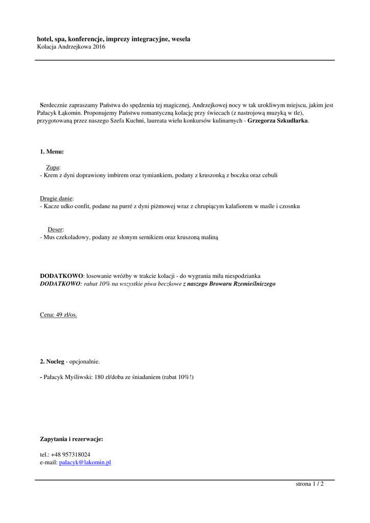hotel, spa, konferencje, imprezy integracyjne, wesela Kolacja Andrzejkowa 2016 Serdecznie zapraszamy Państwa do spędzenia tej magicznej, Andrzejkowej nocy w tak urokliwym miejscu, jakim jest Pałacyk Łąkomin. Proponujemy Państwu romantyczną kolację przy świecach (z nastrojową muzyką w tle), przygotowaną przez naszego Szefa Kuchni, laureata wielu konkursów kulinarnych - Grzegorza Szkudlarka. 1. Menu: Zupa: - Krem z dyni doprawiony imbirem oraz tymiankiem, podany z kruszonką z boczku oraz cebuli Drugie danie: - Kacze udko confit, podane na purré z dyni piżmowej wraz z chrupiącym kalafiorem w maśle i czosnku Deser: - Mus czekoladowy, podany ze słonym sernikiem oraz kruszoną maliną DODATKOWO: losowanie wróżby w trakcie kolacji - do wygrania miła niespodzianka DODATKOWO: rabat 10% na wszystkie piwa beczkowe z naszego Browaru Rzemieślniczego Cena: 49 zł/os. 2. Nocleg - opcjonalnie. - Pałacyk Myśliwski: 180 zł/doba ze śniadaniem (rabat 10%!) Zapytania i rezerwacje: tel.: +48 957318024 e-mail: [email protected] strona 1 / 2 hotel, spa, konferencje, imprezy integracyjne, wesela Kolacja Andrzejkowa 2016 Oferta dotyczy terminu 30.11.2016 r. strona 2 / 2