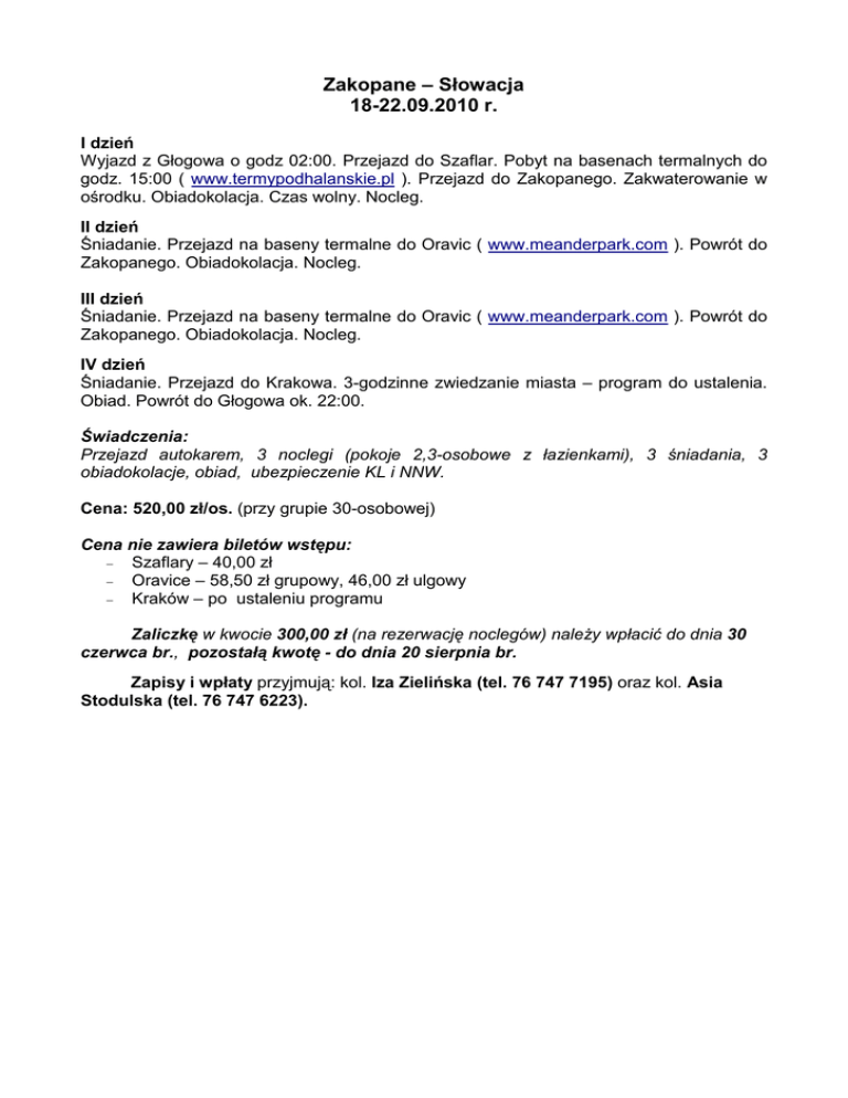 Zakopane – Słowacja 18-22.09.2010 r. I dzień Wyjazd z Głogowa o godz 02:00. Przejazd do Szaflar. Pobyt na basenach termalnych do godz. 15:00 ( www.termypodhalanskie.pl ). Przejazd do Zakopanego. Zakwaterowanie w ośrodku. Obiadokolacja. Czas wolny. Nocleg. II dzień Śniadanie. Przejazd na baseny termalne do Oravic ( www.meanderpark.com ). Powrót do Zakopanego. Obiadokolacja. Nocleg. III dzień Śniadanie. Przejazd na baseny termalne do Oravic ( www.meanderpark.com ). Powrót do Zakopanego. Obiadokolacja. Nocleg. IV dzień Śniadanie. Przejazd do Krakowa. 3-godzinne zwiedzanie miasta – program do ustalenia. Obiad. Powrót do Głogowa ok. 22:00. Świadczenia: Przejazd autokarem, 3 noclegi (pokoje 2,3-osobowe z łazienkami), 3 śniadania, 3 obiadokolacje, obiad, ubezpieczenie KL i NNW. Cena: 520,00 zł/os. (przy grupie 30-osobowej) Cena nie zawiera biletów wstępu: − Szaflary – 40,00 zł − Oravice – 58,50 zł grupowy, 46,00 zł ulgowy − Kraków – po ustaleniu programu Zaliczkę w kwocie 300,00 zł (na rezerwację noclegów) naleŜy wpłacić do dnia 30 czerwca br., pozostałą kwotę - do dnia 20 sierpnia br. Zapisy i wpłaty przyjmują: kol. Iza Zielińska (tel. 76 747 7195) oraz kol. Asia Stodulska (tel. 76 747 6223).